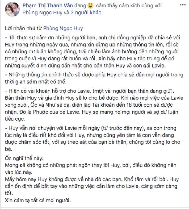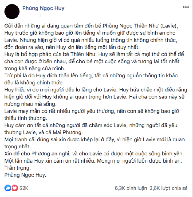 “Gửi đến những ai đang quan tâm đến bé Phùng Ngọc Thiên Như (Lavie). Huy trước giờ không bao giờ lên tiếng vì muốn giữ được sự bình an cho Lavie. Nhưng hiện giờ vì có quá nhiều luồng thông tin không chính thức, đồn đoán ra vào, nên Huy xin lên tiếng một lần duy nhất.