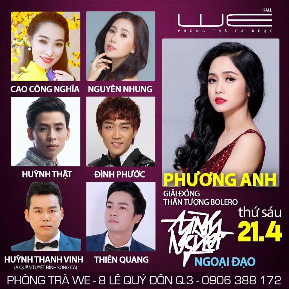 Cùng với việc ra mắt Album mới, sắp tới đây vào đêm 21/4, Phương Anh sẽ tổ chức 1 minishow Tình người ngoại đạo kỷ niệm 1 năm tham gia chương trình Thần tượng Bolero tại phòng trà WE. Đây sẽ là cuộc hội ngộ của hàng loạt những thí sinh mùa đầu tiên như Cao Công Nghĩa, Đình Phước, Thanh Vinh, Huỳnh Thật,… Chia sẻ về sự vắng mặt của Trung Quang, Phương Anh cho biết anh chàng hiện đang bận đi lưu diễn nên không thể góp mặt trong đêm minishow này. Tuy nhiên, cô nàng cũng hy vọng đêm diễn sẽ được diễn ra suôn sẻ và may mắn trong thời gian sắp tới.