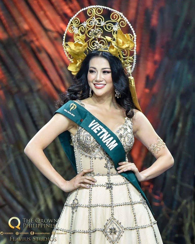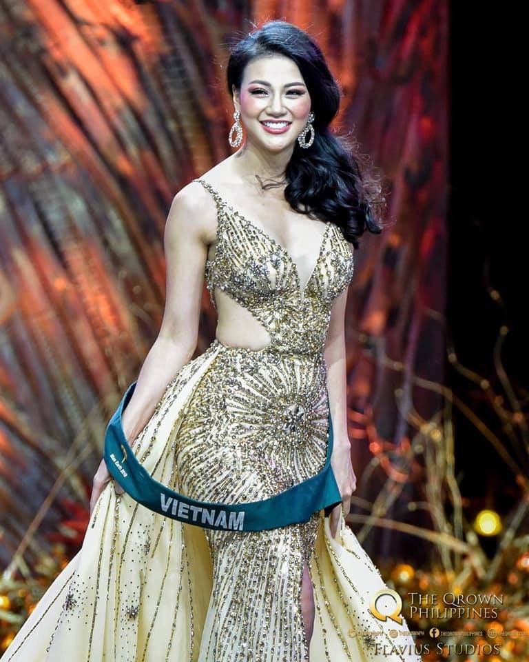 Màn chào sân cũng nhuốm đầy màu vàng rực rỡ. Đặc biệt cái mấn mà Phương Khánh được đội trên đầu cũng là màu vàng. Có thể nói đây là gam màu báo hiệu điềm lành cho đại diện Việt Nam giải tỏa cơn khát vương miện.