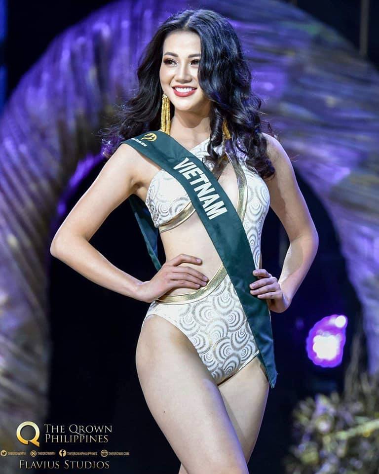 Trang phục bikini Phương Khánh diện cũng là màu vàng ánh kim bắt mắt. Chưa kể đôi bông tay dáng dài cũng theo chân cô đi vào phần thi này… lại là màu vàng.