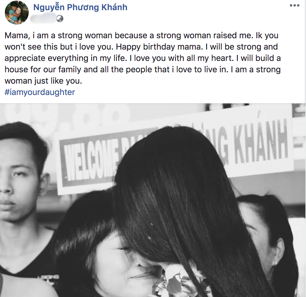 Mới đây trên trang cá nhân của mình, Hoa hậu Phương Khánh đã đăng tải bức ảnh chụp cùng mẹ với dòng trạng thái: “Mẹ ơi, con là một phụ nữ mạnh mẽ vì được nuôi lớn bởi một phụ nữ kiên cường. Con biết mẹ sẽ không nhìn thấy những dòng chữ này nhưng con yêu mẹ. Chúc mẹ sinh nhật vui vẻ. Con sẽ luôn mạnh mẽ và trân trọng mọi thứ trong đời. Con yêu người bằng cả trái tim. Con sẽ xây dựng một ngôi nhà cho gia đình chúng ta cùng tất cả những người con yêu thương. Con là một phụ nữ mạnh mẽ như mẹ vậy“.