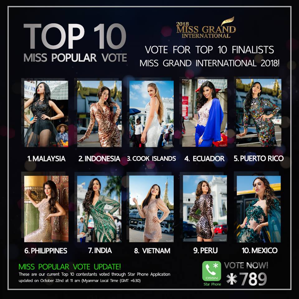 Có 3 thí sinh rời khỏi Top 10 bình chọn Miss Popular Vote là Colombia, Venezuela và Cambodia. Thay vào đó, thí sinh đến từ các nước Ấn Độ, Philippines và Indonesia có sự vươn lên về số vote để “chen chân” vào Top 10 trong giai đoạn nước rút.