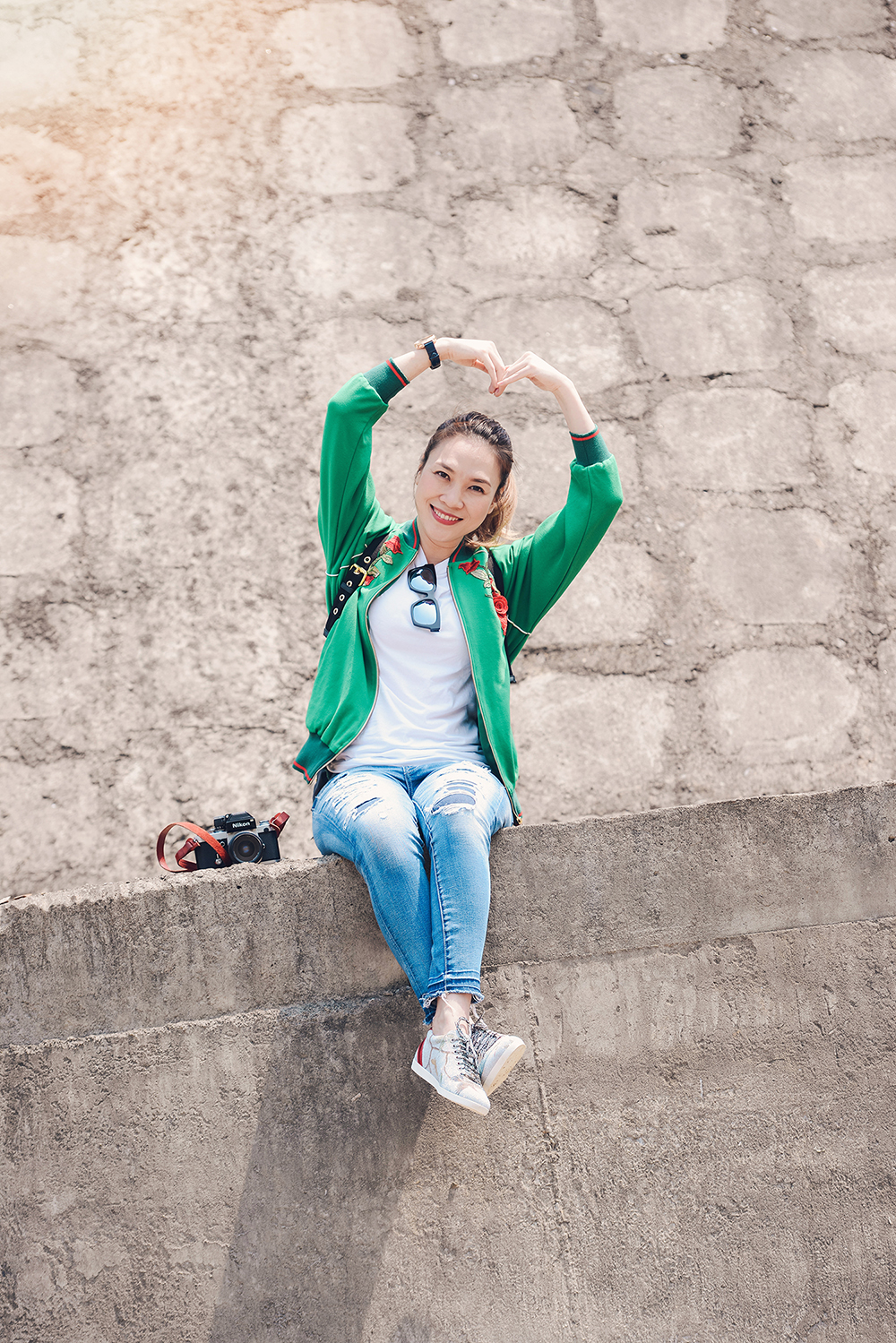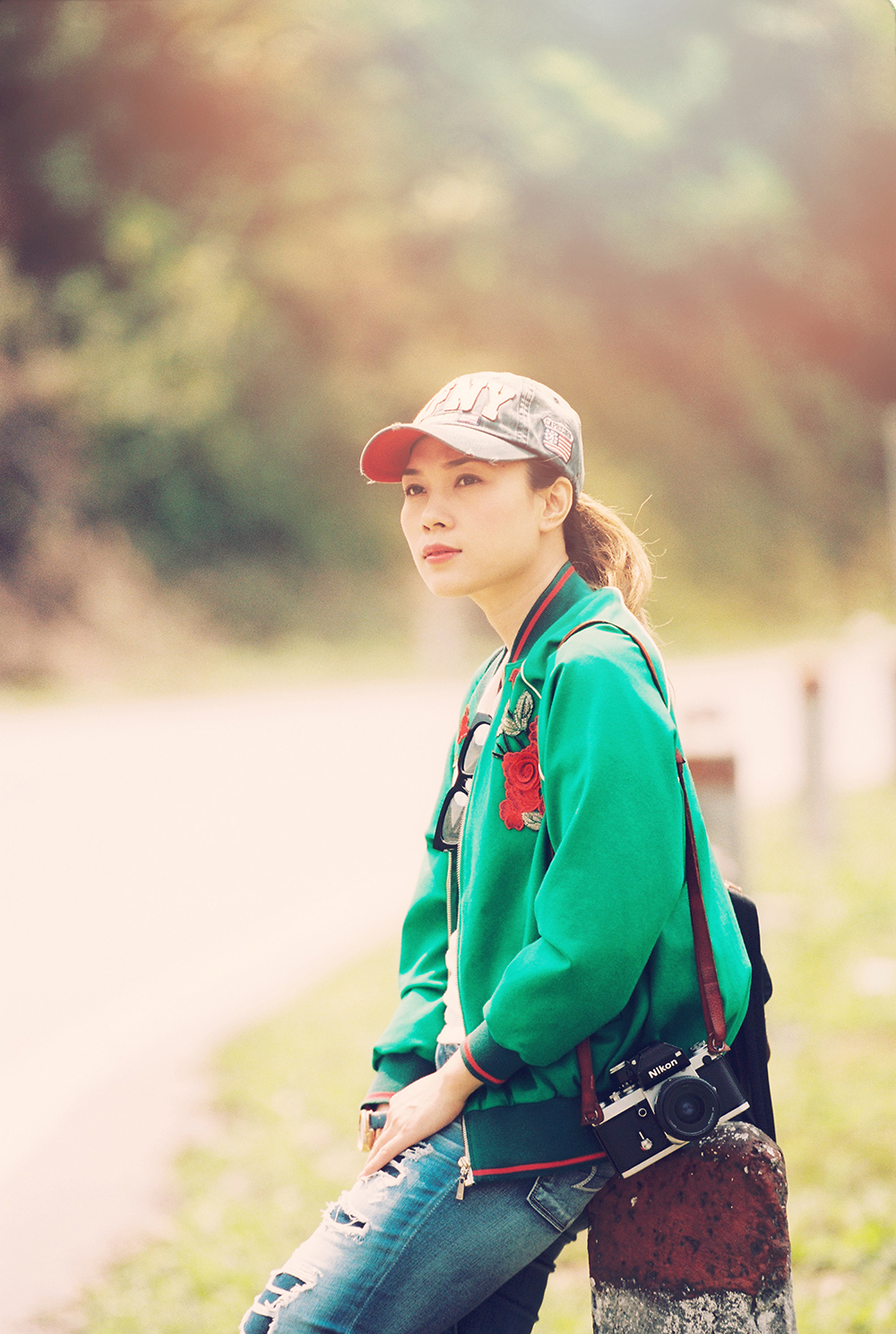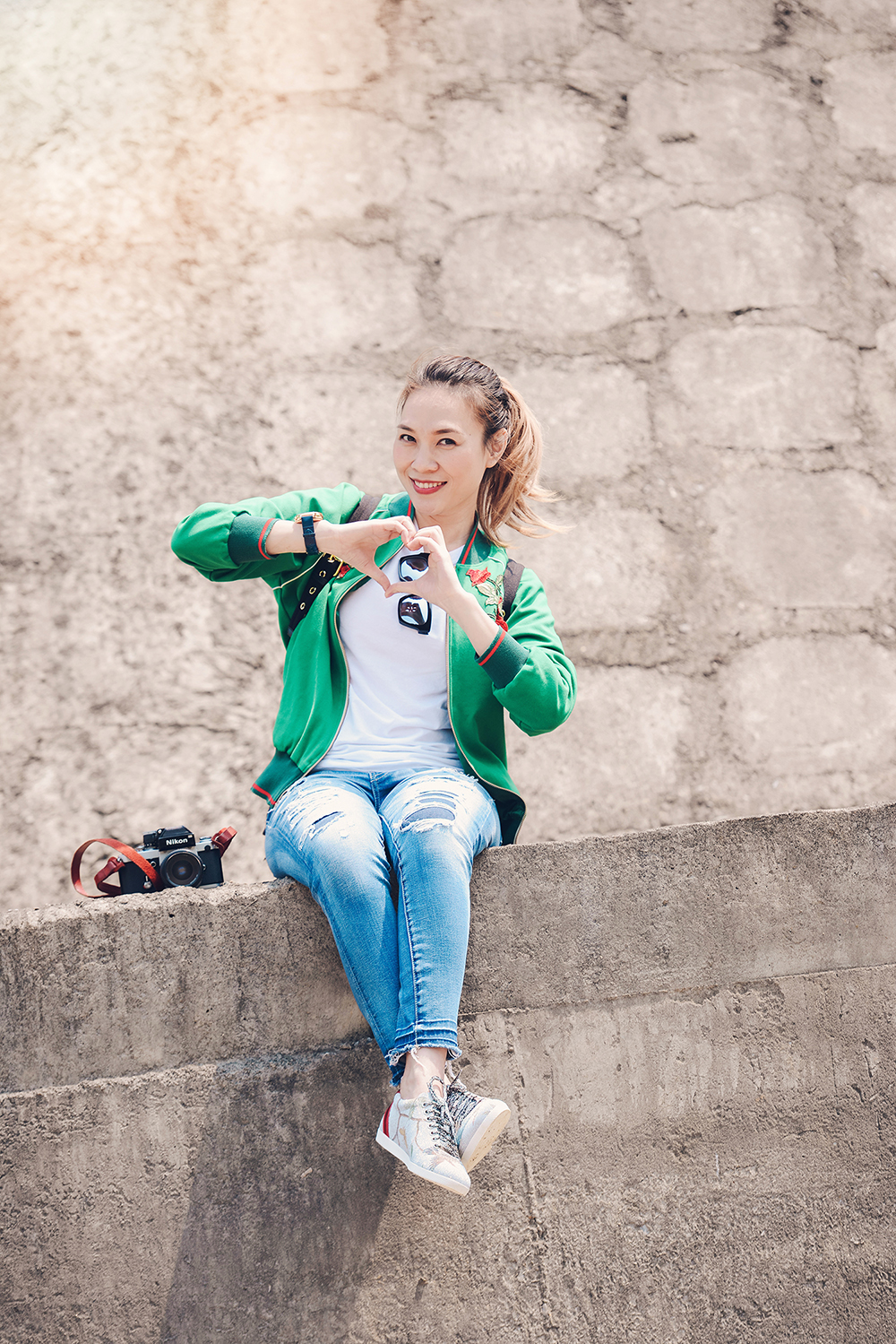 Diện áo thun quần jeans rách cá tính kết hợp với áo khoác bomber, nữ ca sĩ đến thăm những nơi nổi tiếng từng được giới trẻ yêu thích.