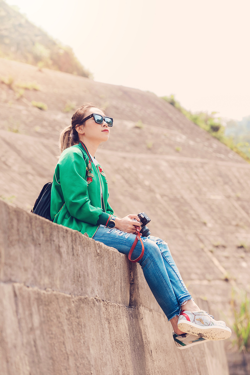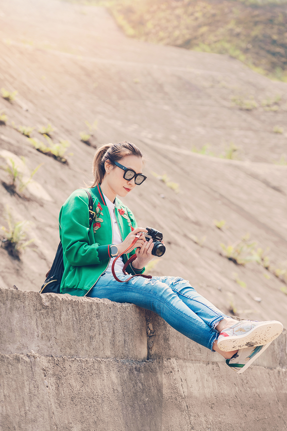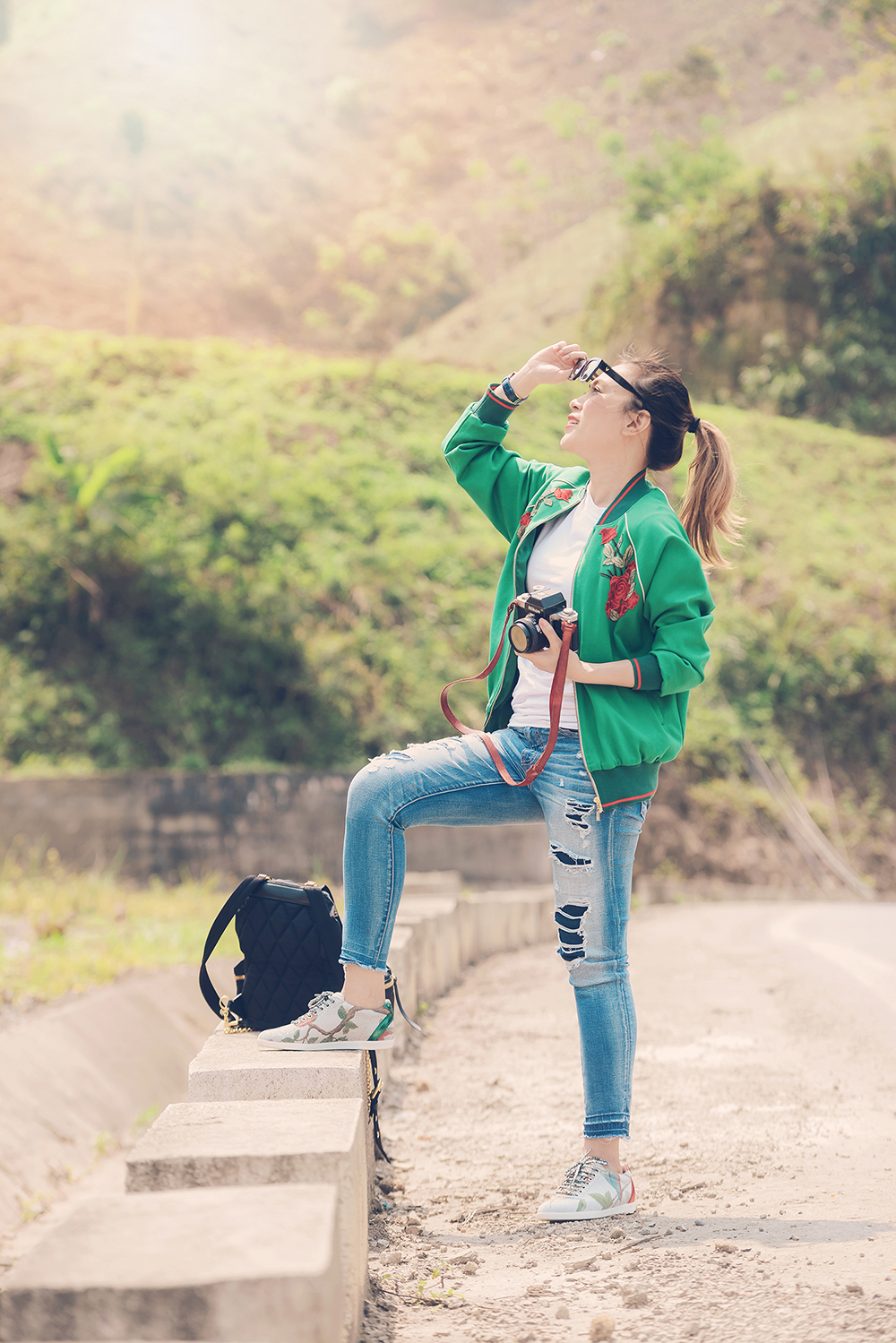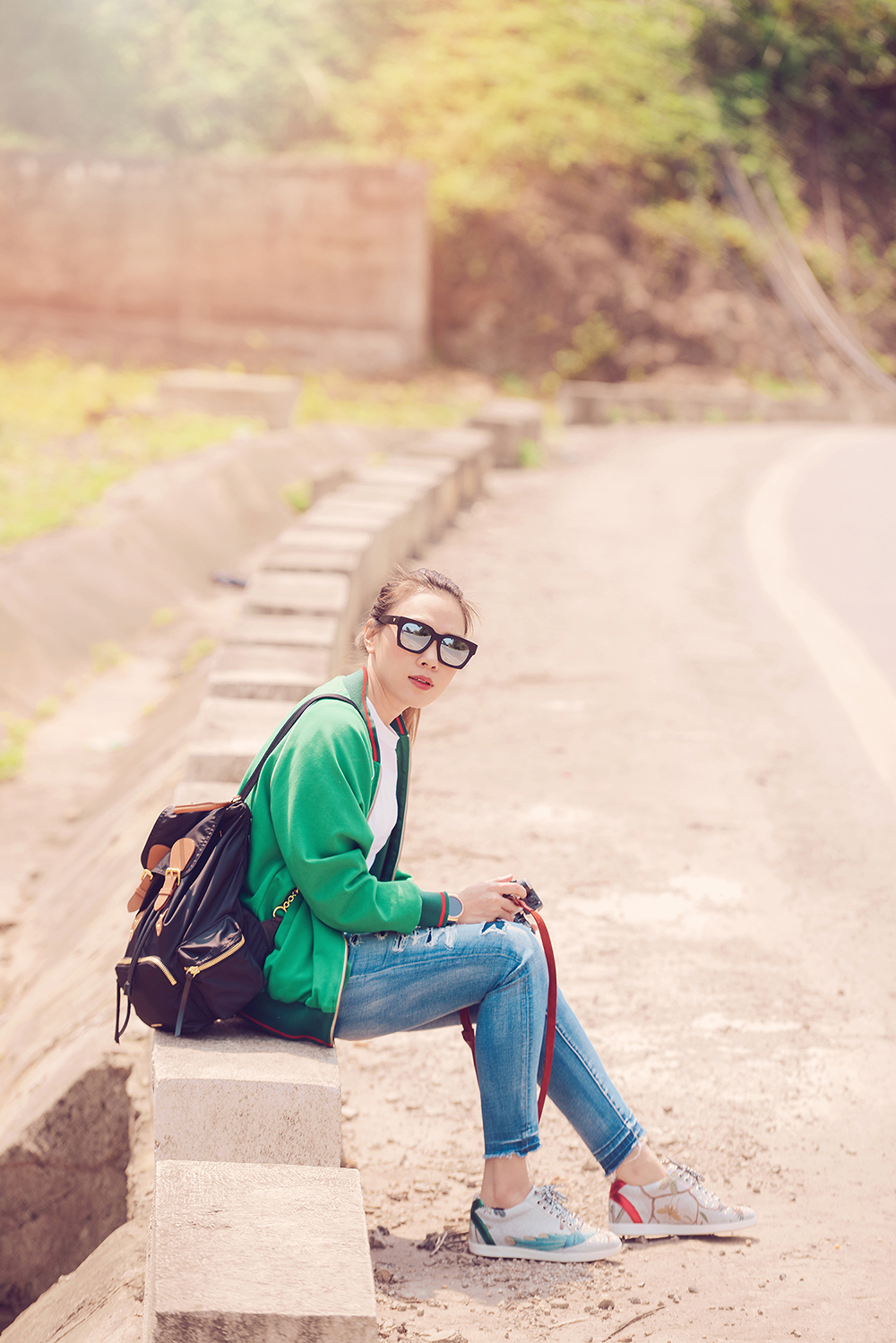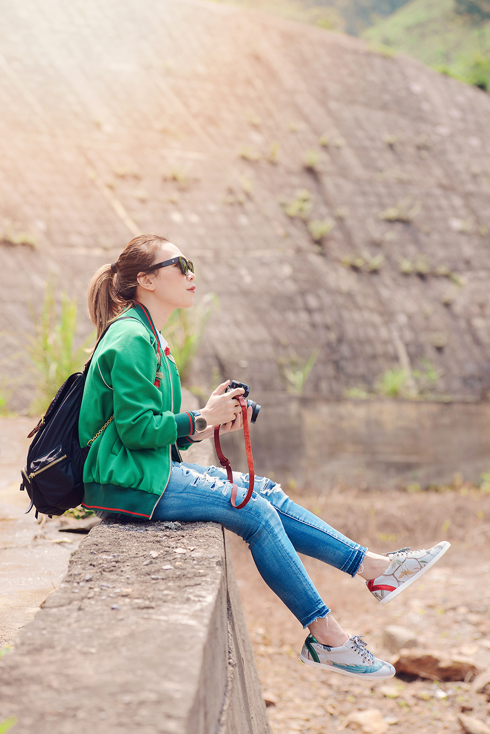 Ngoài ra, kính mát đen cùng giày sneaker hoạ tiết nổi bật cũng giúp cô khoe vẻ trẻ trung giữa thiên nhiên.