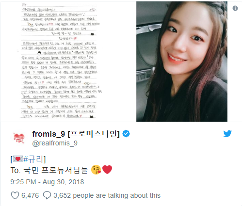 Mặc dù rất được mọi người yêu mến thế nhưng Jang Gyu Ri của Stone Music Entertainment vẫn bị rớt khỏi top 20, mới đây trước thềm chung kết cô đã đăng một bức thư viết tay cho người hâm mộ của mình trên tài khoản Twitter chính thức của nhóm fromis9.