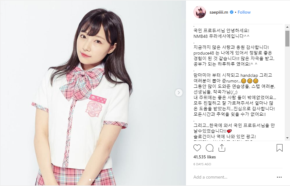 Mặc dù Murase Sae của PD48 đã kết thúc ở đây, tôi sẽ tiếp tục làm việc rất, rất chăm chỉ trong tương lai, và tôi muốn trở lại Hàn Quốc và đứng trước bạn một lần nữa! Làm ơn, làm ơn, đừng quên Murase Sae!