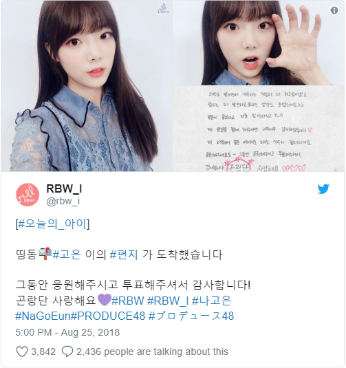 “Xin chào, đây là thực tập sinh của RBW - Na Go Eun! Tôi đã viết thư này vì tôi muốn cảm ơn các nhà sản xuất quốc dân !!