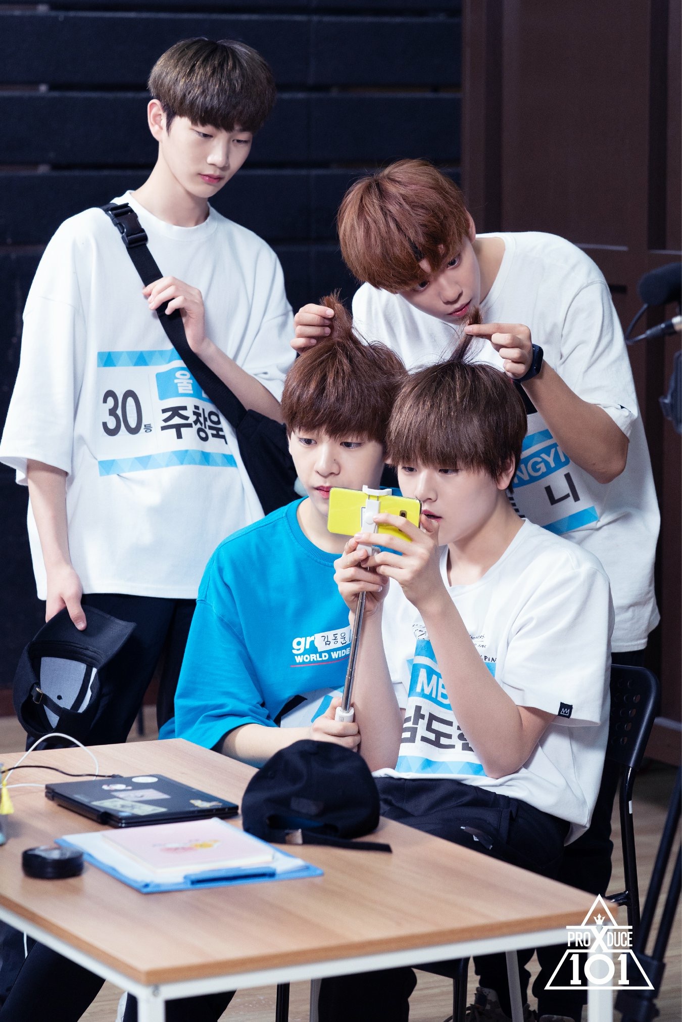 Tony mải nghịch tóc của Nam Do Hyun và Kim Dong Yoon. Trong khi, Joo Chang Wook đang nhìn vào chiếc điện thoại của Do Hyun.