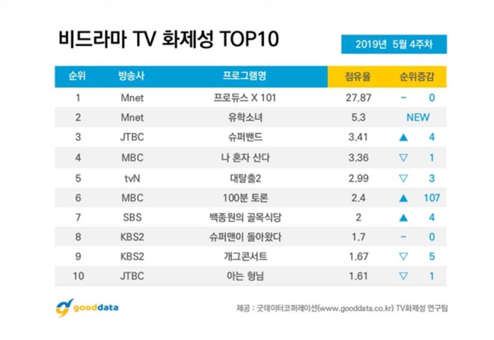 Vào ngày 28/05, Good Data Corporation đã công bố bảng xếp hạng các chương trình truyền hình và nghệ sĩ gây được nhiều tiếng vang, thu hút được sự chú ý từ công chúng từ ngày 20 đến ngày 26/05. Kết quả được thu thập dựa trên các bài báo trực tuyến, bài đăng trên blog, diễn đàn cộng đồng, phương tiện truyền thông xã hội và lượt xem trên các video của 181 chương trình truyền hình hiện đang phát sóng hoặc dự kiến phát sóng.
