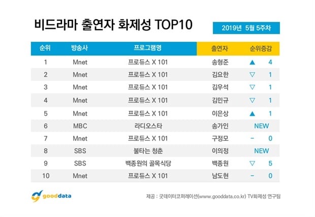 Trong đó, chương trình Produce X 101 đã đứng đầu danh sách trong 5 tuần liên tiếp với 27% tổng chỉ số truyền thông. Mặt khác, các thực tập sinh của Produce X 101 một lần nữa thống trị vị trí đầu trong hạng mục ngôi sao nổi tiếng. Đáng chú ý hơn khi, thực tập sinh Song Hyeong Jun vượt qua nhiều đối thủ nặng ký như Kim Yo Han, Kim Woo Seok và Kim Min Kyu để giành vị trí quán quân.