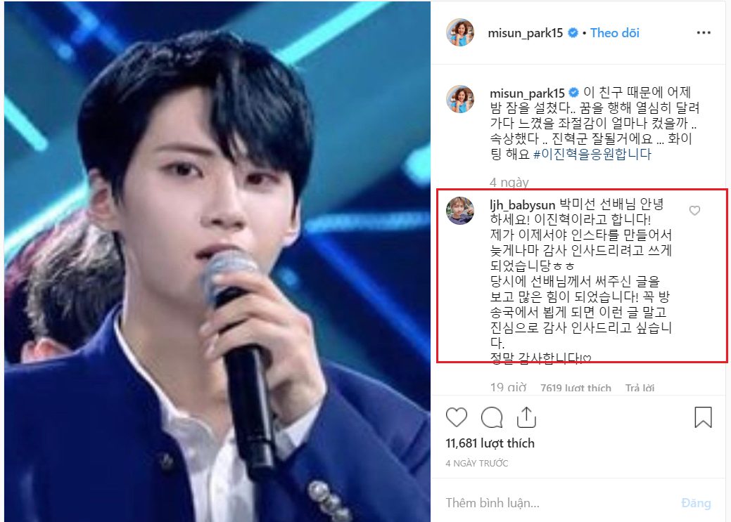 Sau khi Lee Jin Hyuk tự tạo tài khoản Instagram vào ngày 22/07, cậu ấy đã phản hồi trong phần bình luận của nữ diễn viên. Lee Jin Hyuk nói: “Xin chào tiền bối Park Mi Sun! Em là Lee Jin Hyuk đây ạ! Em đang viết bức thư này để bày tỏ lòng cảm ơn muộn màng vì bây giờ em mới tạo tài khoản Instagram.