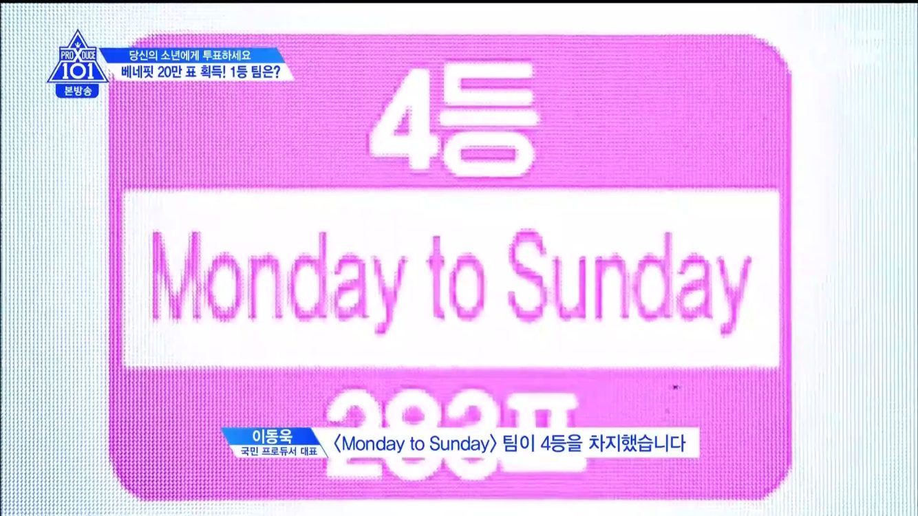Nhóm Monday to Sunday đứng hạng 4 với 283 phiếu. Nam Do Hyun giành vị trí đầu trong nhóm khi mang về 110 lượt bình chọn. Tiếp đến, vị trí thứ ba có 395 phiếu bầu là Pretty Girl. Song Hyung Jun đứng nhất trong bảng xếp hạng nhóm với 101 phiếu.