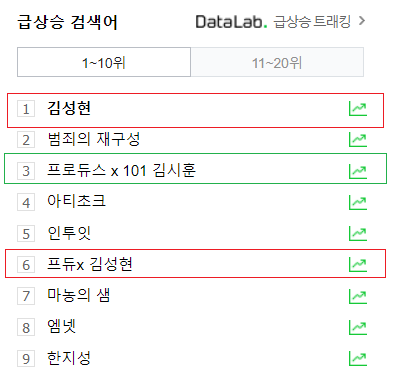 Từ khóa “Kim Sung Hyun”, “Produce X Kim Sung Hyun” ở hạng 1 và 6. Trong khi “Produce X 101 Kim Shi Hoon” ở hạng 3 trên Naver.