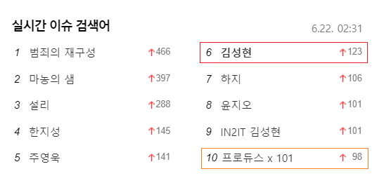 Từ khóa “Kim Seung Hyun” đứng hạng 6 và “Produce X 101” ở hạng 10 trên Nate.