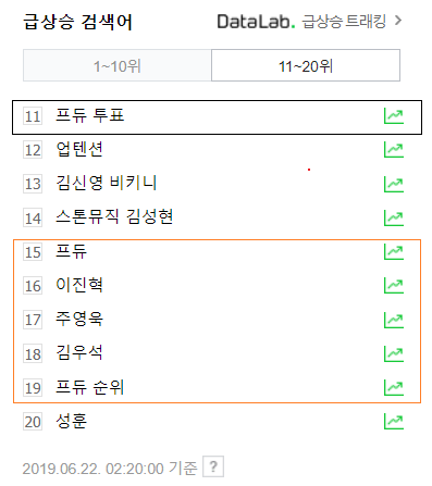 Từ khóa “Bình chọn Produce” hạng 11, “Stone Music Ent Kim Sung Hyun” ở hạng 14. Từ 15 đến 19 lần lượt thuộc về “Produce”, “Lee Jin Hyuk”, “Kim Woo Seok” và “Xếp hạng Produce”.
