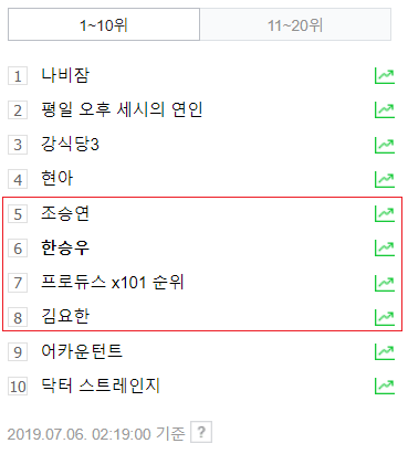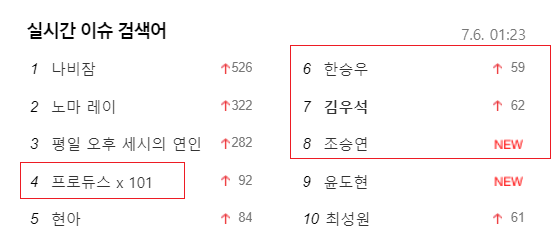 Từ khóa “Cho Seung Yeon”, “Han Seung Woo”, “Xếp hạng Produce X 101” và Kim Yo Han ở hạng 5 đến 8 trên Naver.