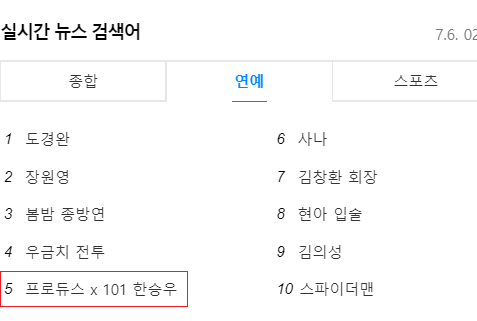 Từ khóa “Produce X 101 Han Seung Woo” đứng hạng 5 trong mục tin tức giải trí của Hàn Quốc.