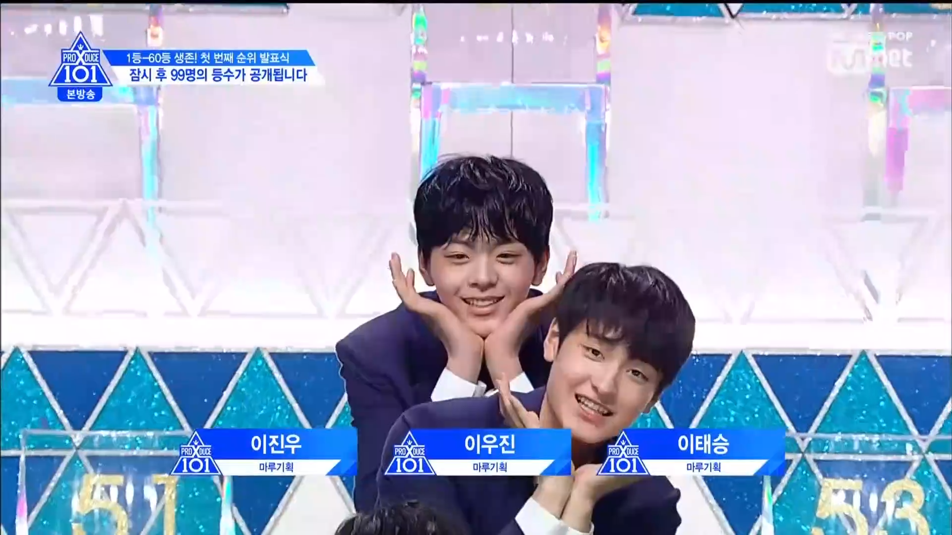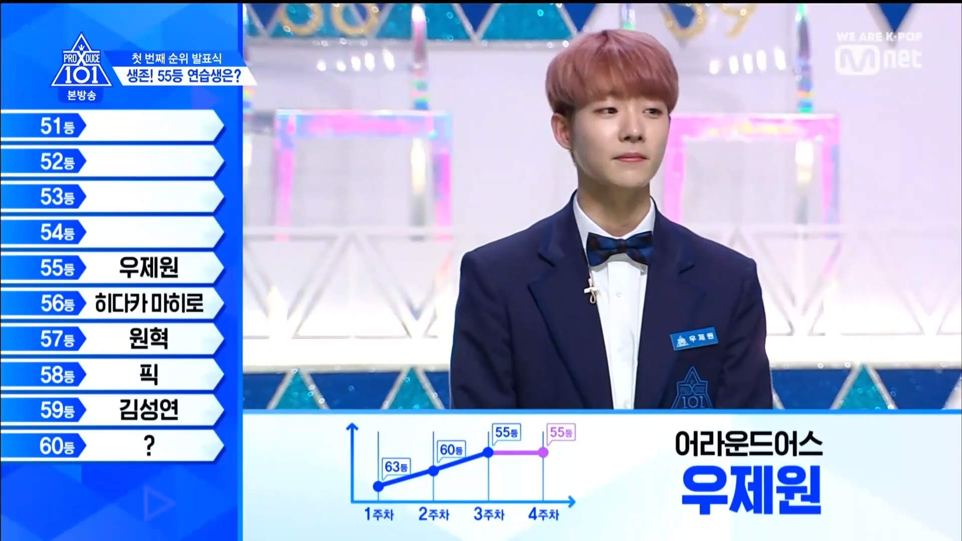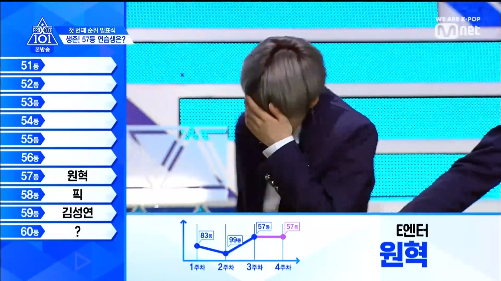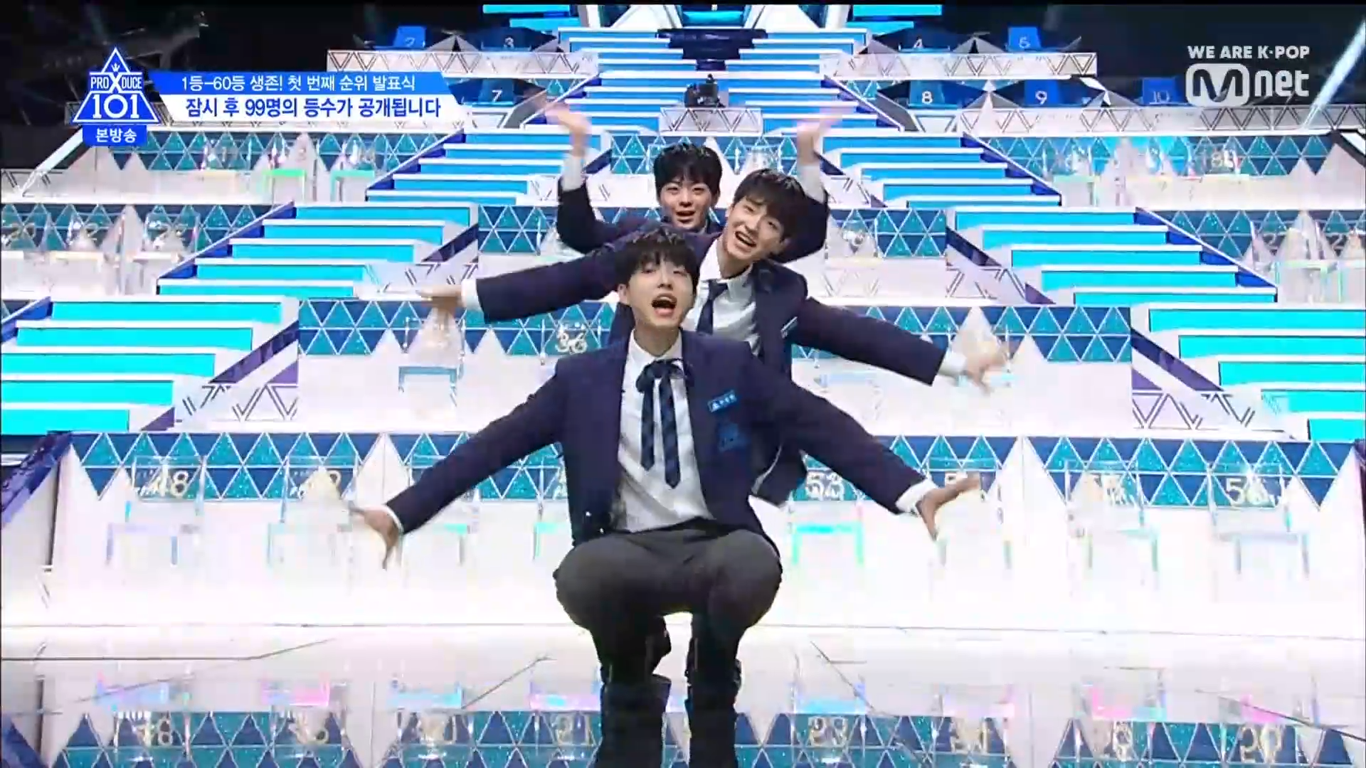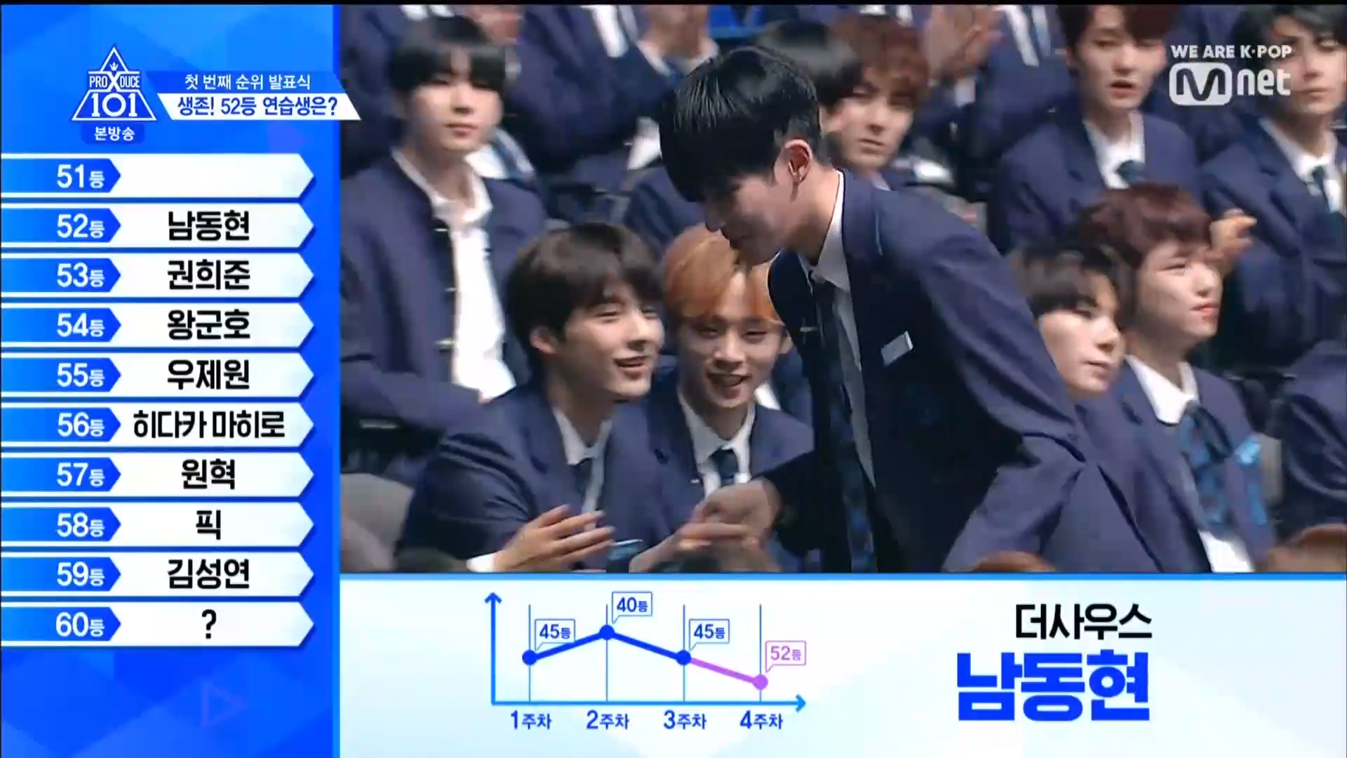 Thời khắc hồi hộp nhất chính thức bắt đầu. Hạng 59 sẽ được công bố đầu tiên. Kim Seong Yeon đã được gọi tên, là TTS đầu tiên được an toàn đi tiếp. WonHyuk hạng 57. Giữ nguyên hạng so với tuần trước. Trước đây TTS này từng xếp hạng 99. Mahiro từ YG hạng 56. Woo Je Won hạng 55 đến từ Around Us. YG Wang Kunho hạng 54. Kwon He Jun TTS lớp X hạng 53. Em trai Nam Tae Hyun - Nam Dong Hyun hạng 52.