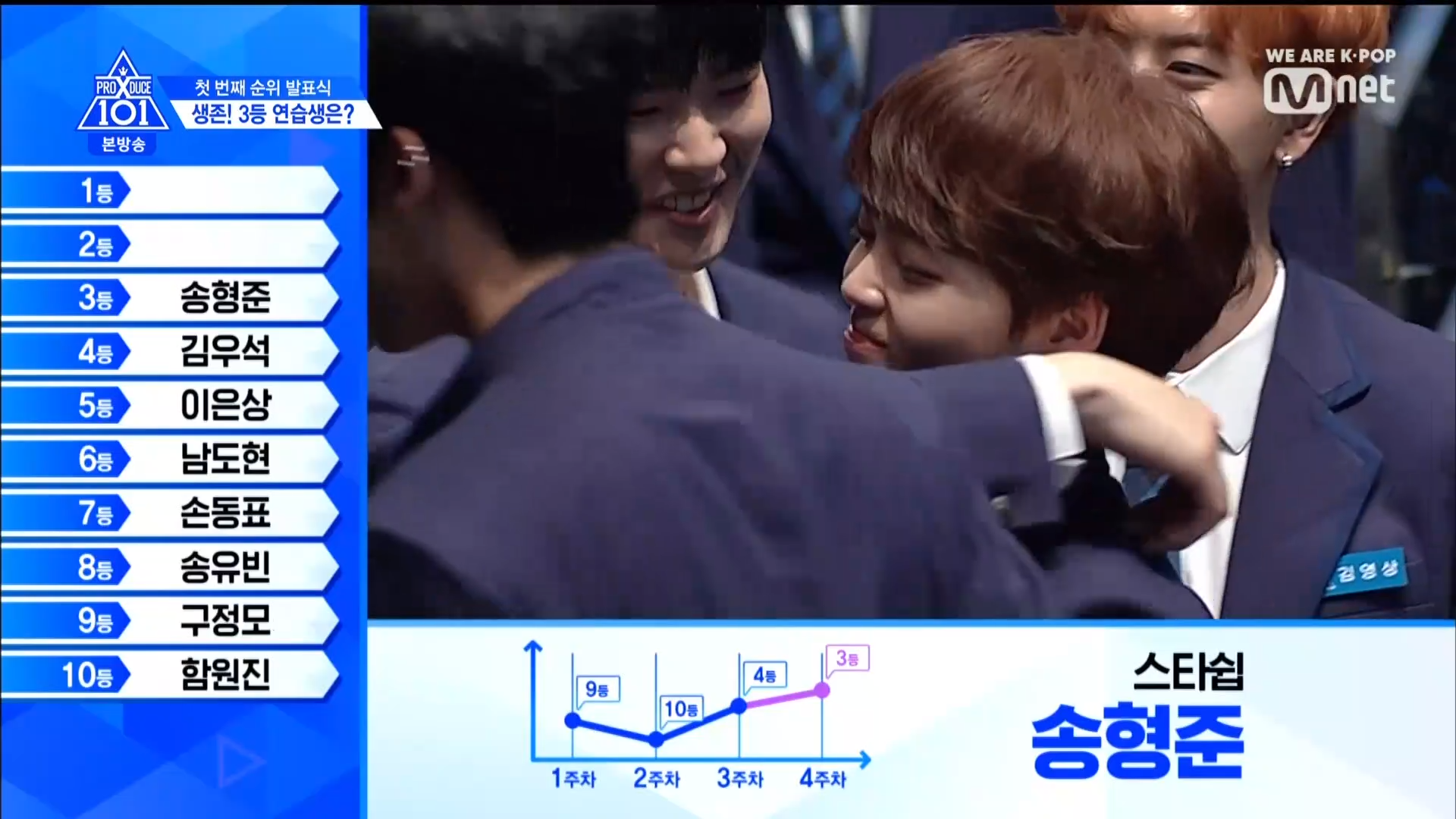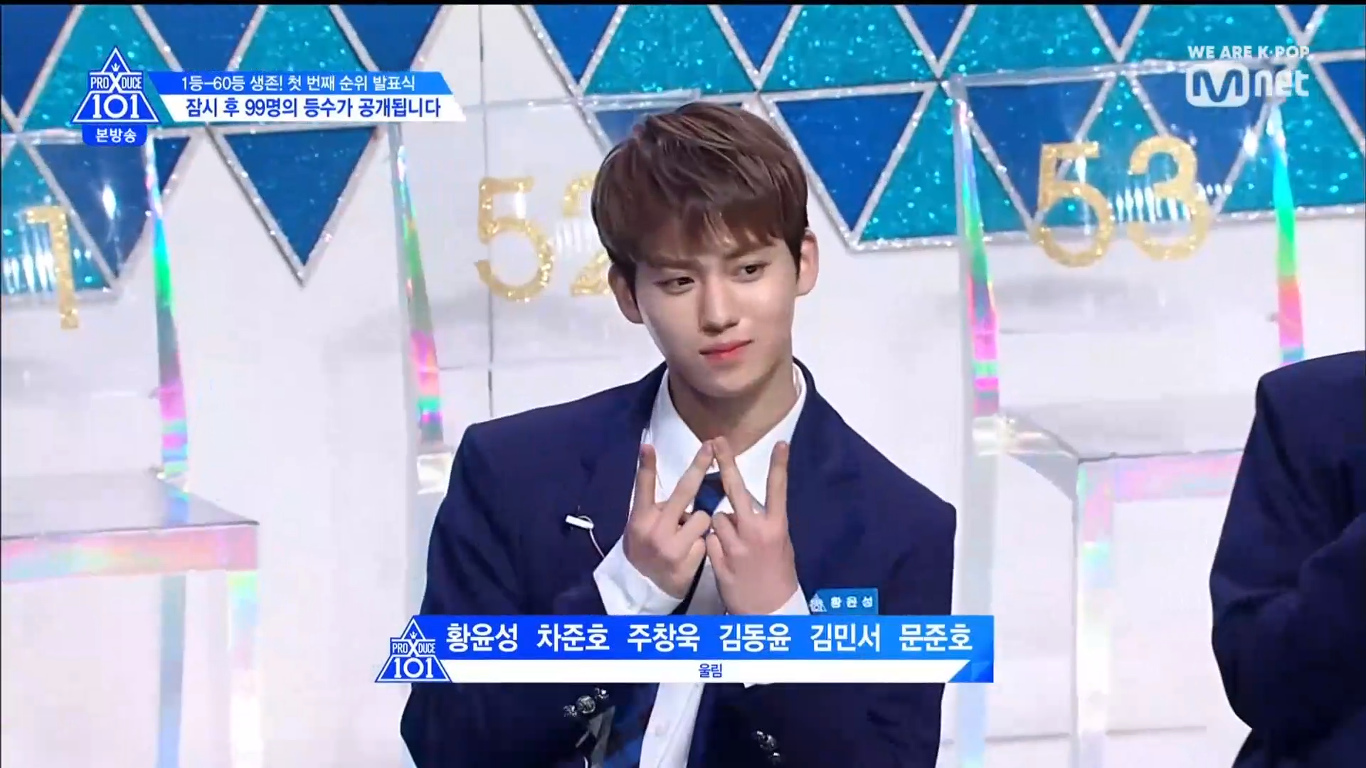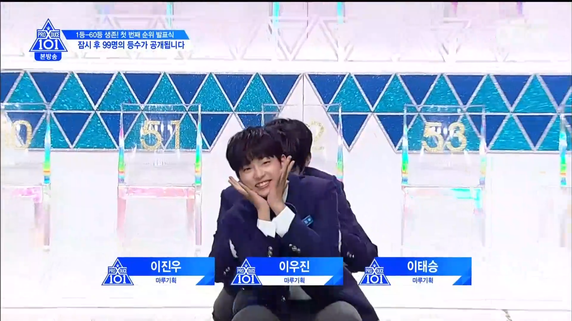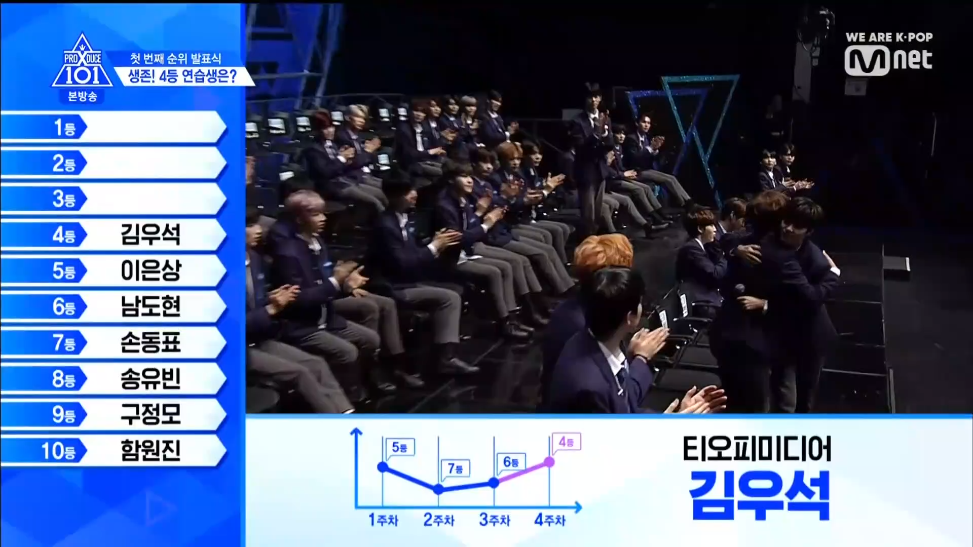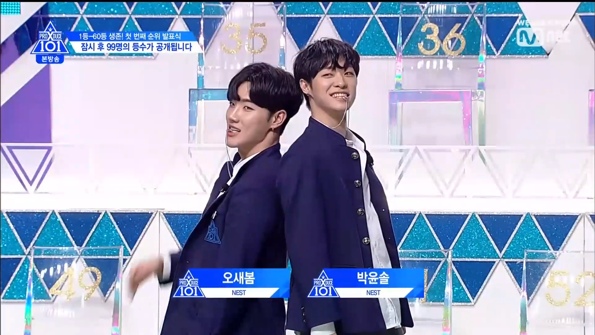 Thời khắc hồi hộp nhất chính thức bắt đầu. Hạng 59 sẽ được công bố đầu tiên. Kim Seong Yeon đã được gọi tên, là TTS đầu tiên được an toàn đi tiếp. WonHyuk hạng 57. Giữ nguyên hạng so với tuần trước. Trước đây TTS này từng xếp hạng 99. Mahiro từ YG hạng 56. Woo Je Won hạng 55 đến từ Around Us. YG Wang Kunho hạng 54. Kwon He Jun TTS lớp X hạng 53. Em trai Nam Tae Hyun - Nam Dong Hyun hạng 52.