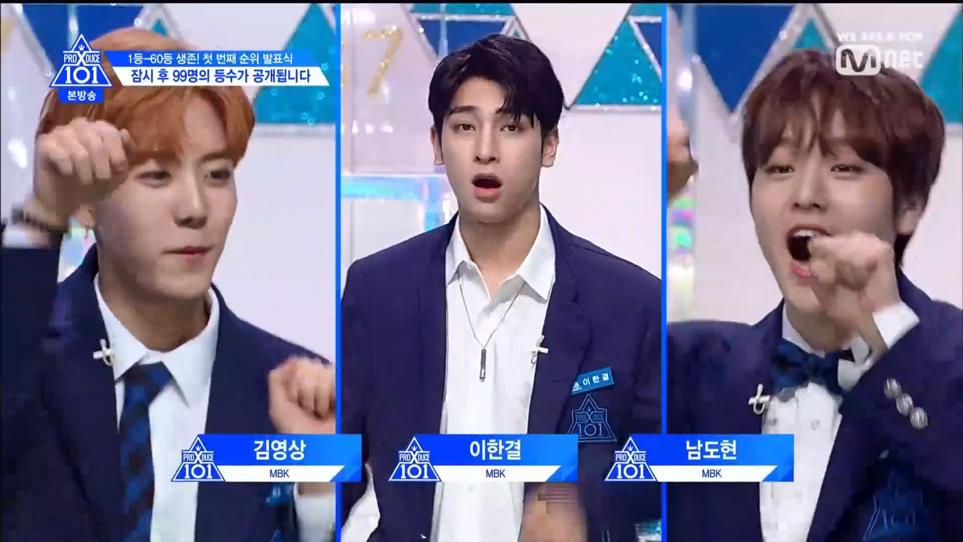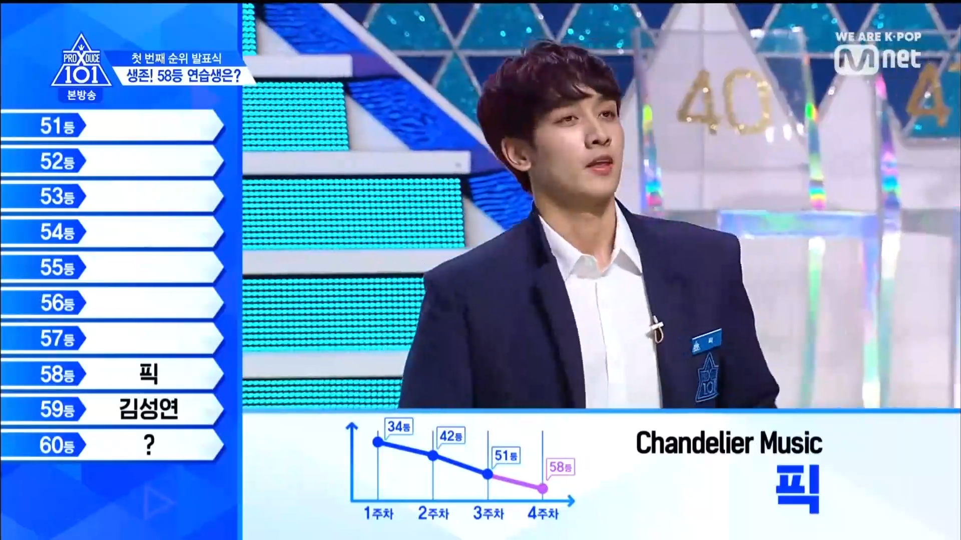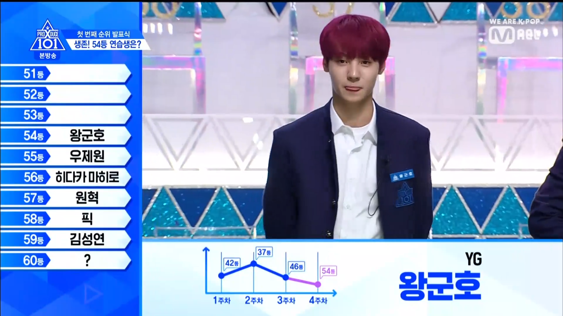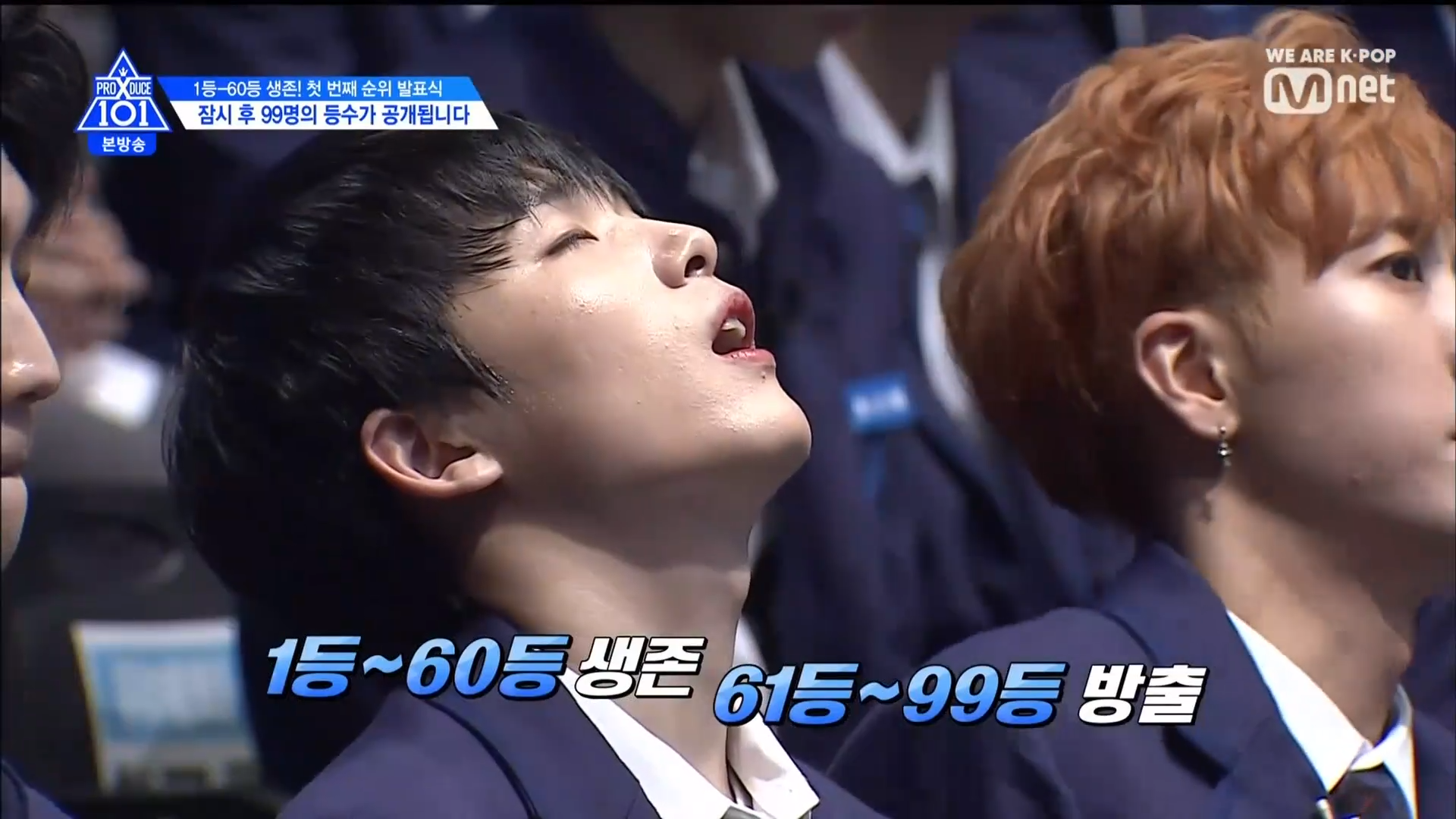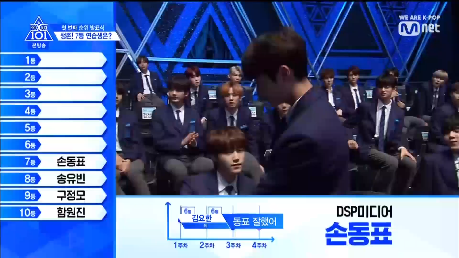 Thời khắc hồi hộp nhất chính thức bắt đầu. Hạng 59 sẽ được công bố đầu tiên. Kim Seong Yeon đã được gọi tên, là TTS đầu tiên được an toàn đi tiếp. WonHyuk hạng 57. Giữ nguyên hạng so với tuần trước. Trước đây TTS này từng xếp hạng 99. Mahiro từ YG hạng 56. Woo Je Won hạng 55 đến từ Around Us. YG Wang Kunho hạng 54. Kwon He Jun TTS lớp X hạng 53. Em trai Nam Tae Hyun - Nam Dong Hyun hạng 52.