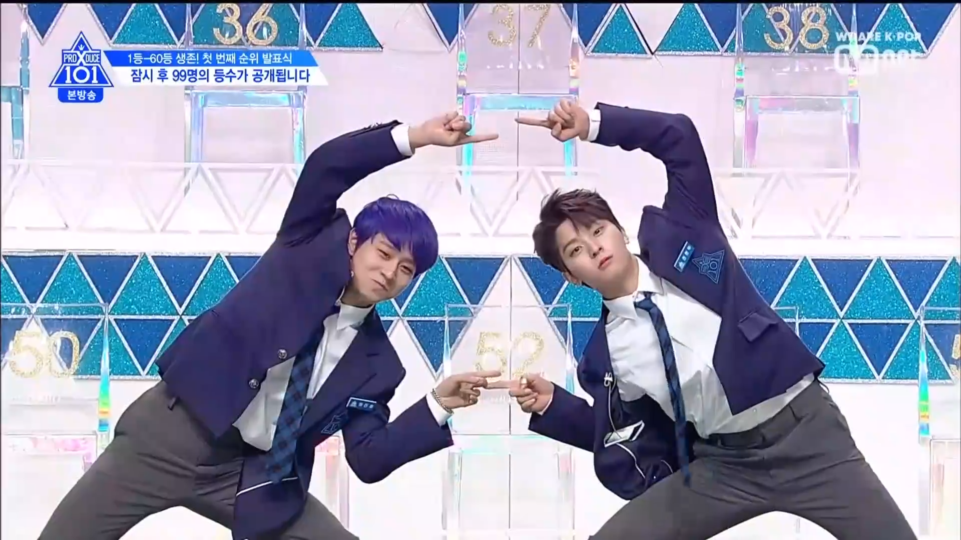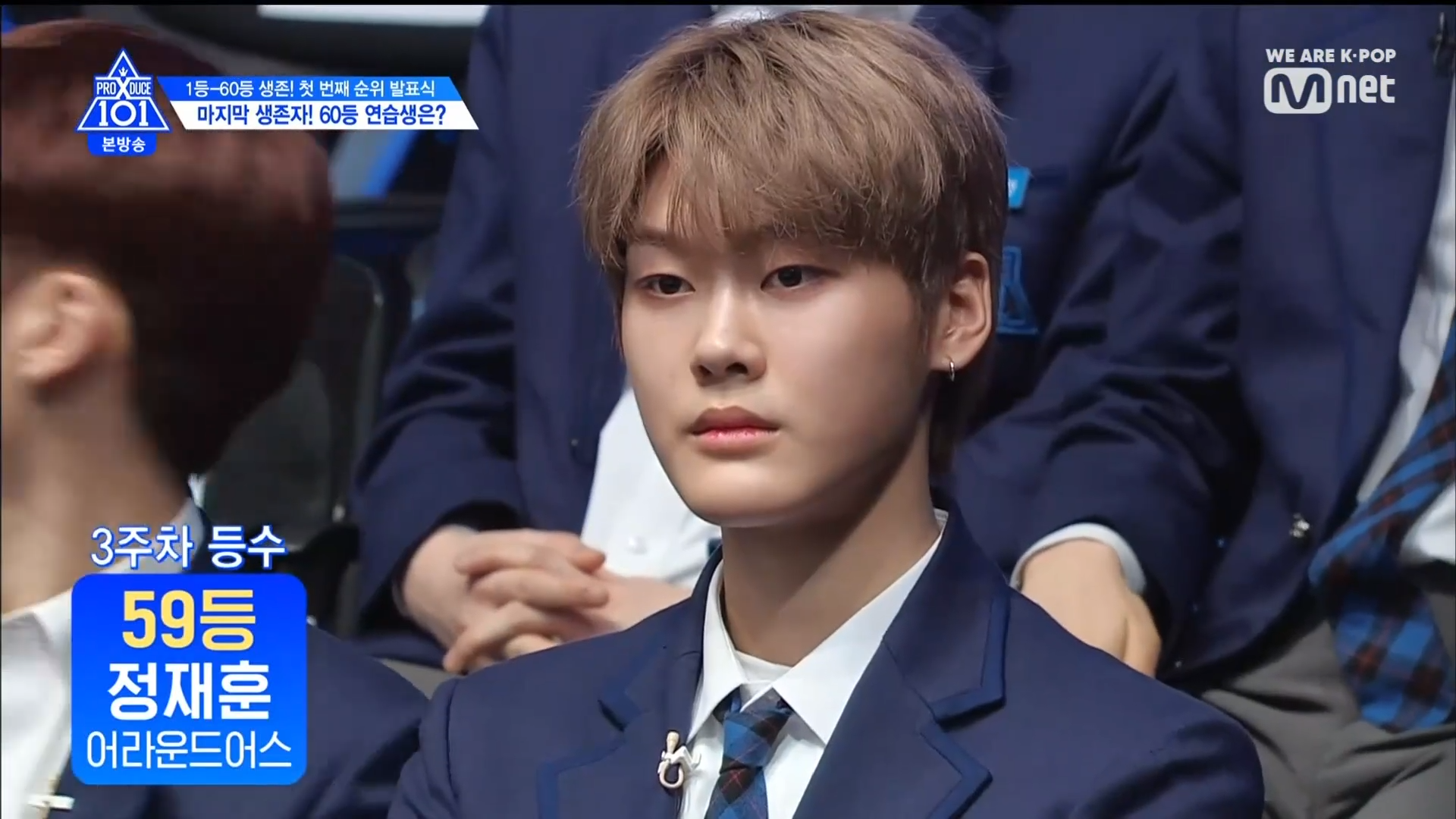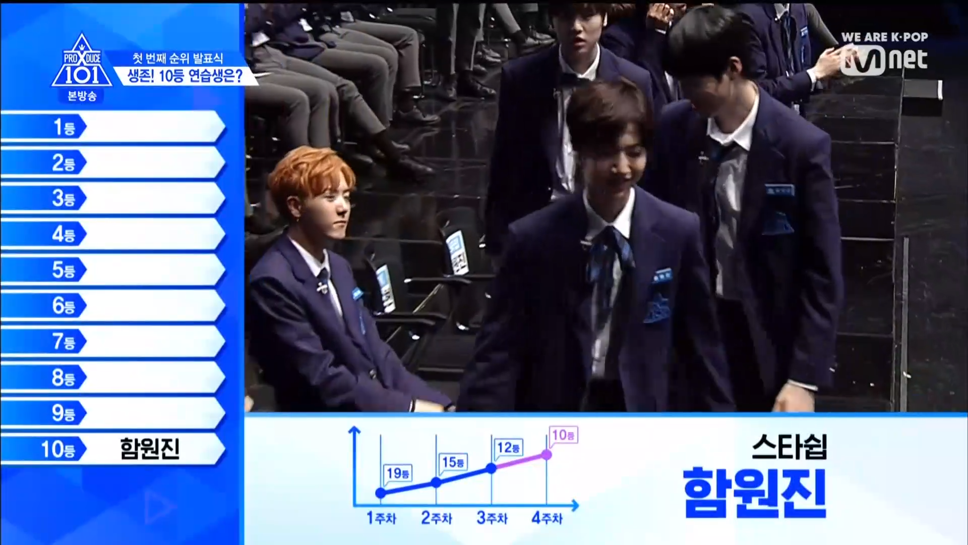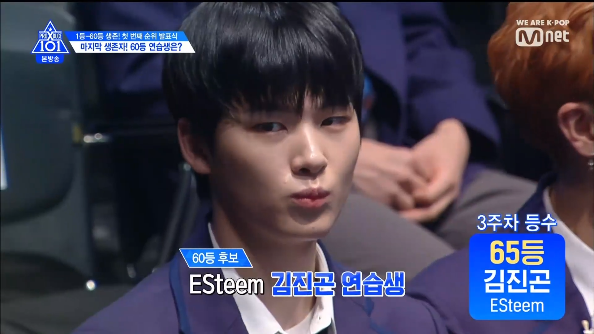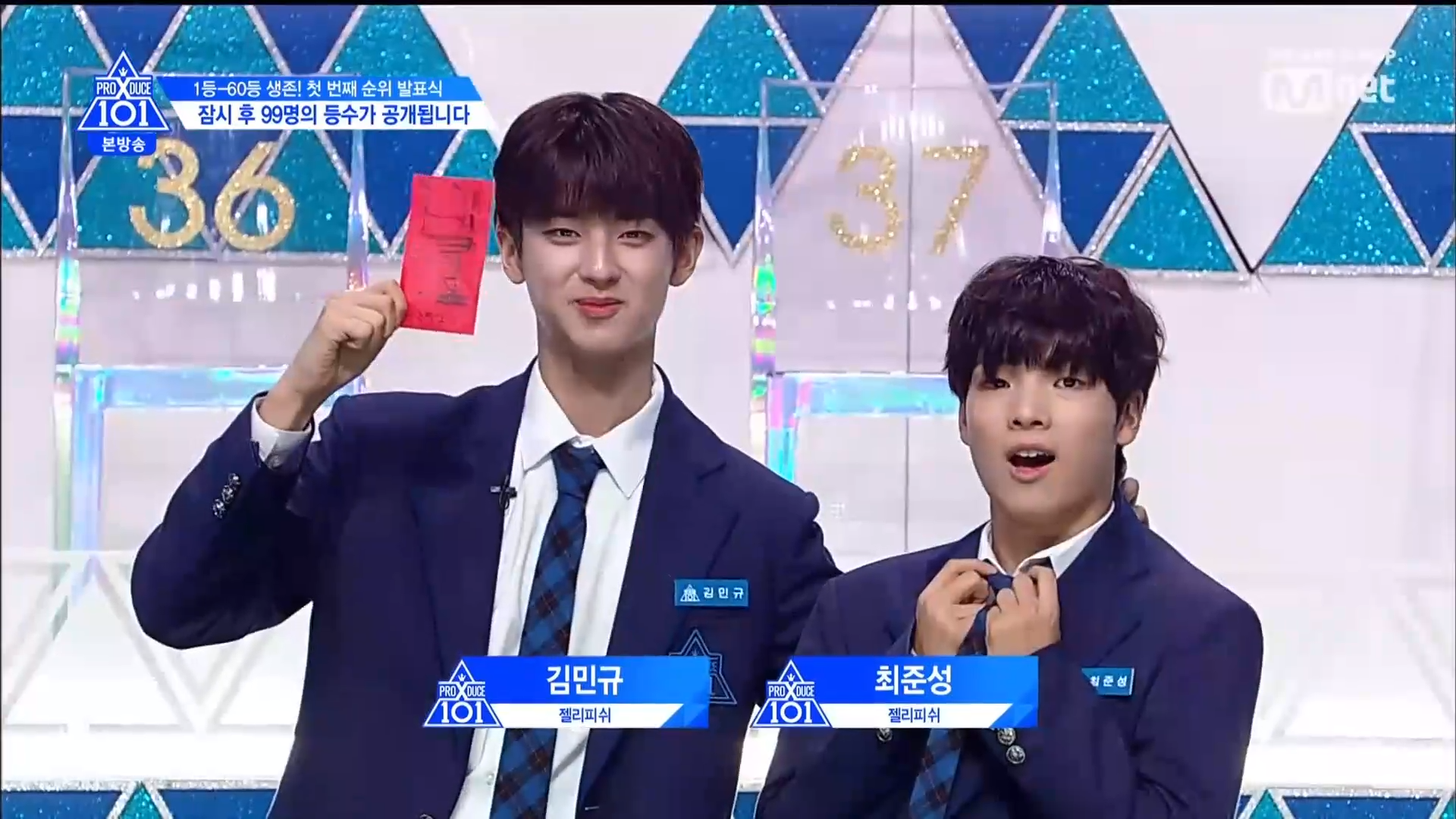 Thời khắc hồi hộp nhất chính thức bắt đầu. Hạng 59 sẽ được công bố đầu tiên. Kim Seong Yeon đã được gọi tên, là TTS đầu tiên được an toàn đi tiếp. WonHyuk hạng 57. Giữ nguyên hạng so với tuần trước. Trước đây TTS này từng xếp hạng 99. Mahiro từ YG hạng 56. Woo Je Won hạng 55 đến từ Around Us. YG Wang Kunho hạng 54. Kwon He Jun TTS lớp X hạng 53. Em trai Nam Tae Hyun - Nam Dong Hyun hạng 52.