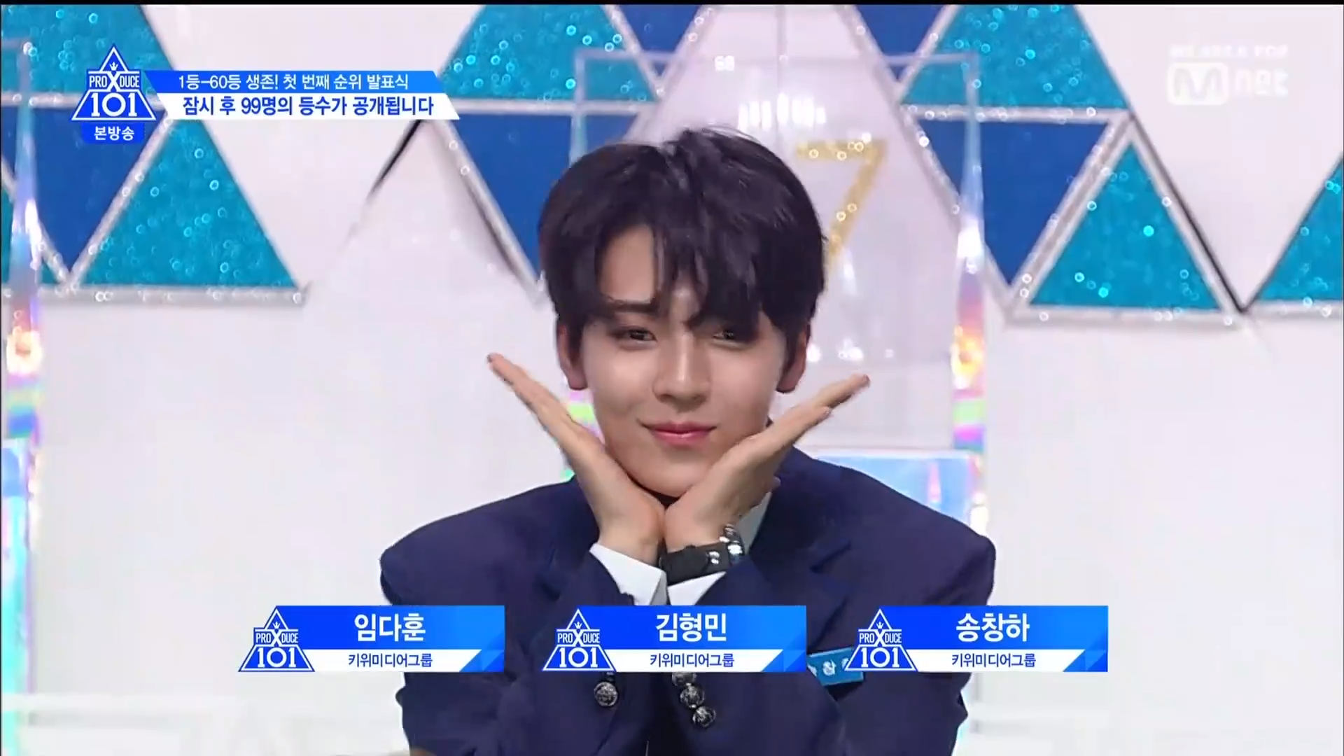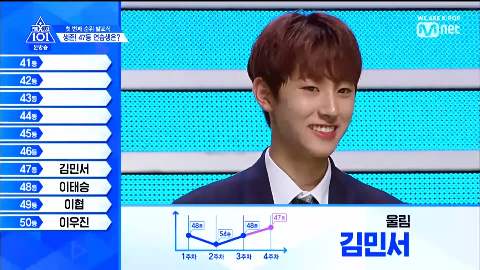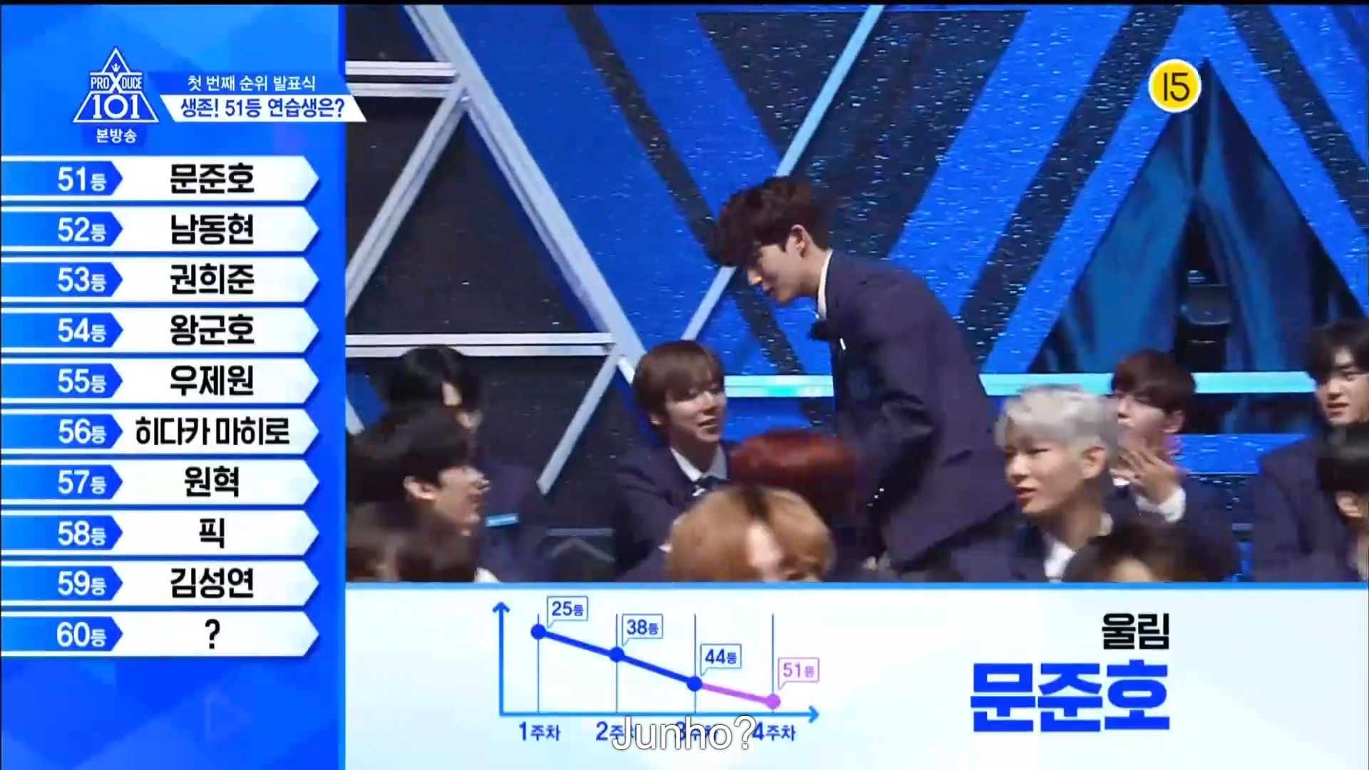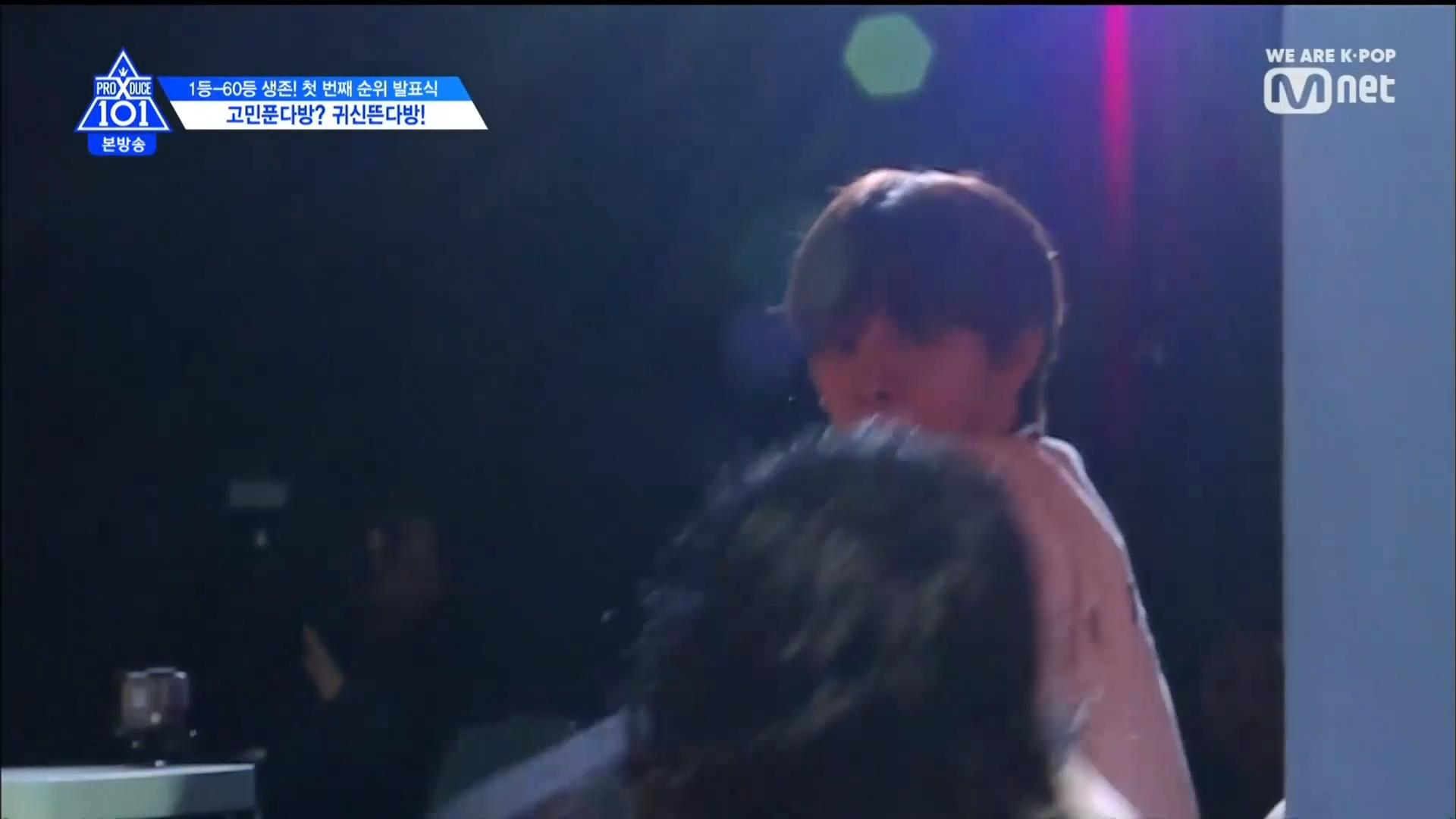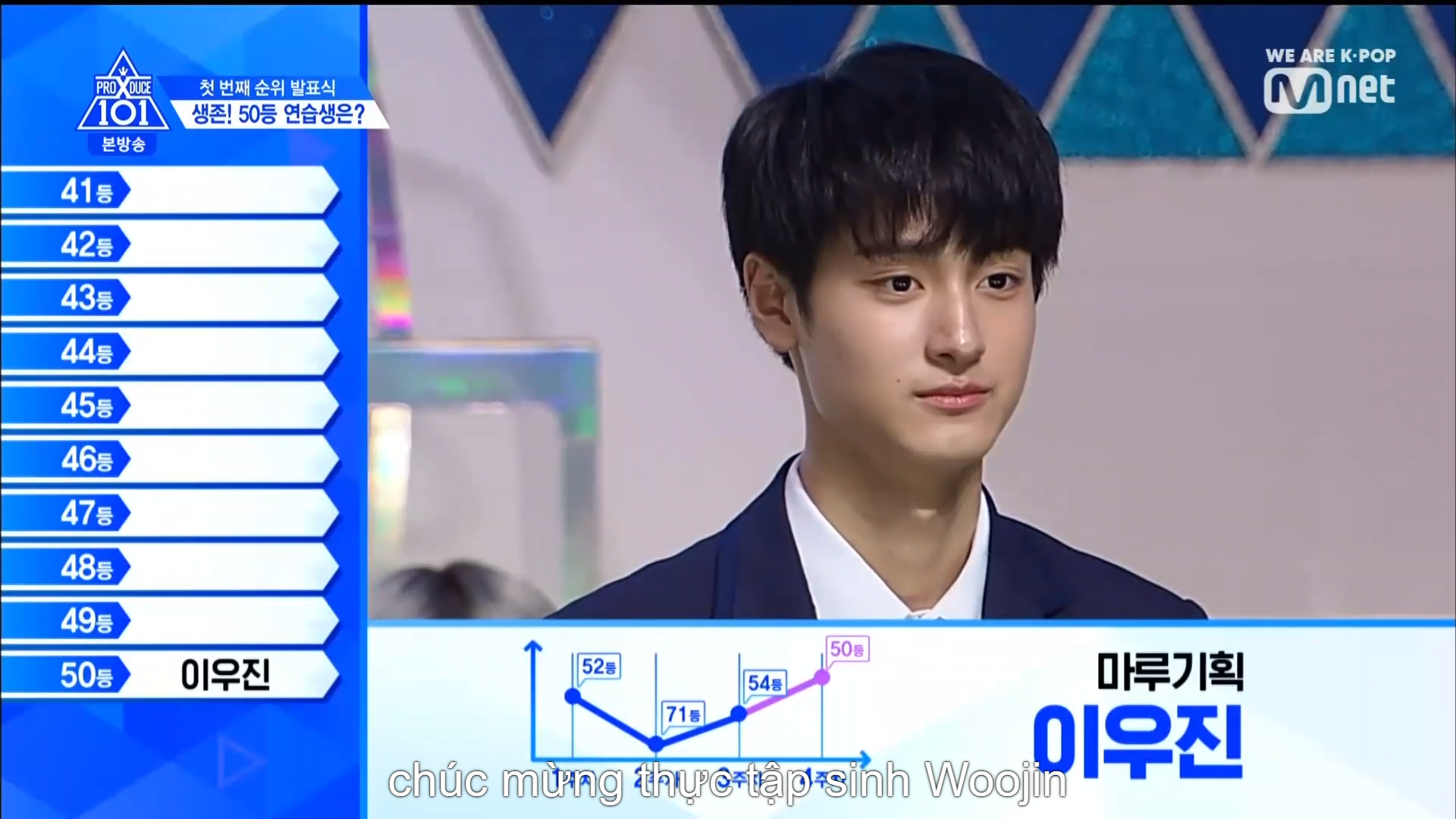 Thời khắc hồi hộp nhất chính thức bắt đầu. Hạng 59 sẽ được công bố đầu tiên. Kim Seong Yeon đã được gọi tên, là TTS đầu tiên được an toàn đi tiếp. WonHyuk hạng 57. Giữ nguyên hạng so với tuần trước. Trước đây TTS này từng xếp hạng 99. Mahiro từ YG hạng 56. Woo Je Won hạng 55 đến từ Around Us. YG Wang Kunho hạng 54. Kwon He Jun TTS lớp X hạng 53. Em trai Nam Tae Hyun - Nam Dong Hyun hạng 52.