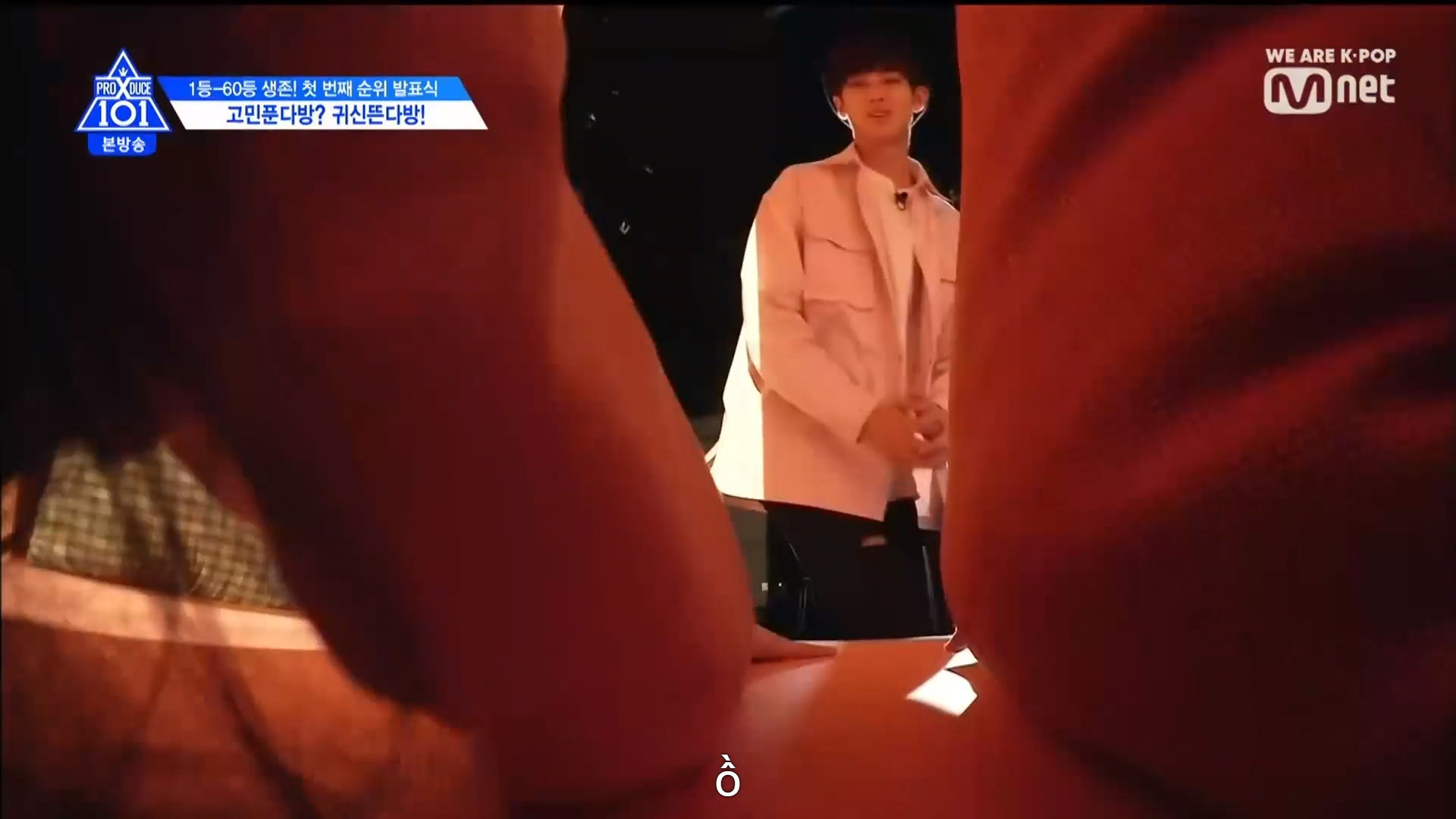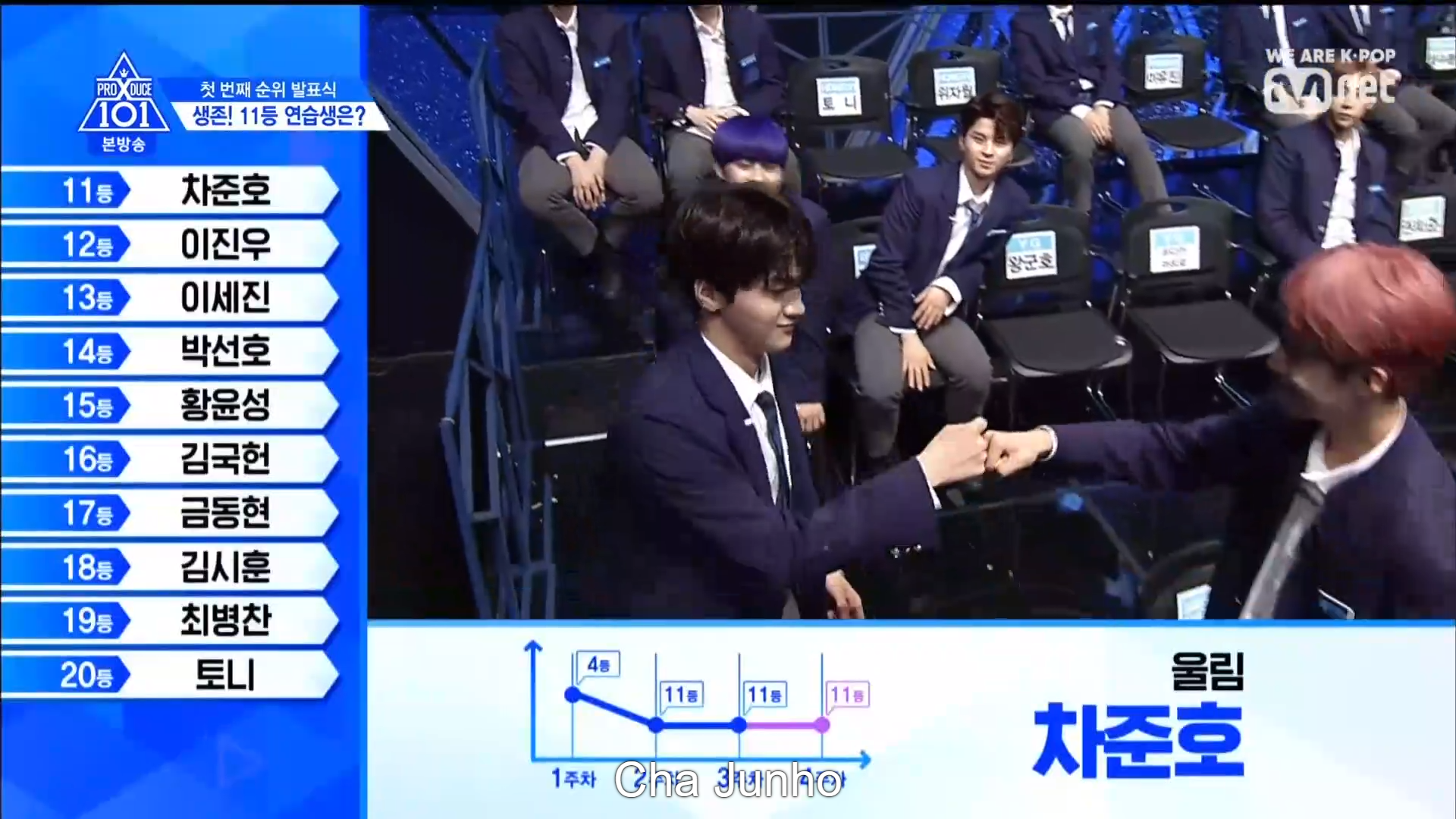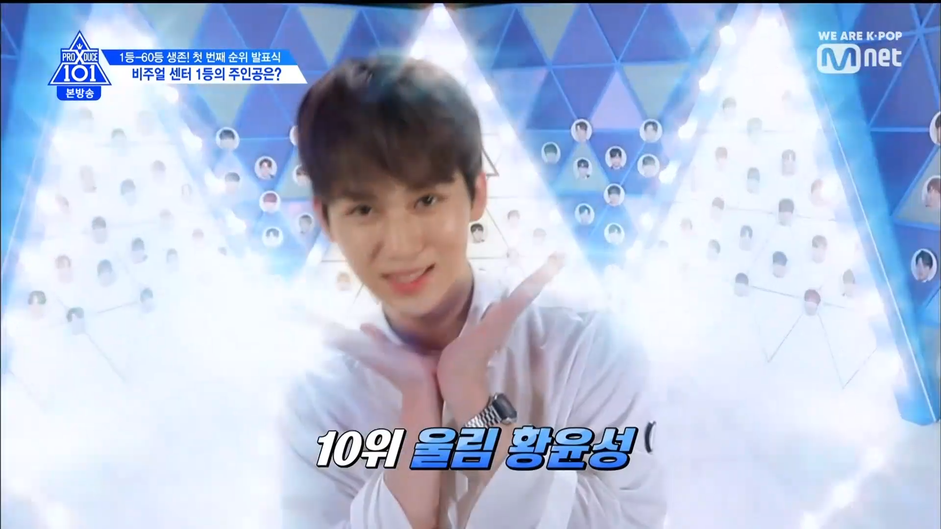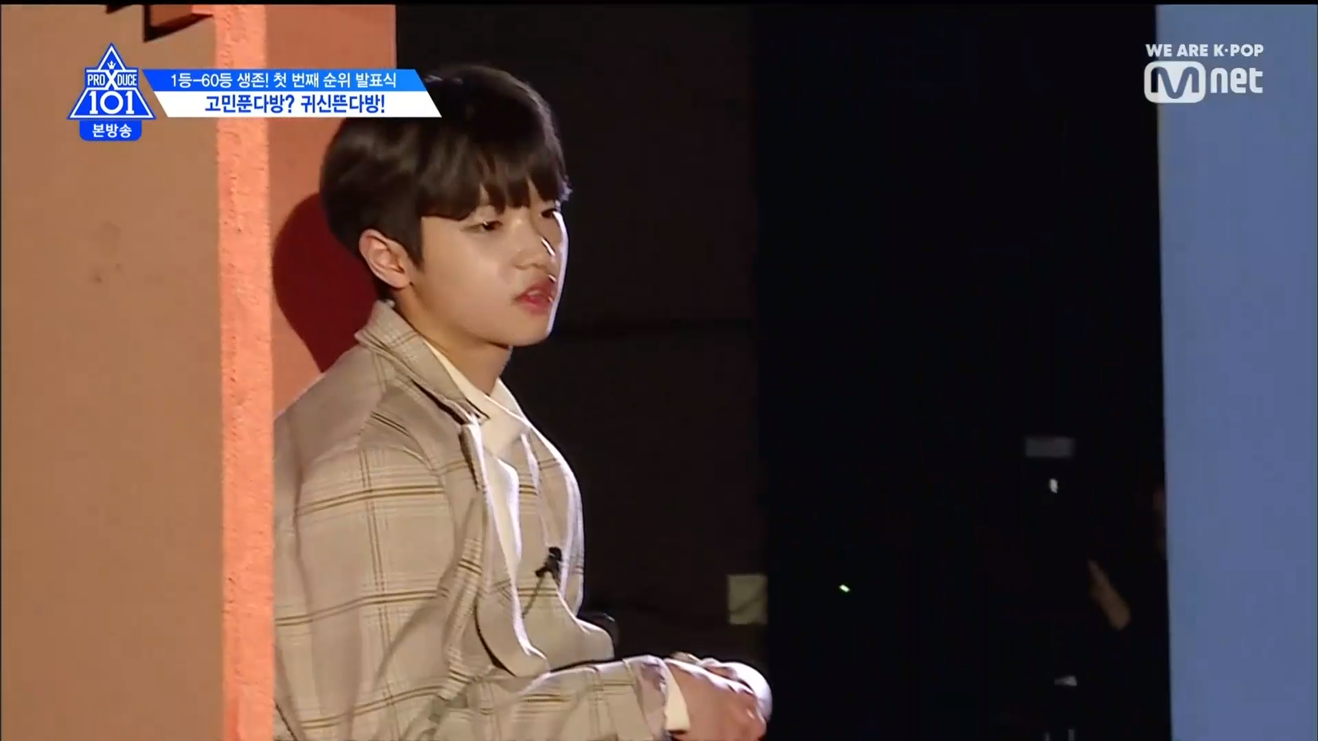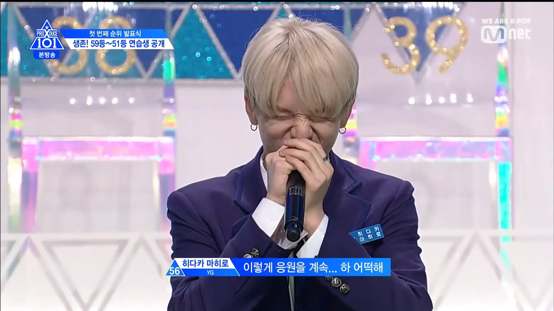 Thời khắc hồi hộp nhất chính thức bắt đầu. Hạng 59 sẽ được công bố đầu tiên. Kim Seong Yeon đã được gọi tên, là TTS đầu tiên được an toàn đi tiếp. WonHyuk hạng 57. Giữ nguyên hạng so với tuần trước. Trước đây TTS này từng xếp hạng 99. Mahiro từ YG hạng 56. Woo Je Won hạng 55 đến từ Around Us. YG Wang Kunho hạng 54. Kwon He Jun TTS lớp X hạng 53. Em trai Nam Tae Hyun - Nam Dong Hyun hạng 52.