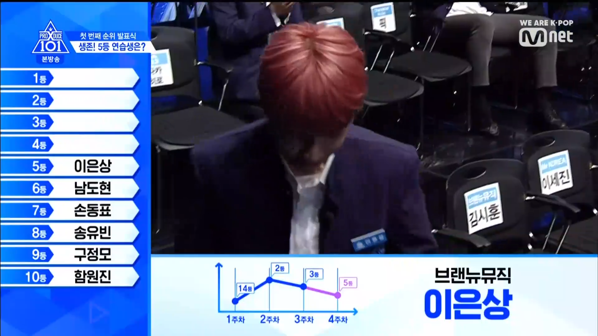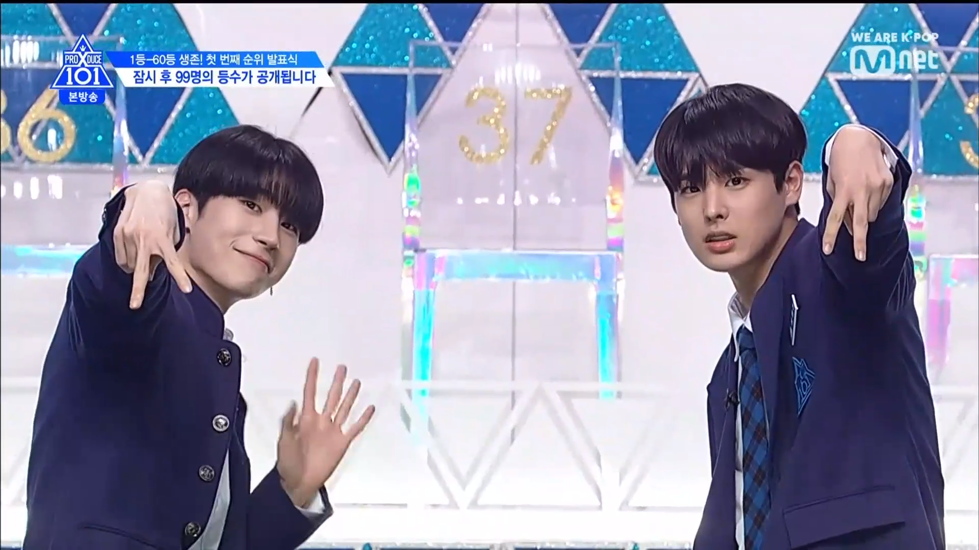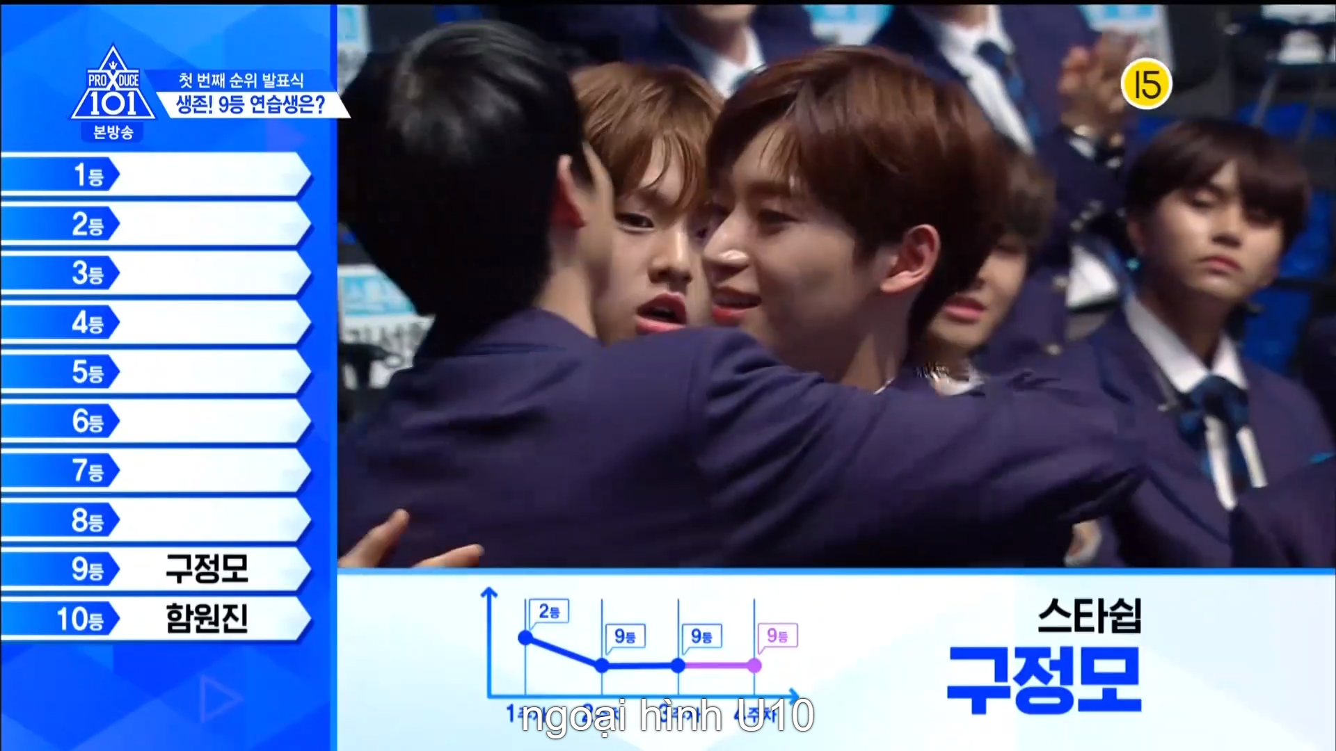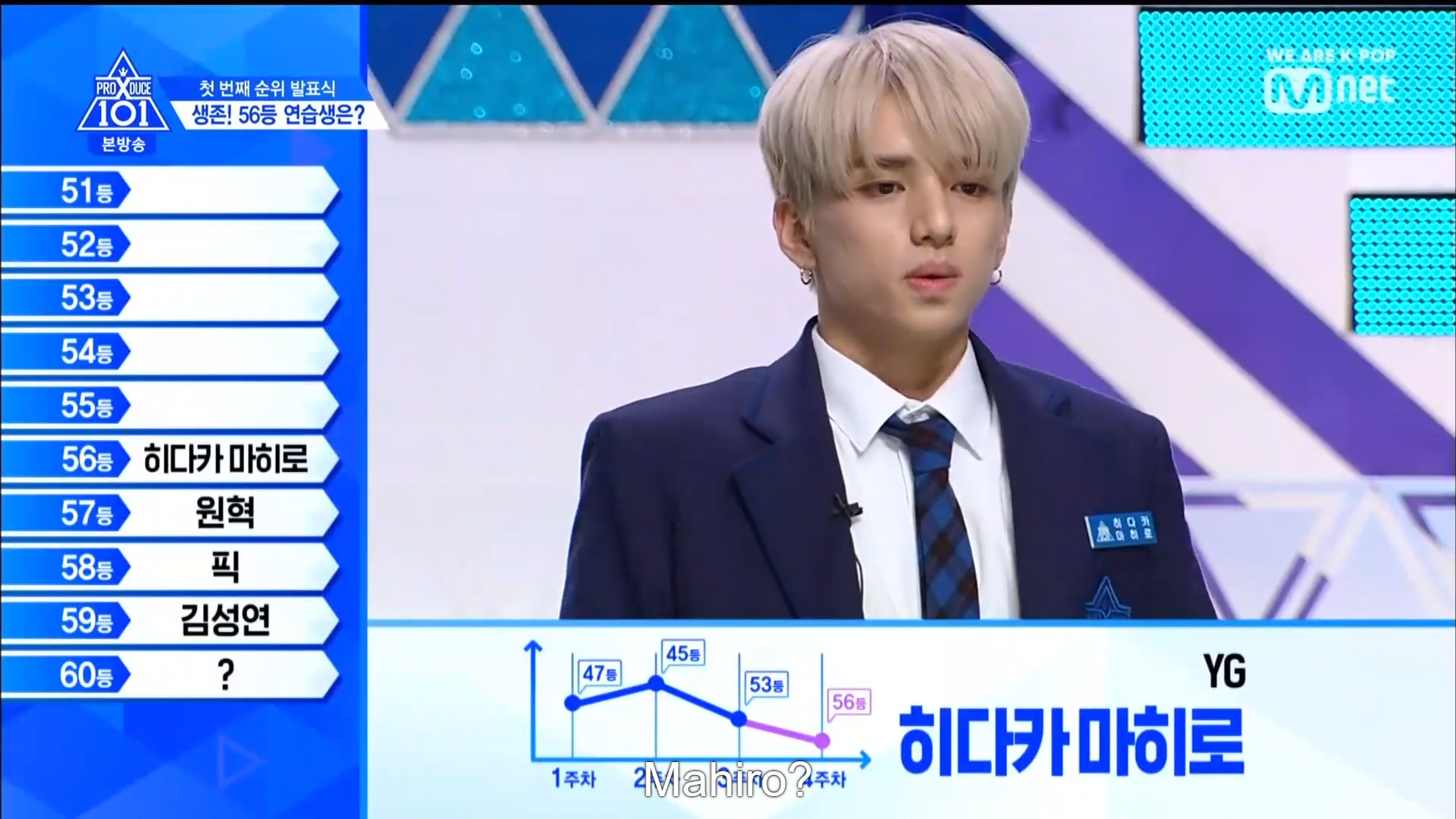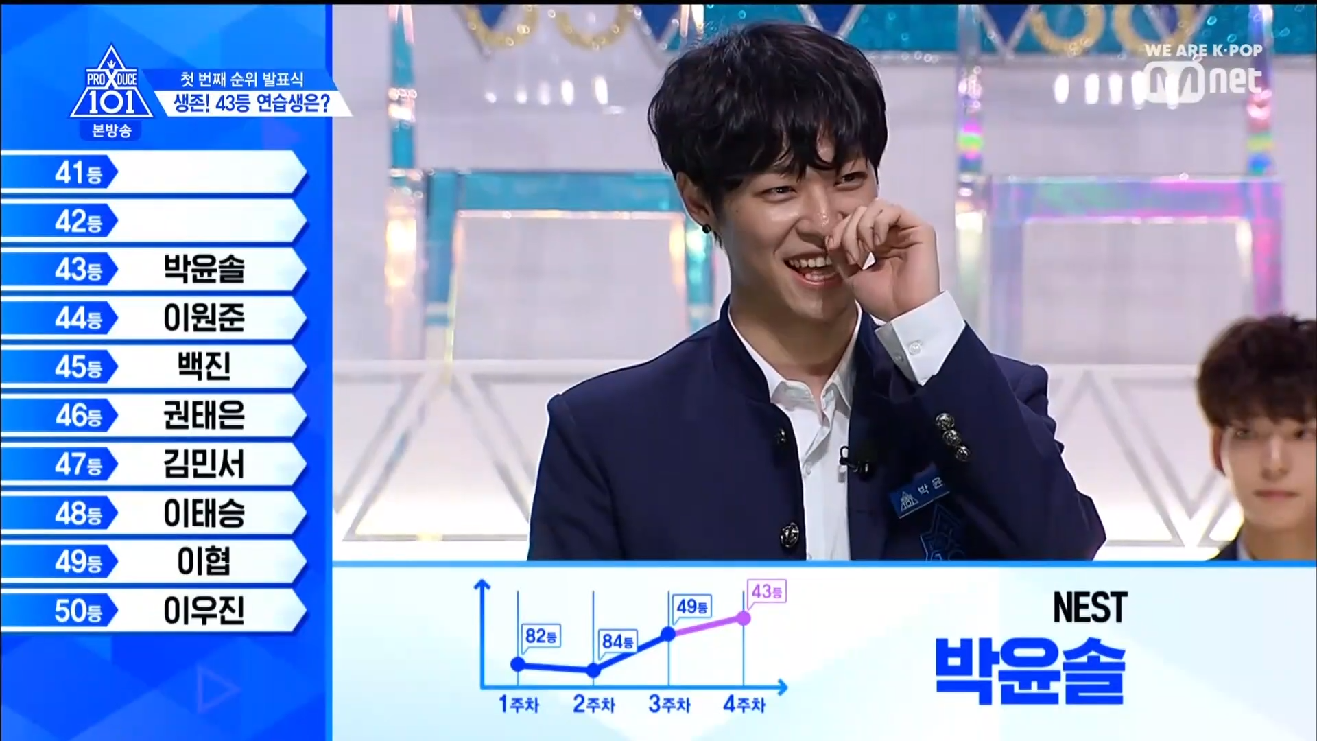 Thời khắc hồi hộp nhất chính thức bắt đầu. Hạng 59 sẽ được công bố đầu tiên. Kim Seong Yeon đã được gọi tên, là TTS đầu tiên được an toàn đi tiếp. WonHyuk hạng 57. Giữ nguyên hạng so với tuần trước. Trước đây TTS này từng xếp hạng 99. Mahiro từ YG hạng 56. Woo Je Won hạng 55 đến từ Around Us. YG Wang Kunho hạng 54. Kwon He Jun TTS lớp X hạng 53. Em trai Nam Tae Hyun - Nam Dong Hyun hạng 52.