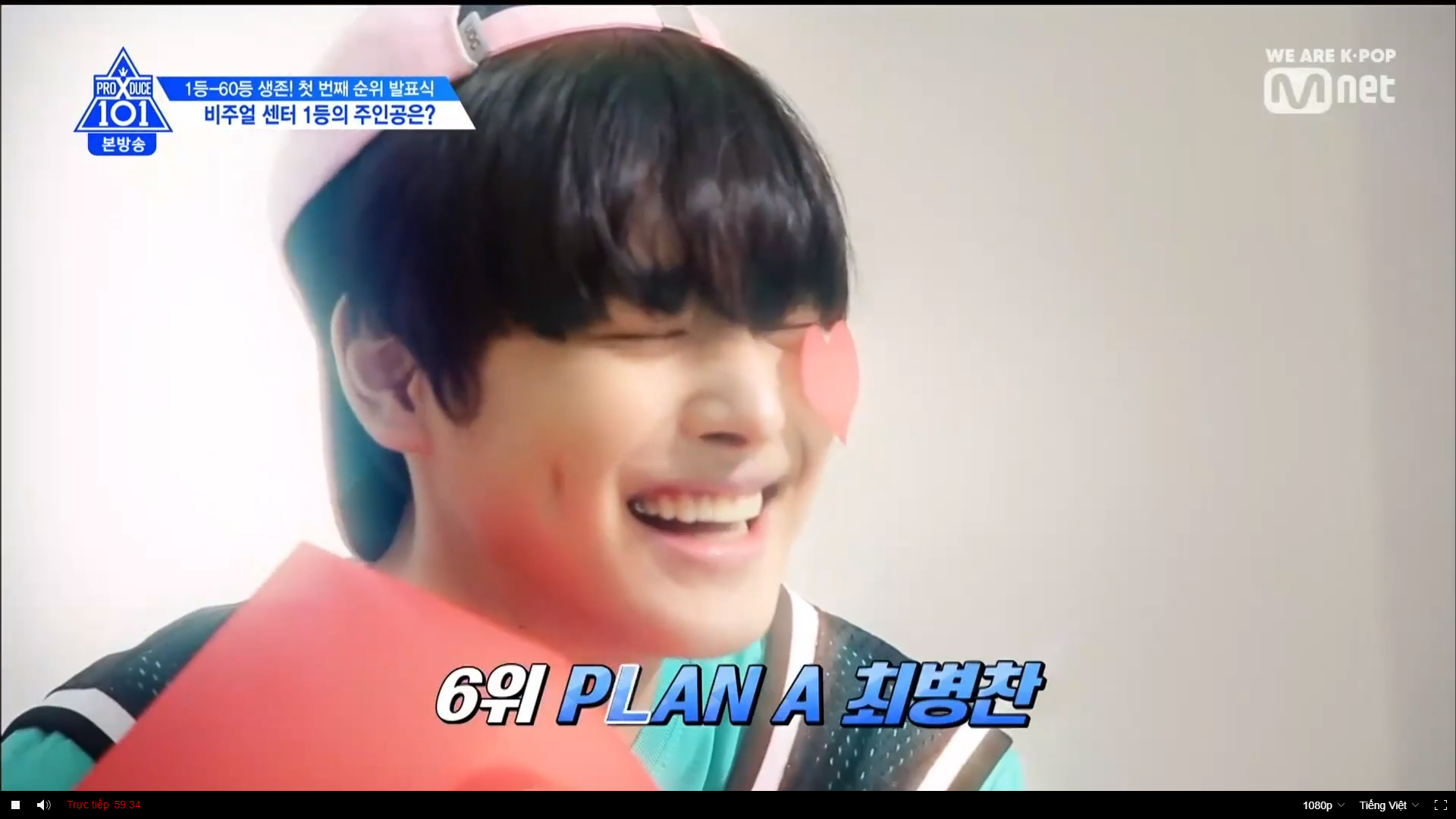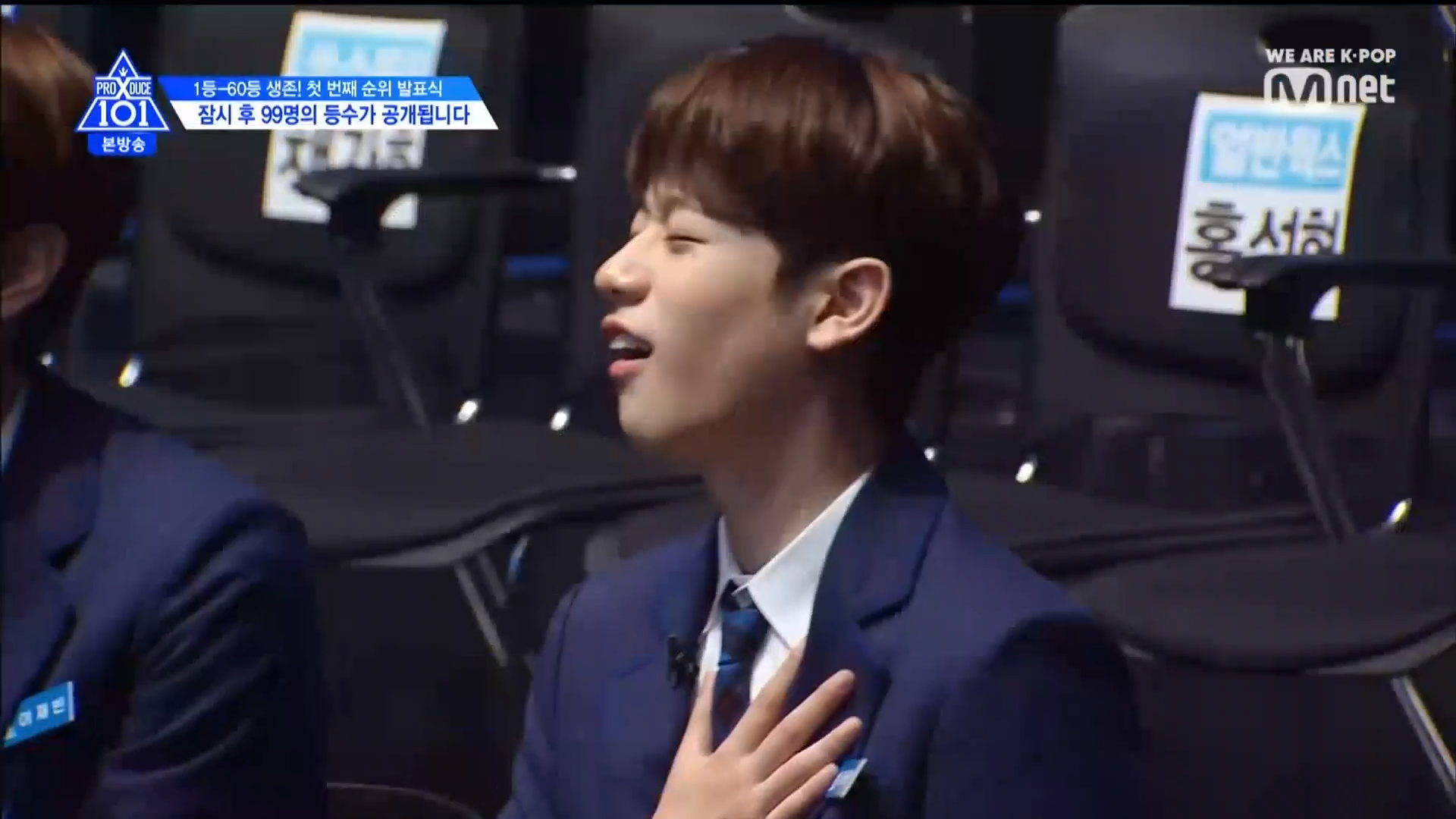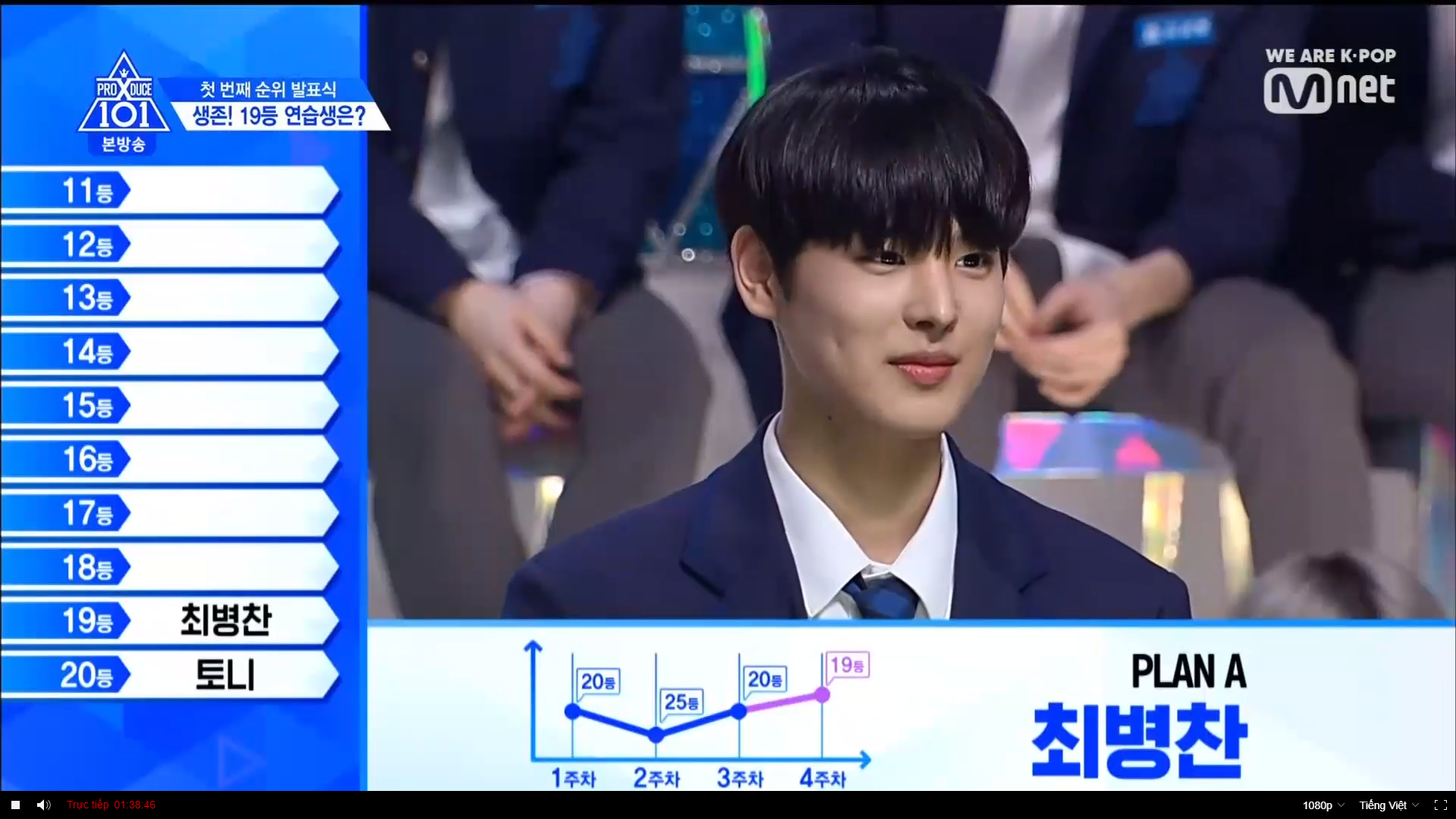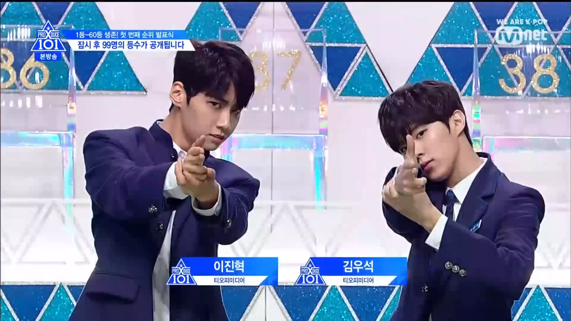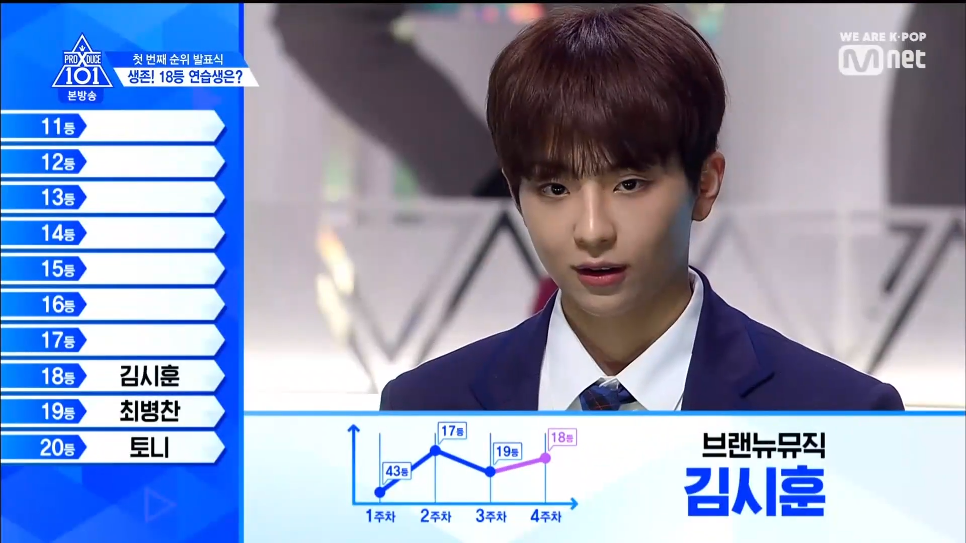 Thời khắc hồi hộp nhất chính thức bắt đầu. Hạng 59 sẽ được công bố đầu tiên. Kim Seong Yeon đã được gọi tên, là TTS đầu tiên được an toàn đi tiếp. WonHyuk hạng 57. Giữ nguyên hạng so với tuần trước. Trước đây TTS này từng xếp hạng 99. Mahiro từ YG hạng 56. Woo Je Won hạng 55 đến từ Around Us. YG Wang Kunho hạng 54. Kwon He Jun TTS lớp X hạng 53. Em trai Nam Tae Hyun - Nam Dong Hyun hạng 52.