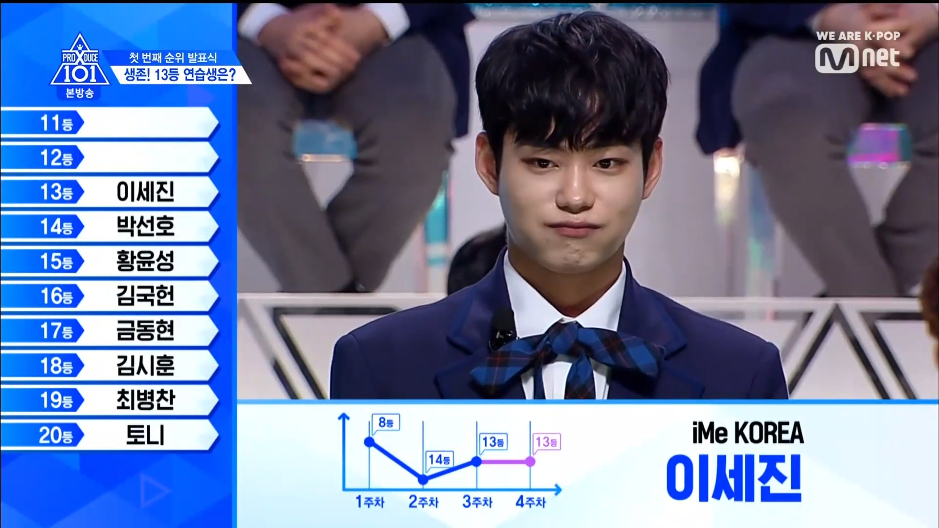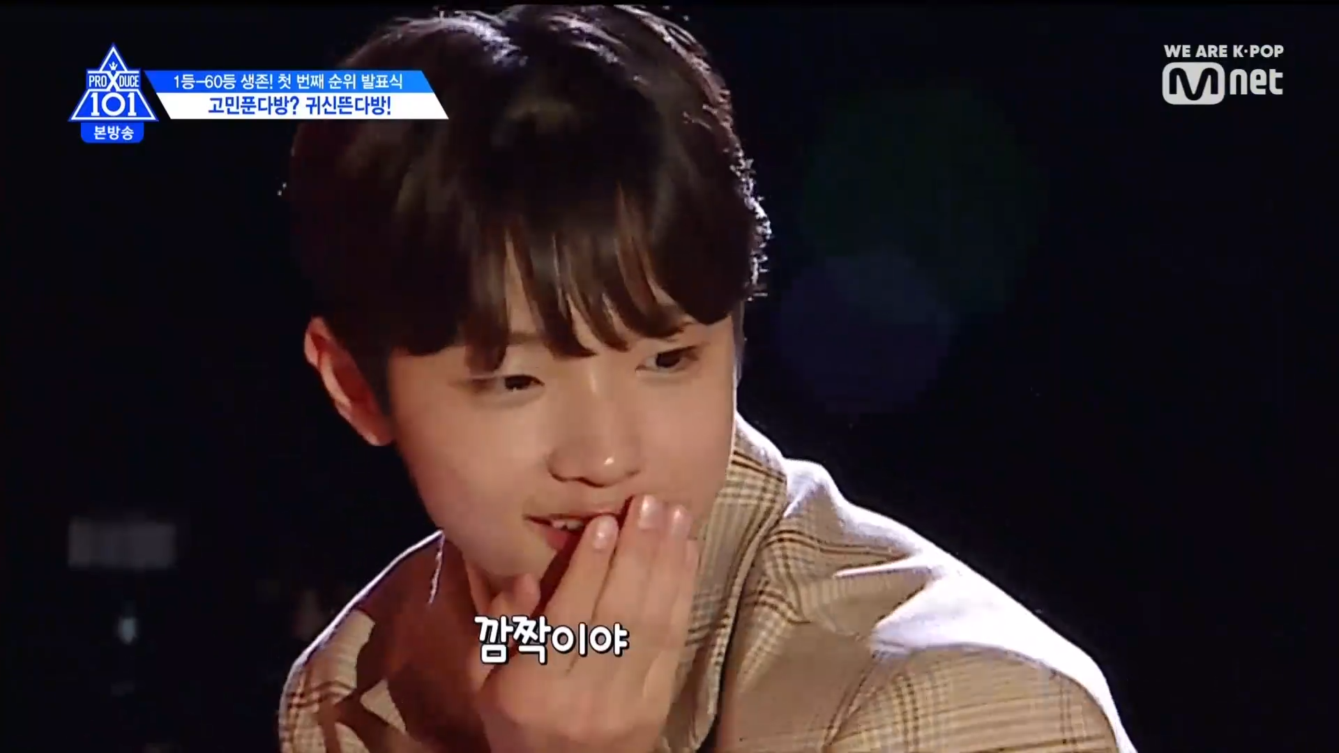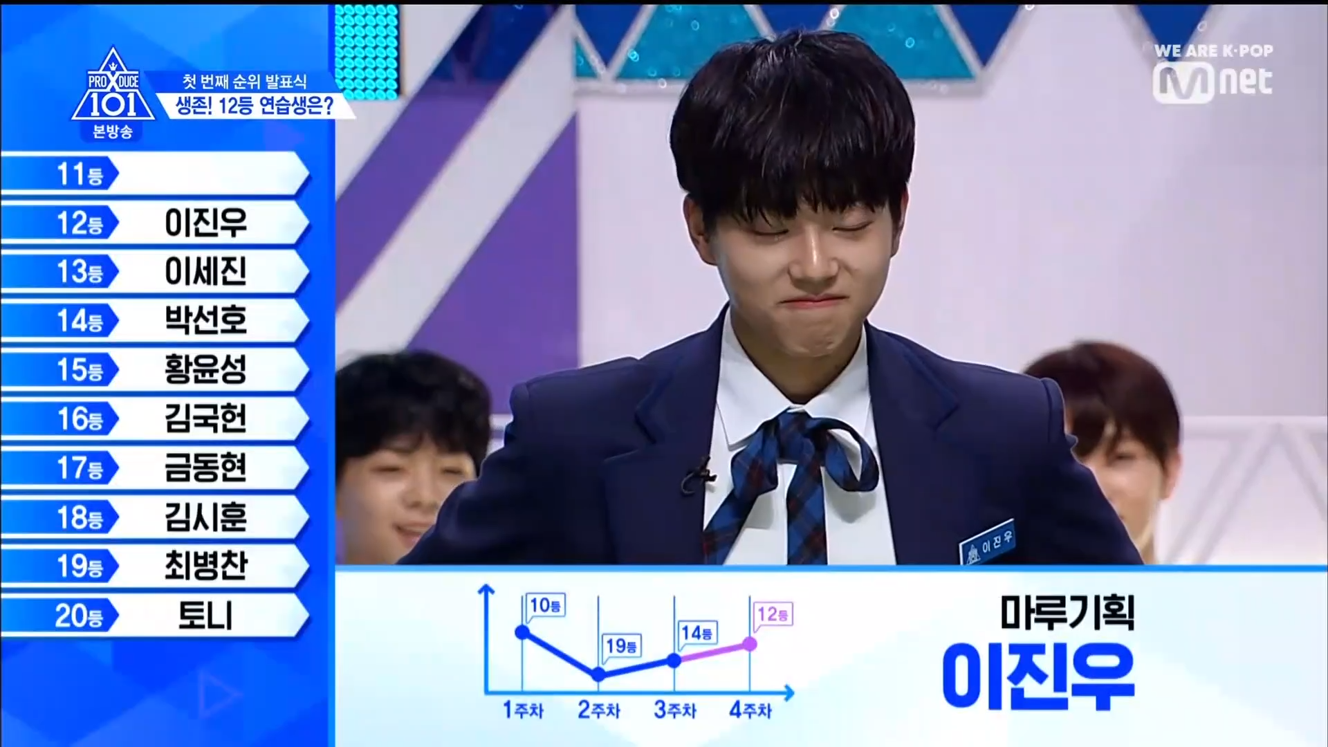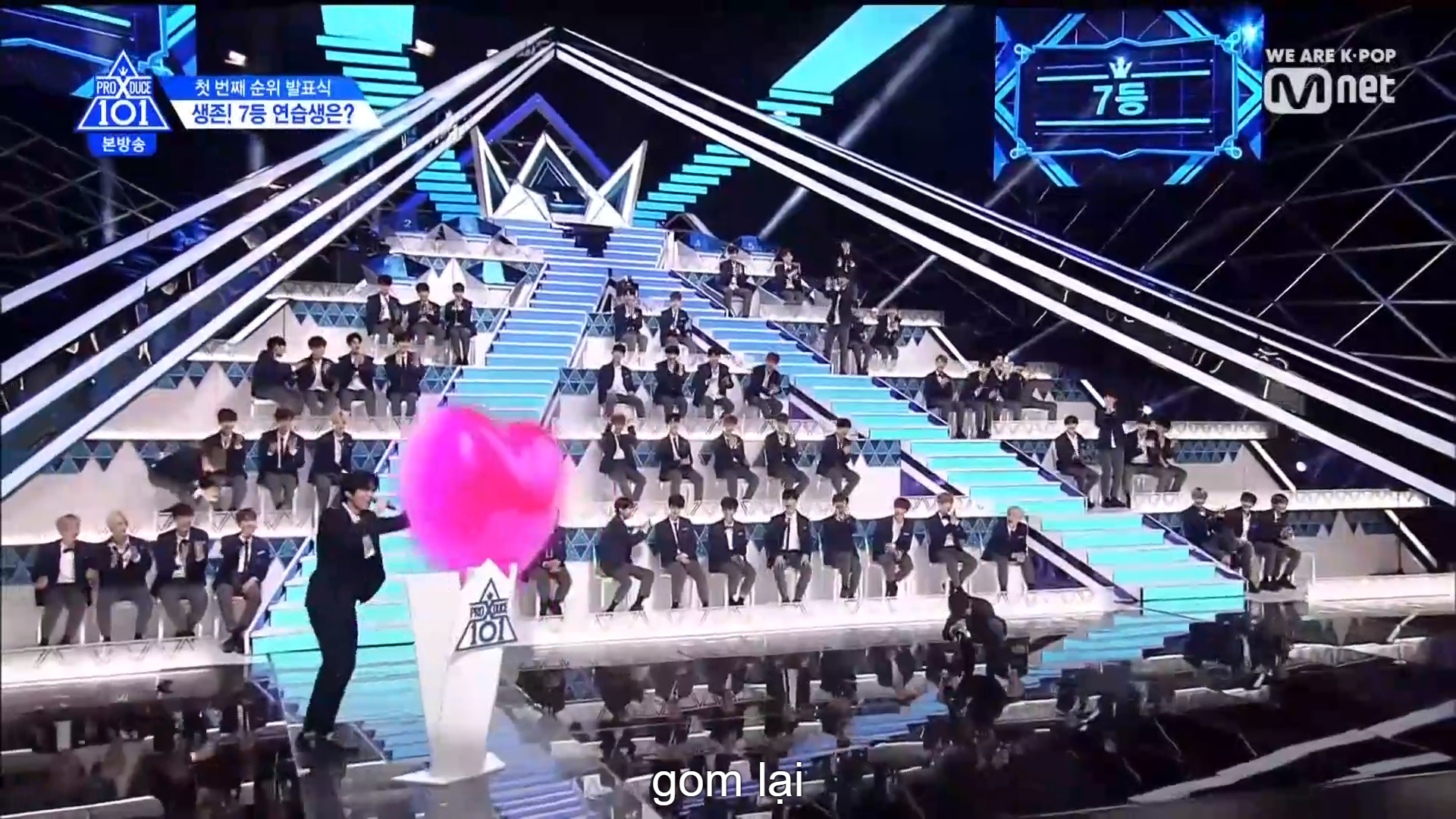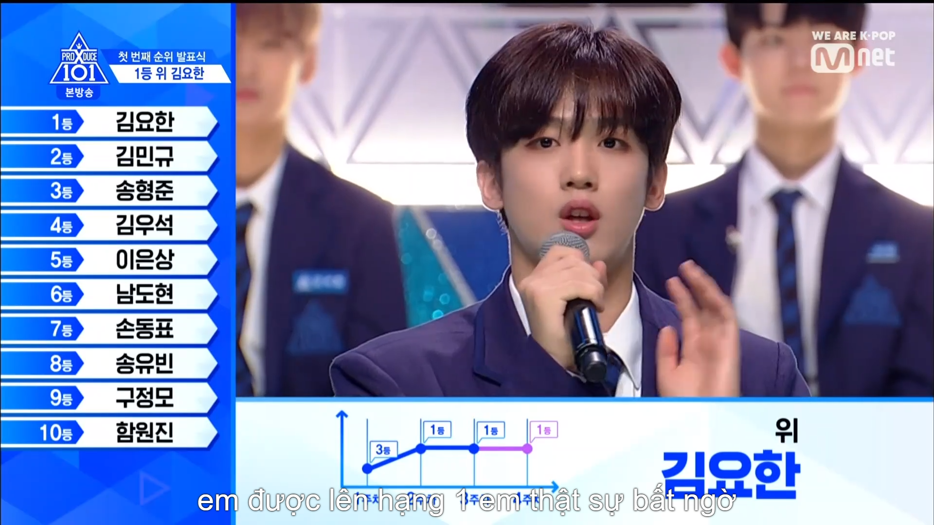 Thời khắc hồi hộp nhất chính thức bắt đầu. Hạng 59 sẽ được công bố đầu tiên. Kim Seong Yeon đã được gọi tên, là TTS đầu tiên được an toàn đi tiếp. WonHyuk hạng 57. Giữ nguyên hạng so với tuần trước. Trước đây TTS này từng xếp hạng 99. Mahiro từ YG hạng 56. Woo Je Won hạng 55 đến từ Around Us. YG Wang Kunho hạng 54. Kwon He Jun TTS lớp X hạng 53. Em trai Nam Tae Hyun - Nam Dong Hyun hạng 52.