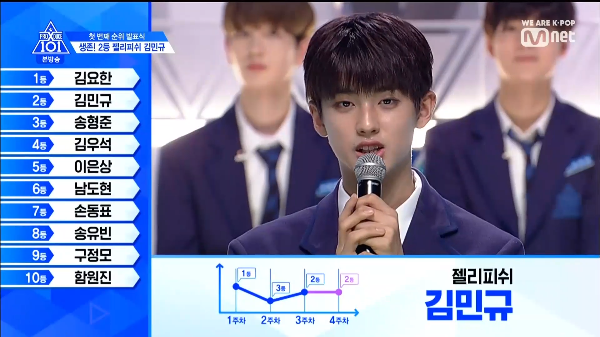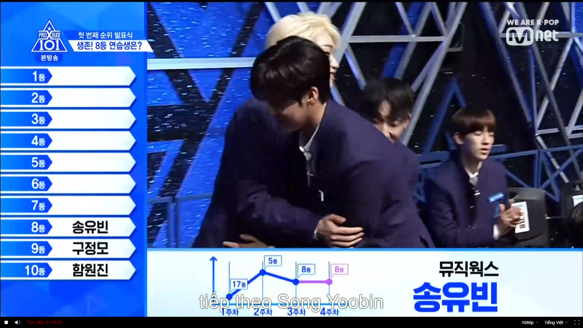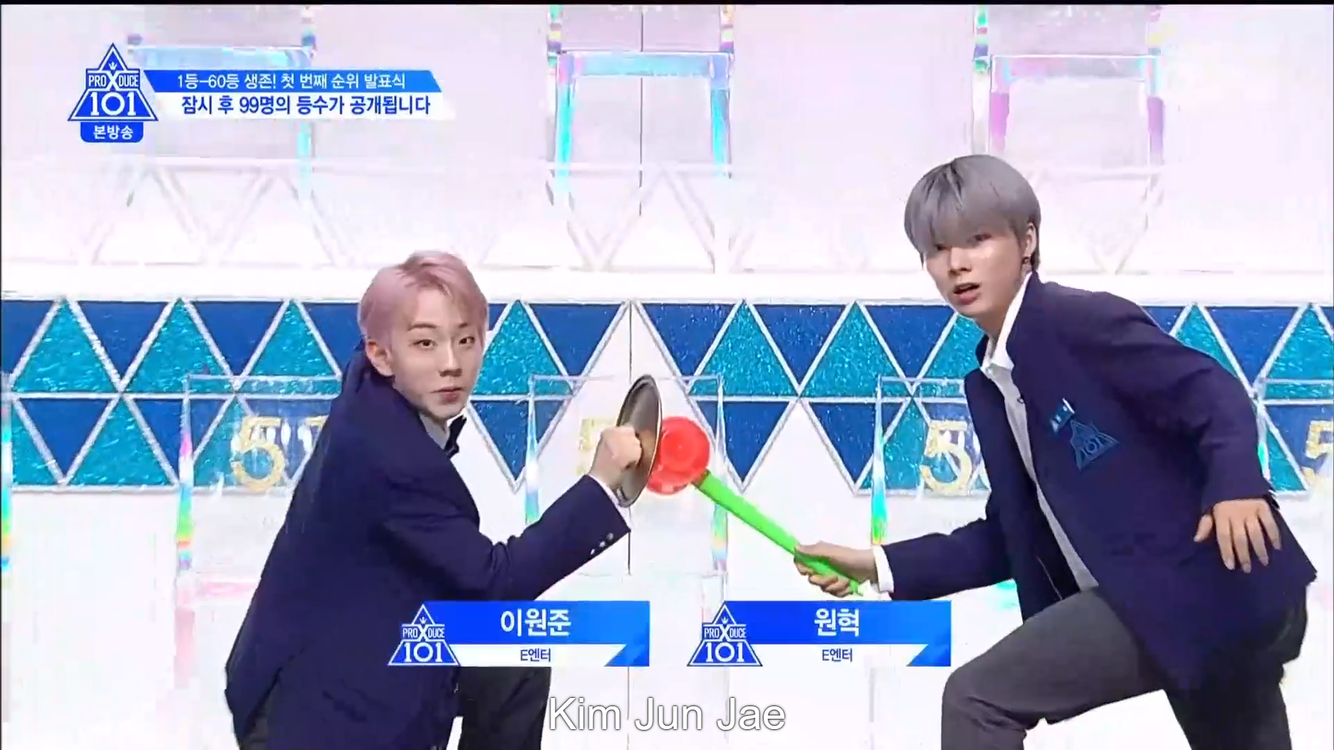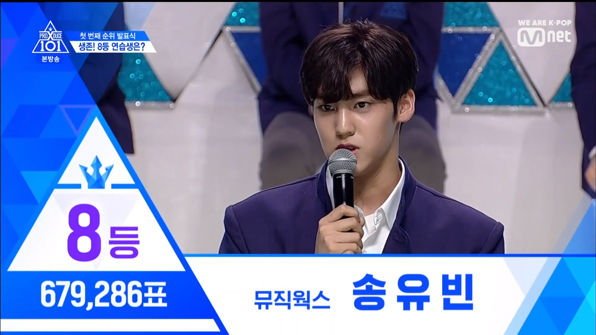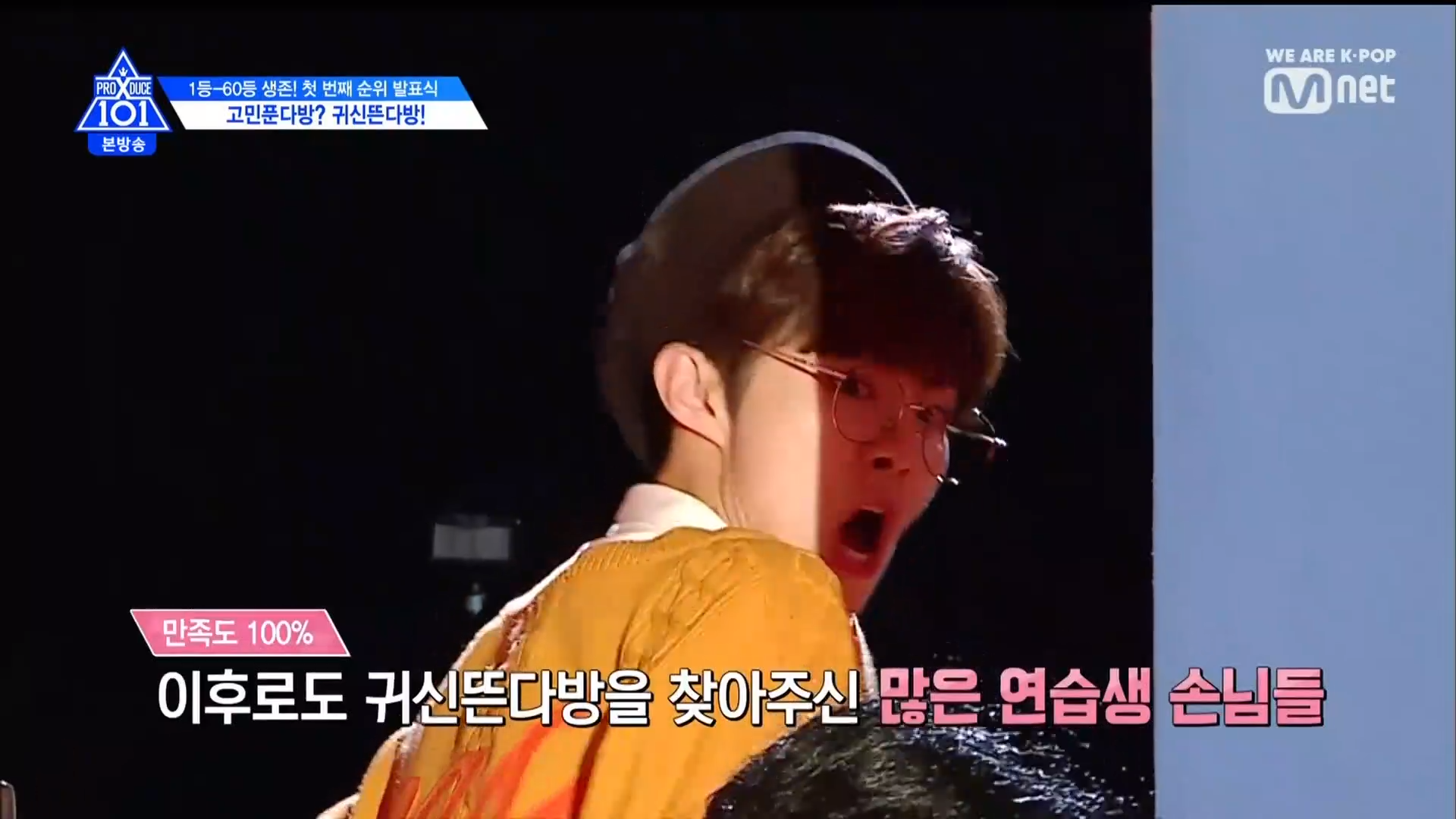Thời khắc hồi hộp nhất chính thức bắt đầu. Hạng 59 sẽ được công bố đầu tiên. Kim Seong Yeon đã được gọi tên, là TTS đầu tiên được an toàn đi tiếp. WonHyuk hạng 57. Giữ nguyên hạng so với tuần trước. Trước đây TTS này từng xếp hạng 99. Mahiro từ YG hạng 56. Woo Je Won hạng 55 đến từ Around Us. YG Wang Kunho hạng 54. Kwon He Jun TTS lớp X hạng 53. Em trai Nam Tae Hyun - Nam Dong Hyun hạng 52.