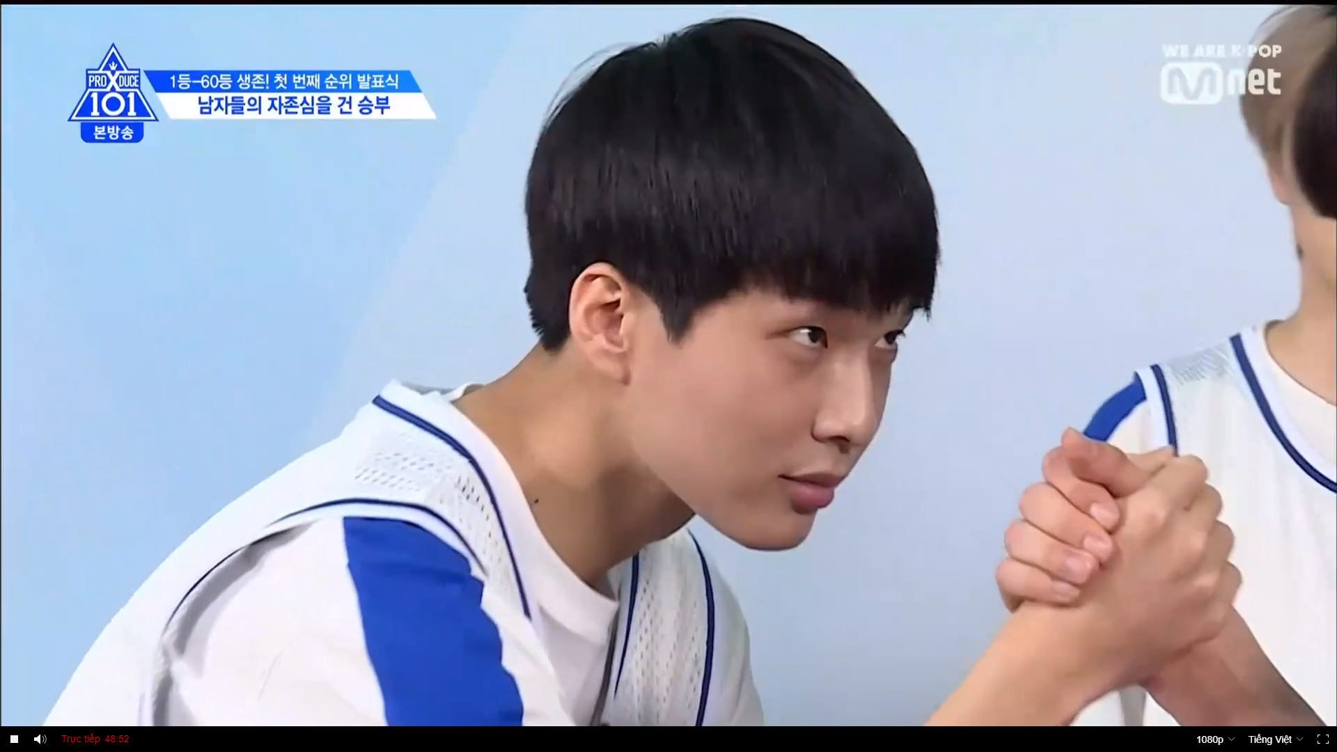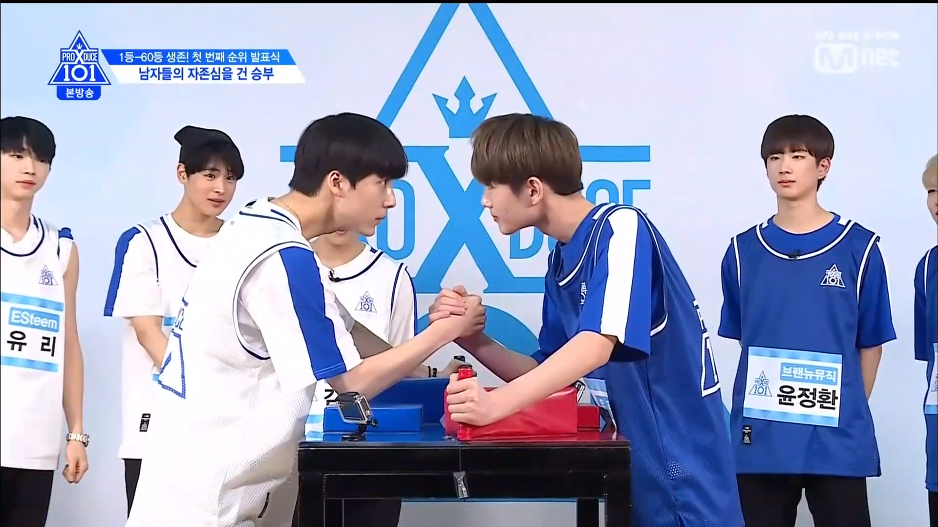 2 đội trắng và xanh cùng nhau battle vật tay. Các TTS yếu đuối hơn lần lượt trổ tài aegyo để đánh lạc hướng đối thủ của mình bên cạnh đó là những lời khích đấu. Song Hyung Jun đã bảo Kim Yohan hãy chửi thề nhiều lên nhưng anh chàng vận động viên đã nhanh chóng hạ gục cậu bé mochi trong 1 nốt nhạc.