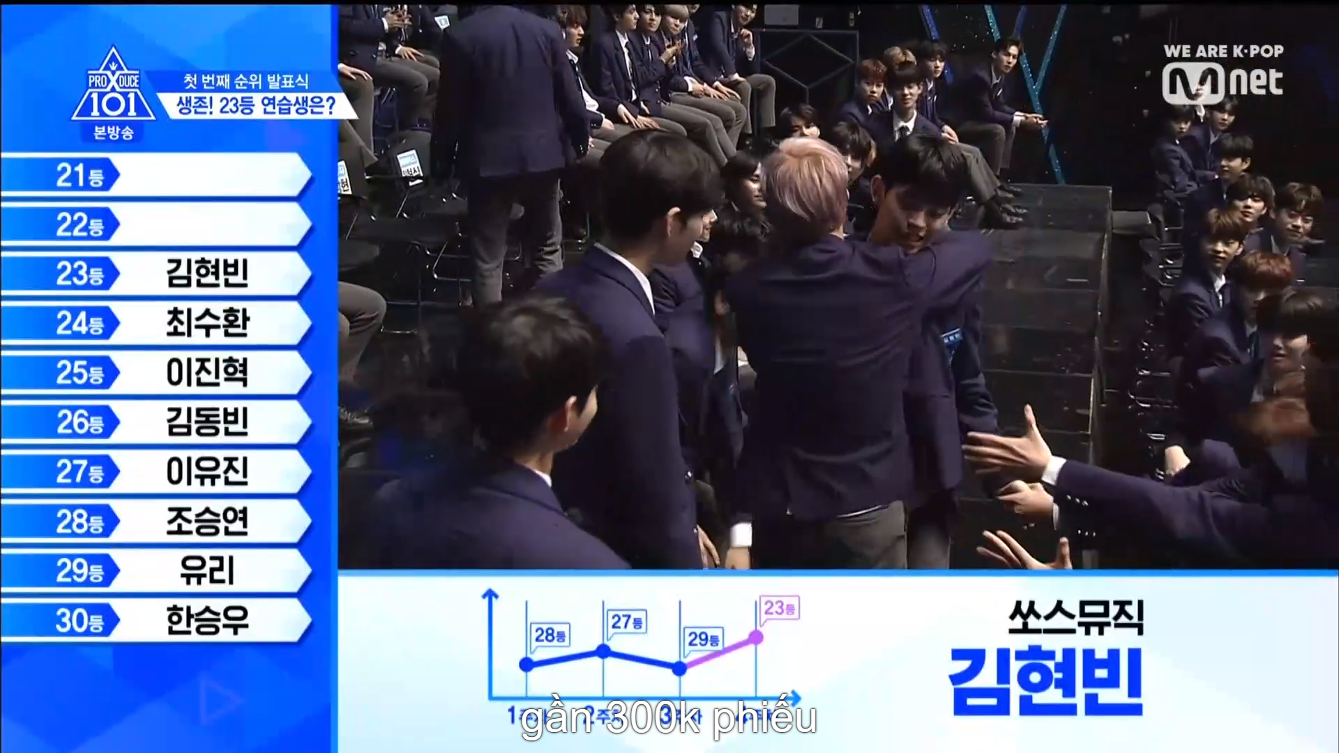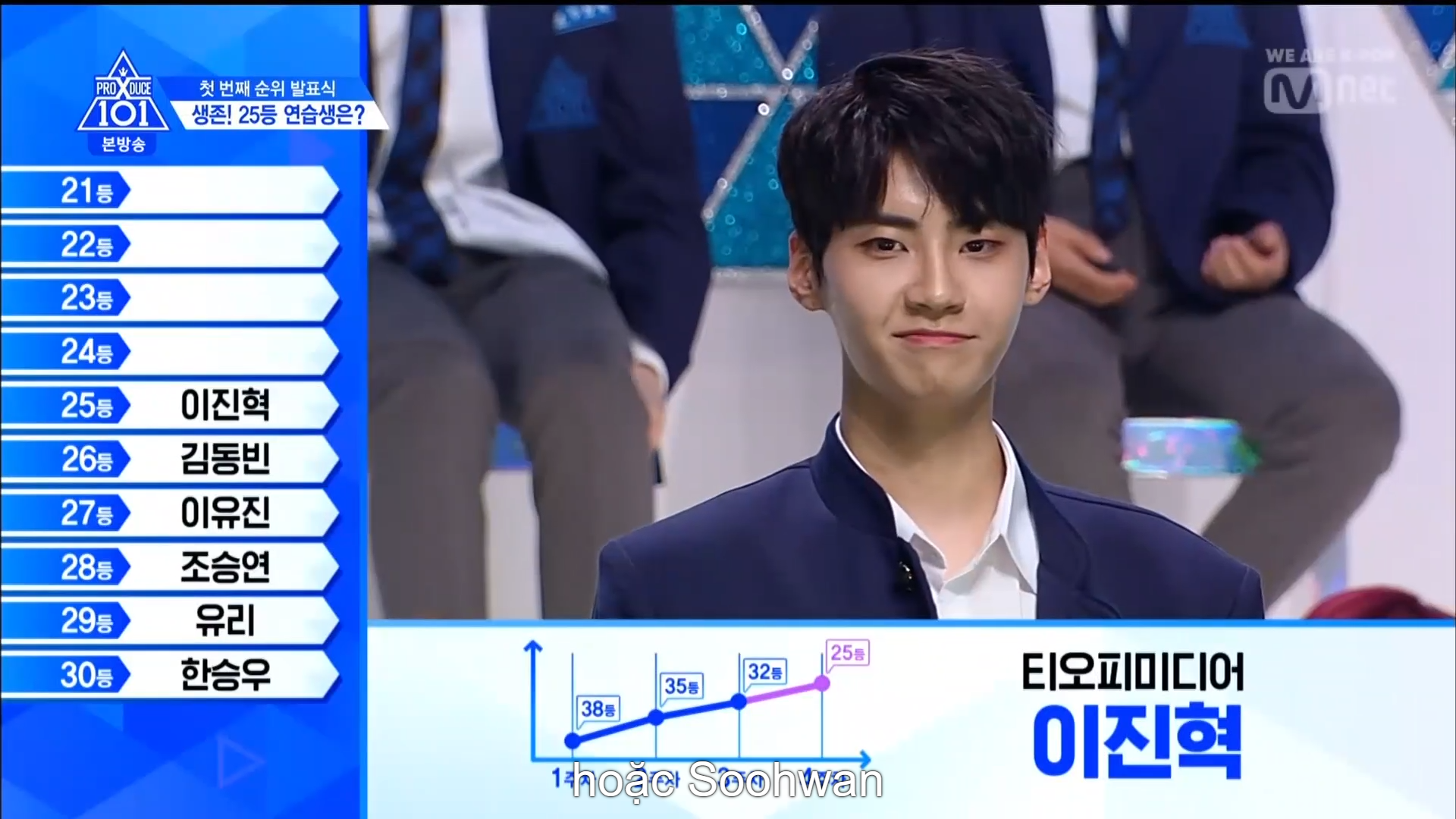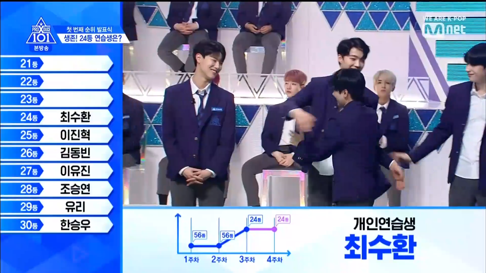 Hạng 24 thuộc về TTS lớp A Choi Suhwan. Hạng 23 thuộc về Kim Hyunbin - hạng 1 vòng vote trực tiếp với vị trí center ca khúc No More Dream - BTS. Hạng 22 là anh chàng Mang Mihee team Love Shot. Hạng 21 thuộc về anh chàng có màn ending ấn tượng cùng vẻ ngoài nam tính - Lee Han Gyul đến từ MBK.