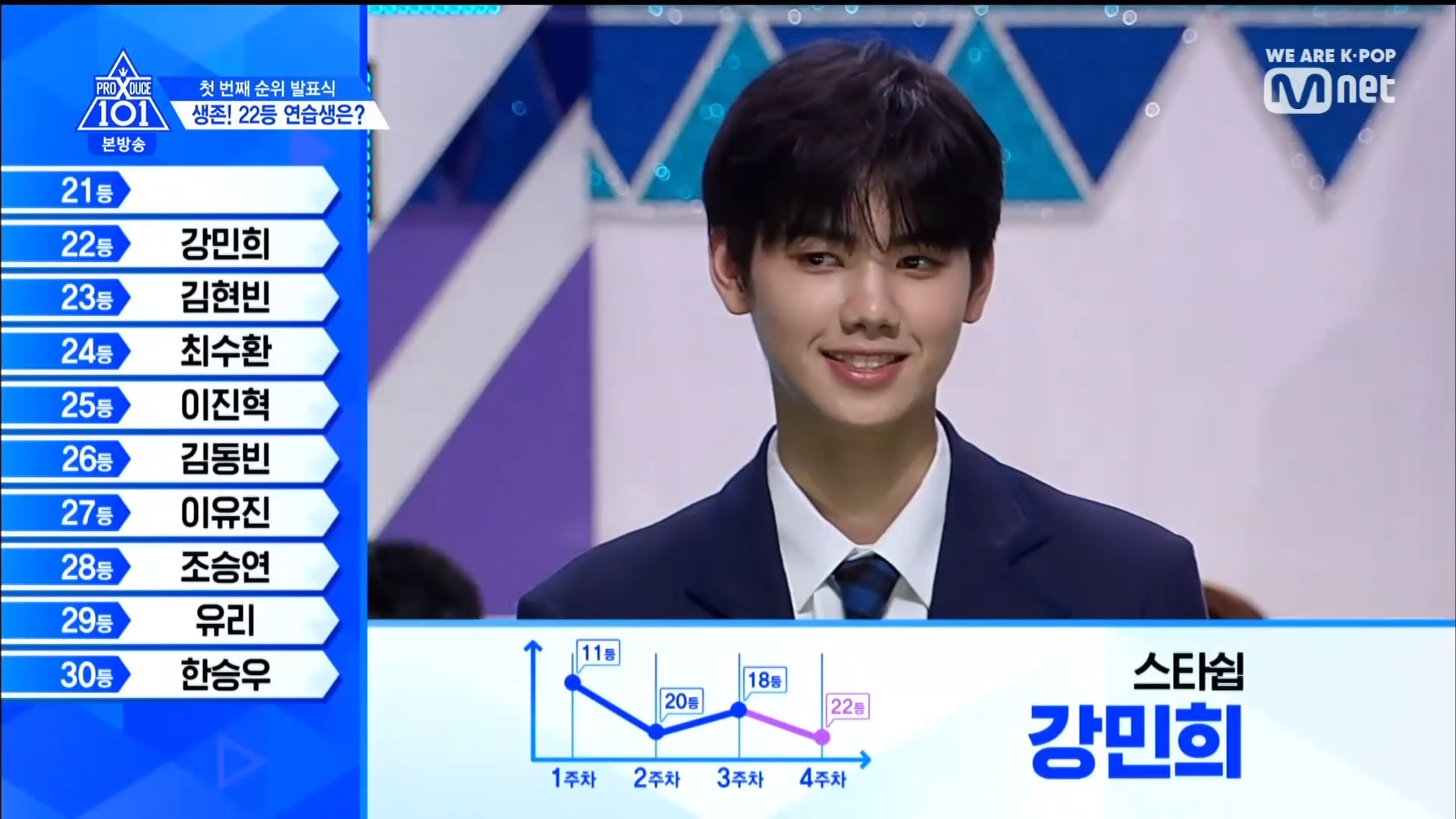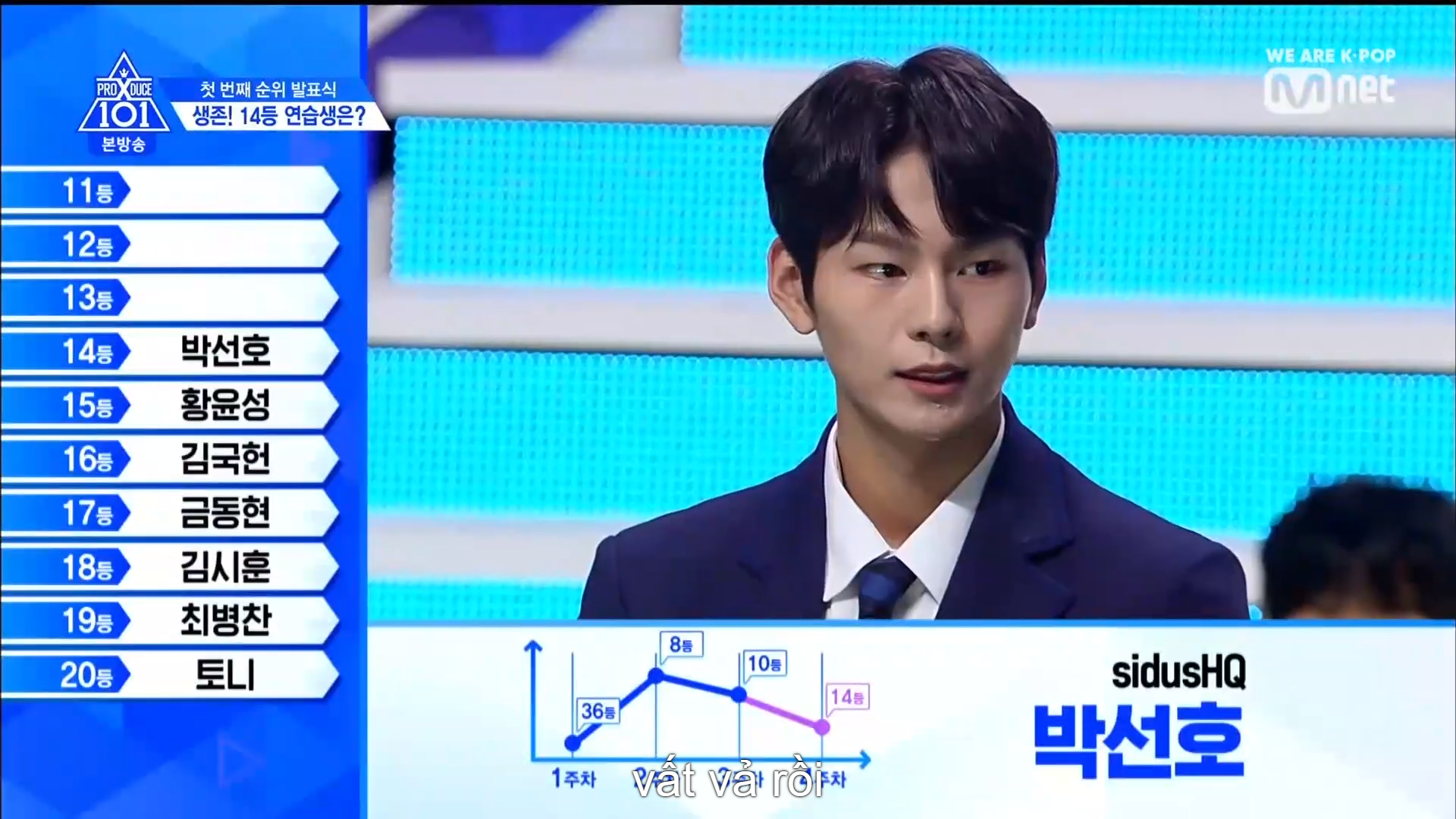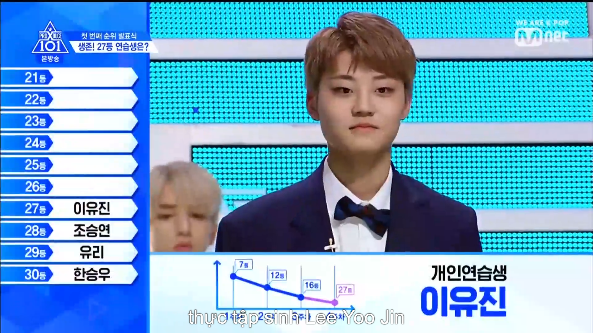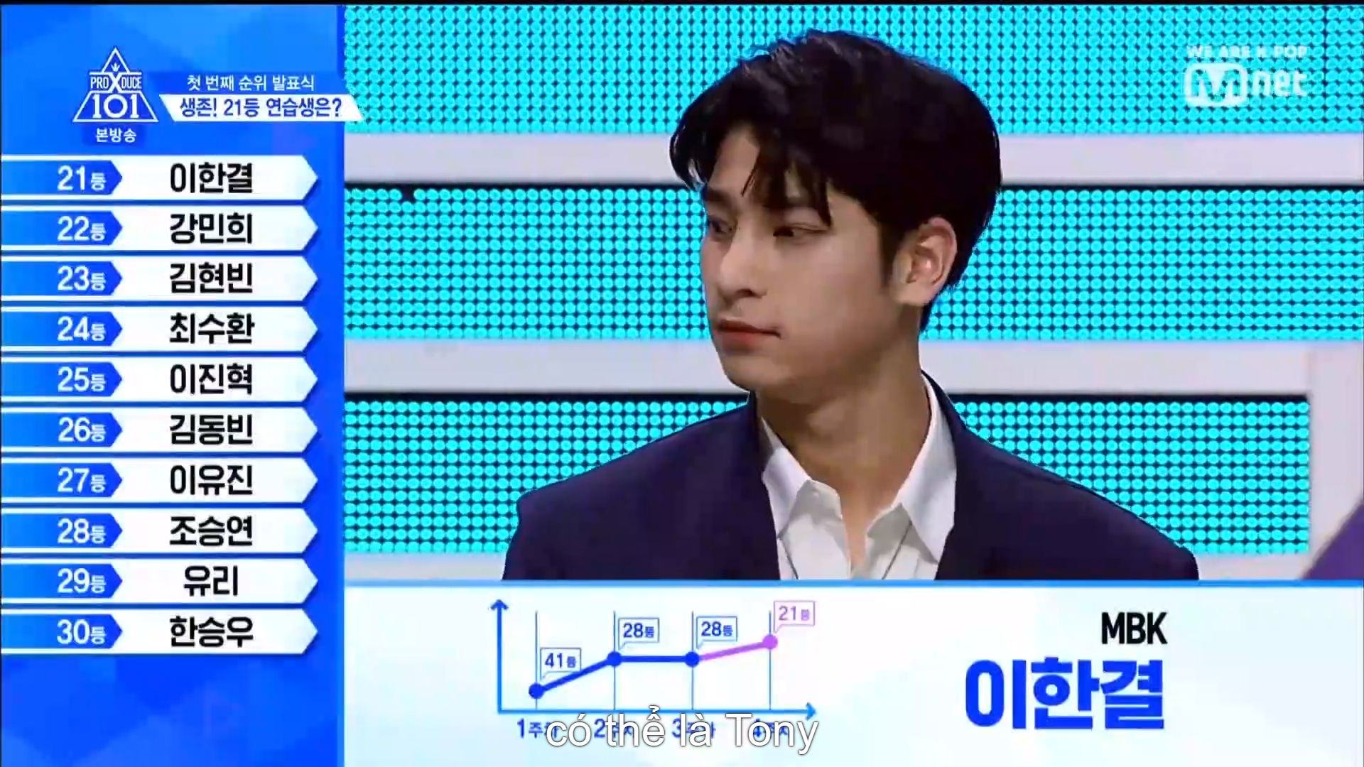 Hạng 24 thuộc về TTS lớp A Choi Suhwan. Hạng 23 thuộc về Kim Hyunbin - hạng 1 vòng vote trực tiếp với vị trí center ca khúc No More Dream - BTS. Hạng 22 là anh chàng Mang Mihee team Love Shot. Hạng 21 thuộc về anh chàng có màn ending ấn tượng cùng vẻ ngoài nam tính - Lee Han Gyul đến từ MBK.