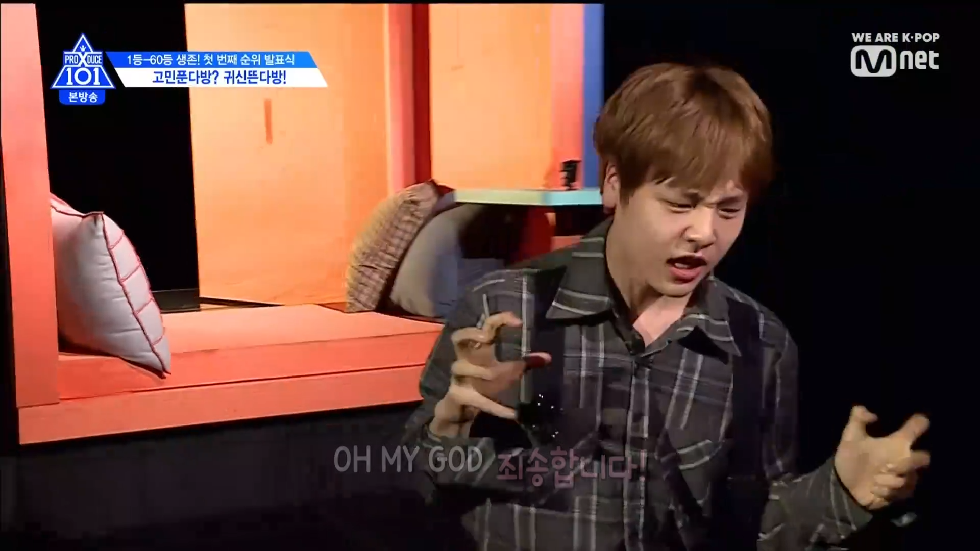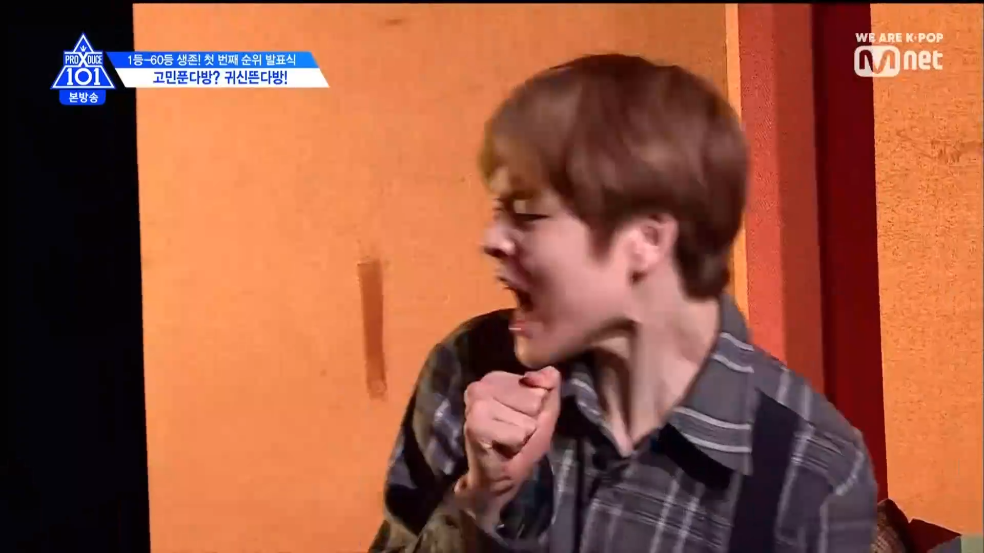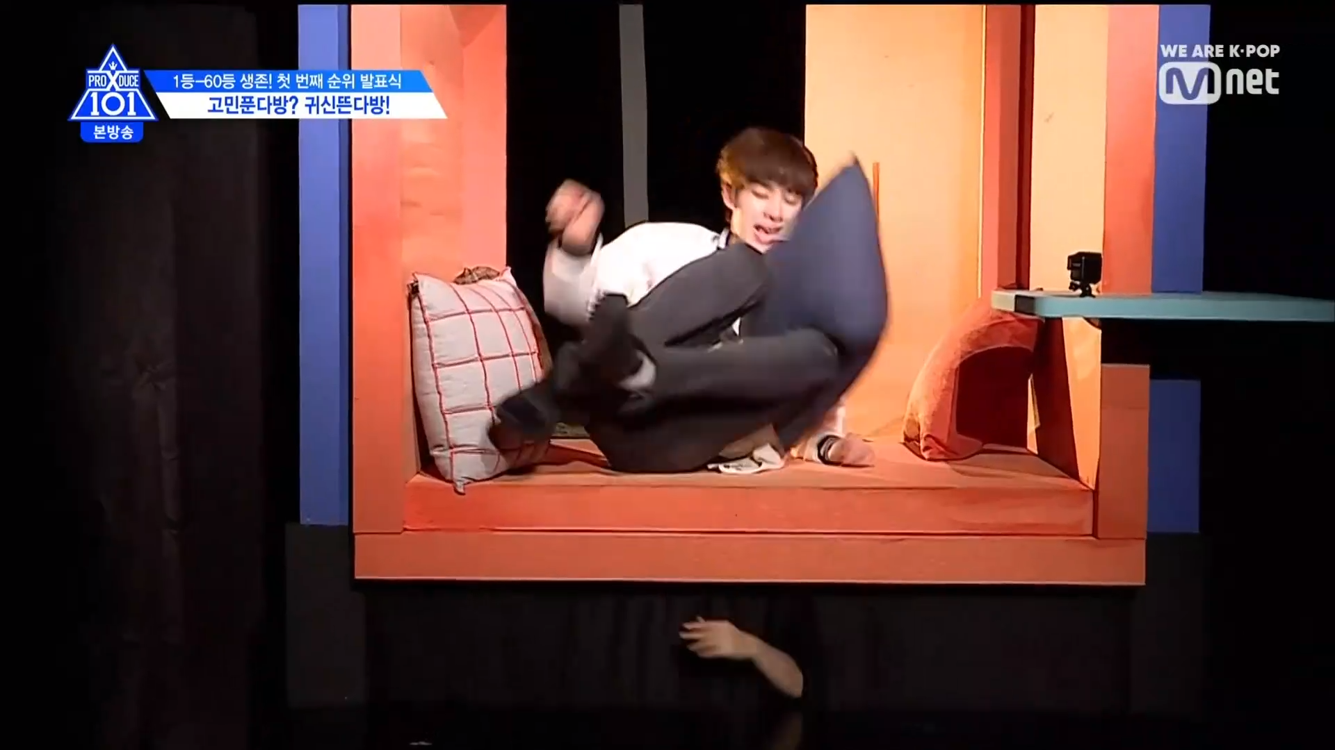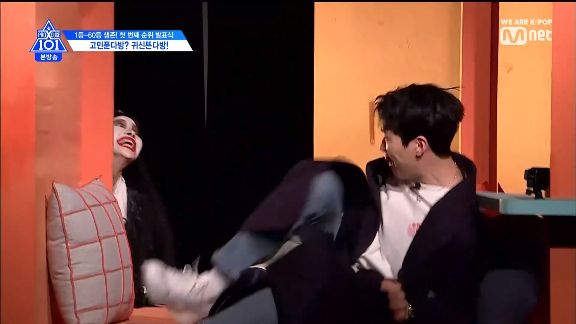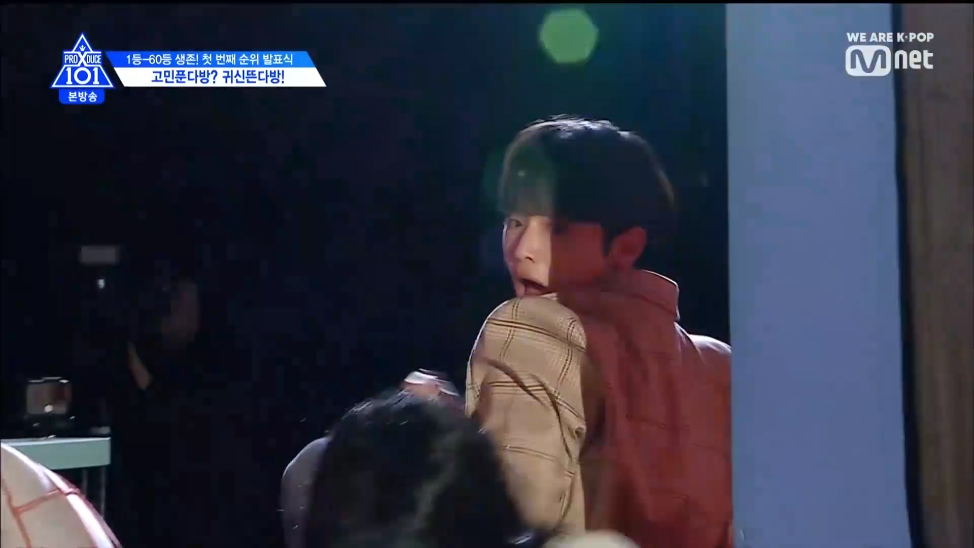 Trong khu đó học trưởng Kim Mingyu lại vô cùng bình tĩnh và lịch thiệp chào hỏi mọi người. Center Son Dong Pyo cũng vậy, thậm chí anh chàng còn tâm sự. Thậm chí anh chàng Tony còn té ngã và nằm xuống sàn bỏ chạy. Quả như mong đợi, chàng trai nam tính Han Gyul vô cùng điềm đạm và không hề sợ hãi.