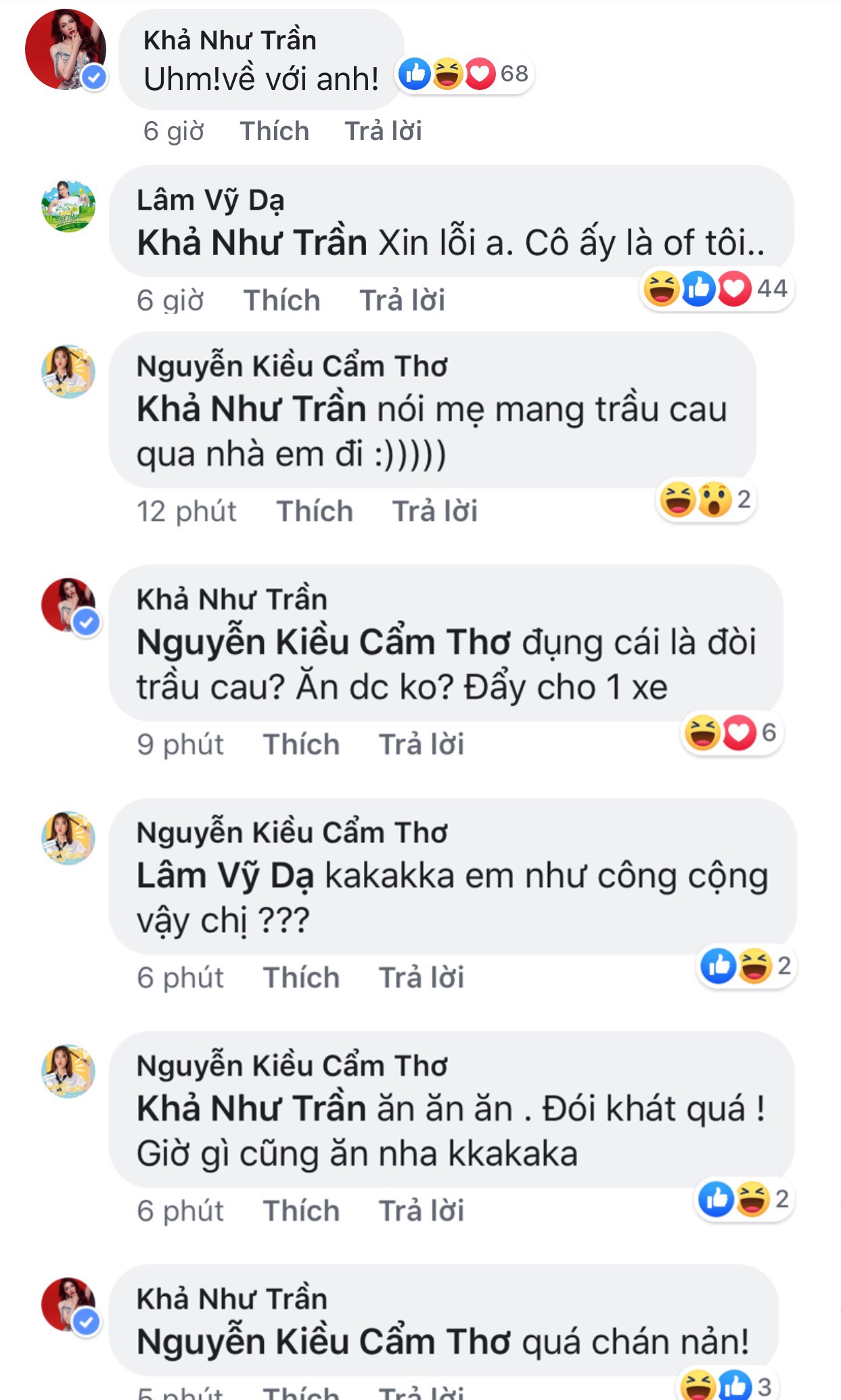 Đầu tiên có thể kể đến diễn viên Khả Như. Khả Như là một trong những đồng nghiệp thân thiết nhất với diễn viên Puka khi cả hai đang cùng cộng tác tại sân khấu kịch Thế Giới Trẻ. Nàng mèo đã an ủi Puka bằng một bình luận đậm chất 'bách hợp'. Ngay lập tức, diễn viên Lâm Vỹ Dạ khiến fans thích thú khi 'nổi máu ghen' và khẳng định Puka là của mình.