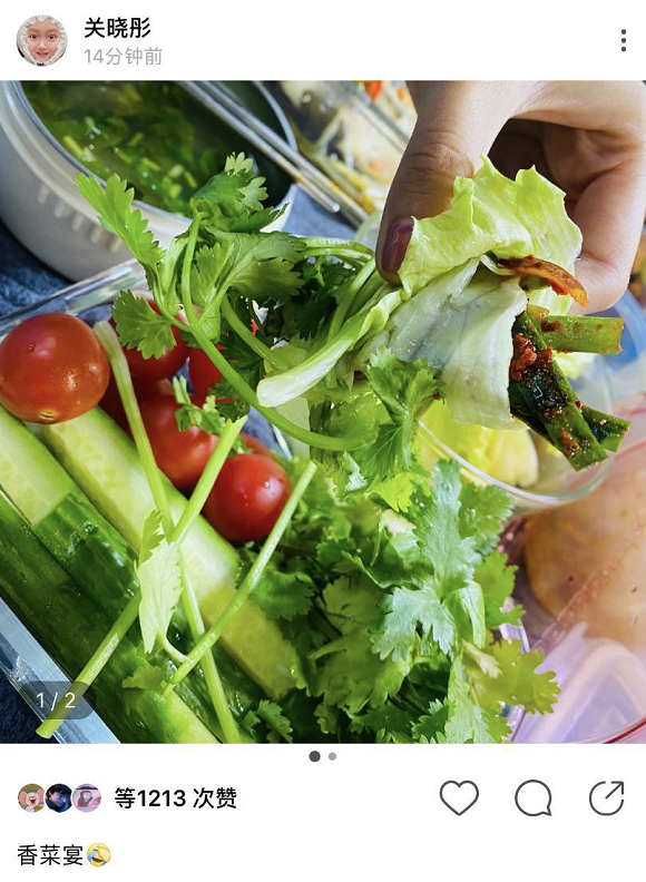 Cách đây không lâu, Quan Hiểu Đồng đã đăng tải hình ảnh về luyện tập sức khỏe. Tối ngày 13 tháng 4, cô cũng đăng lên ảnh selfie mới nhất và bữa ăn giảm cân trên mạng xã hội, đồng thời kèm lời bình: “Buổi tiệc rau mùi”. Trong bữa ăn giảm cân của Quan Hiểu Đồng có thể thấy gồm cà chua, dưa chuột, rau mùi… đều là những thức ăn chay. Fan hâm mộ rất đau lòng khi thấy thần tượng vì giảm cân mà cực khổ như vậy!