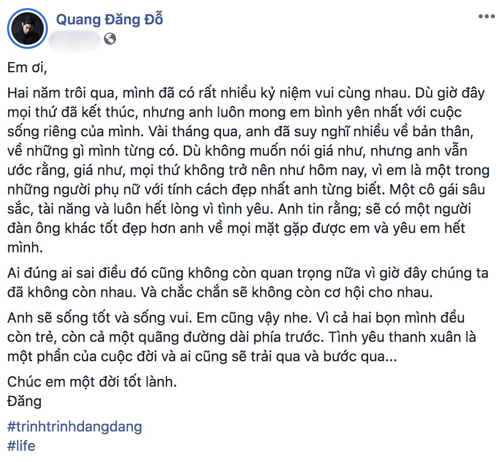 Quang Đăng cũng đã gửi tâm thư cho Thái Trinh hậu công bố chia tay.