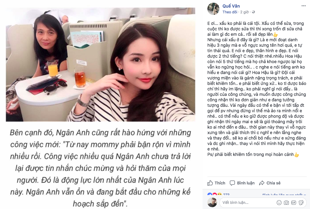 Tối 2/11, thông qua Facebook cá nhân, cựu người mẫu/ca sĩ Quế Vân bất ngờ đăng tải những nhận xét và đánh giá về Ngân Anh. Cô lên tiếng trách móc nặng nề, đồng thời góp ý về thái độ của đàn em thay vì bênh vực. Những chia sẻ này ngay lập tức thu hút đông đảo sự chú ý từ cộng đồng mạng.