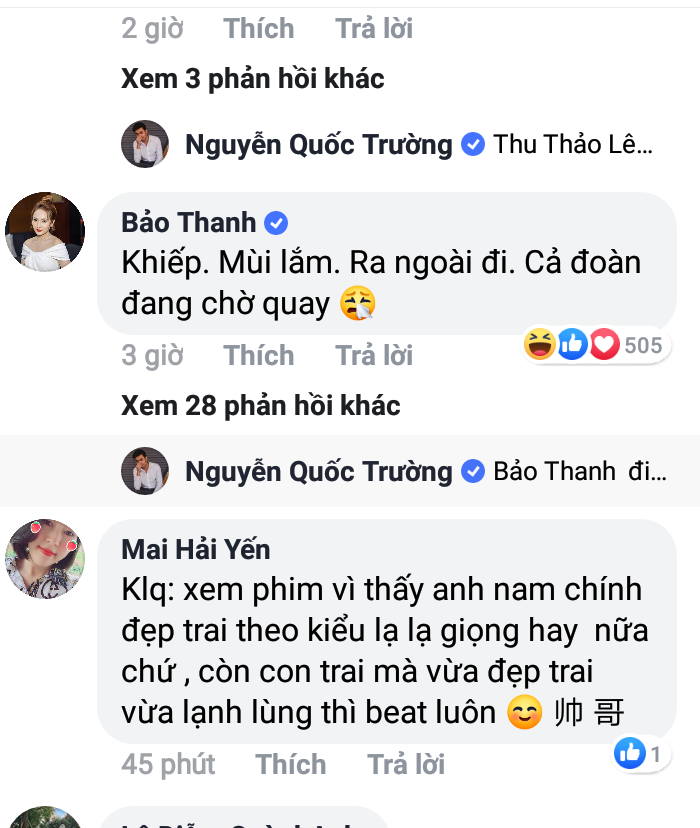 Chưa hết, cũng trong bức hình này, anh còn bị người bạn diễn của mình là nữ diễn viên Bảo Thanh 'tố giác' không thương tiếc khi cho rằng anh ở quá lâu trong toilet chỉ để selfie. Nữ diễn viên để lại dòng bình luận đầy hài hước:” Khiếp. Mùi lắm. Ra ngoài đi. Cả đoàn đang chờ quay”.