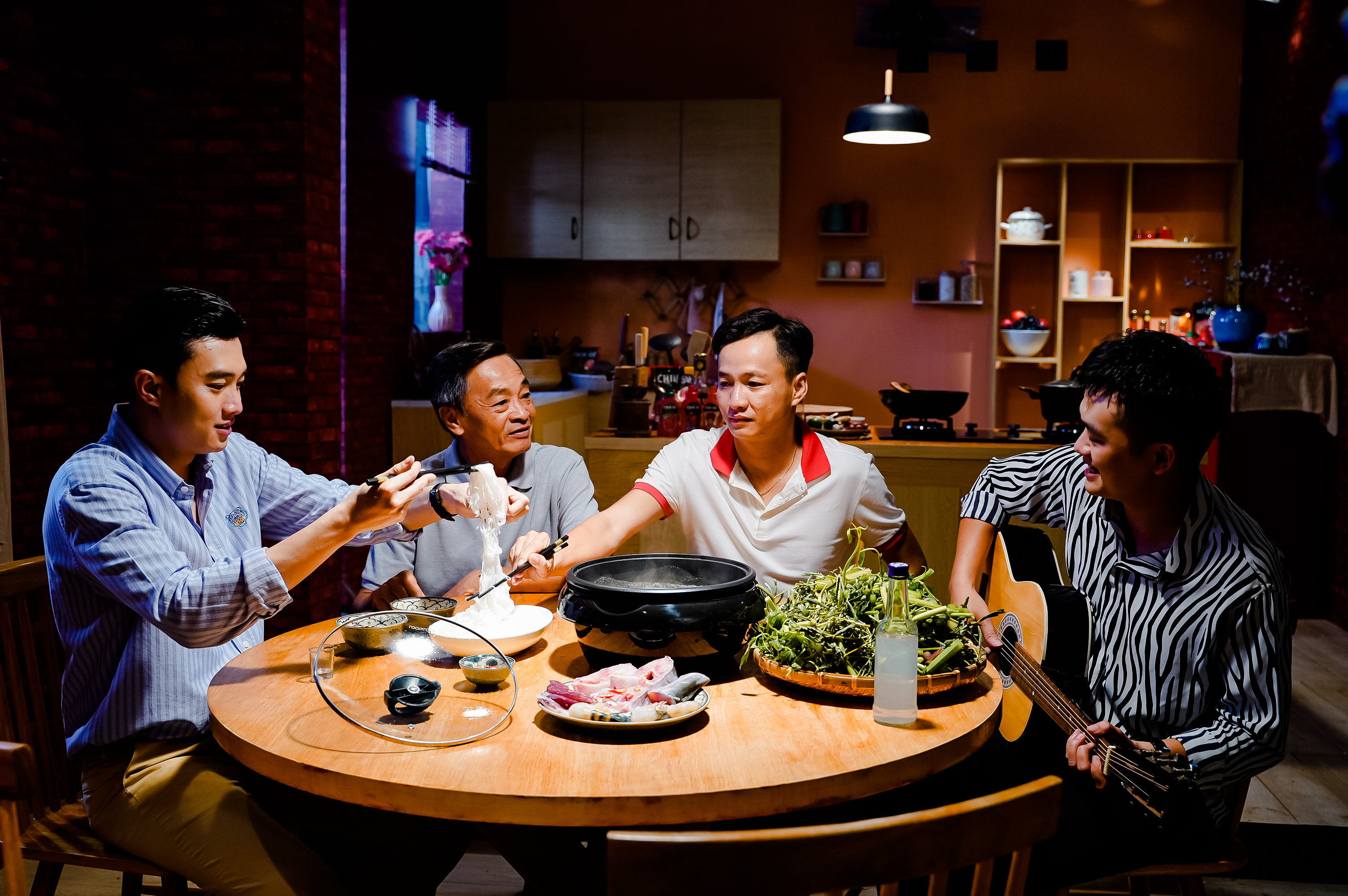 Sau khi chế biến xong phần nguyên liệu, Quốc Trường mời cha và người bạn thân từ bé thưởng thức lẩu mắm. Trong không khí họp mặt, cả nhà Quốc Trường trổ tài ngân nga vài câu hát dưới bàn tay đệm đàn của bạn Quốc Trường.