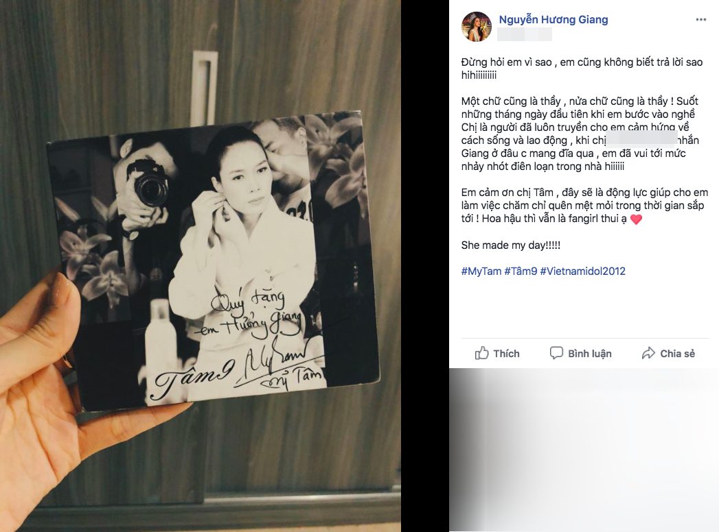 Mới đây, hoa hậu Hương Giang đã chia sẻ những hình ảnh mới nhất chụp cùng “Huyền thoại âm nhạc châu Á” - Mỹ Tâm. Cô nàng hóm hỉnh nhận mình là “fangirl” và gọi Mỹ Tâm là “chị trợ lý” - vai diễn màn ảnh rộng đầu tiên đạt được không ít thành công của “họa mi tóc nâu”. Tuy nhiên, đây không phải là lần đầu tiên Hương Giang để lộ “bản chất” fangirl trước đàn chị Mỹ Tâm ngay từ khi bắt đầu sự nghiệp.