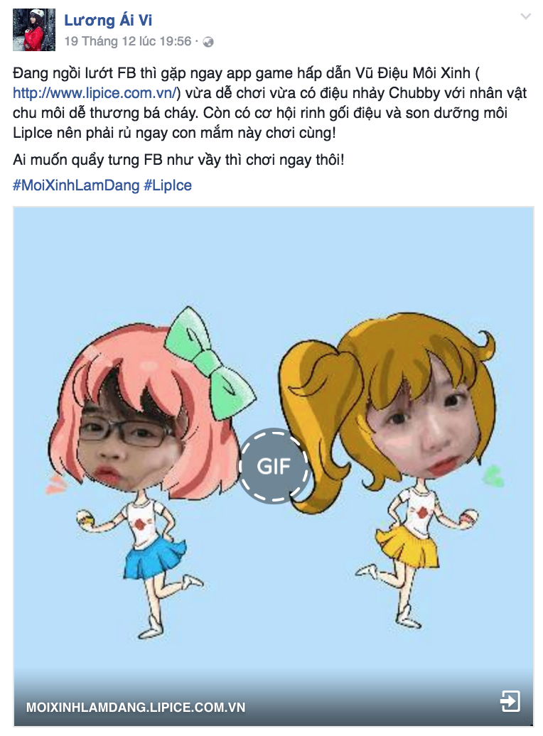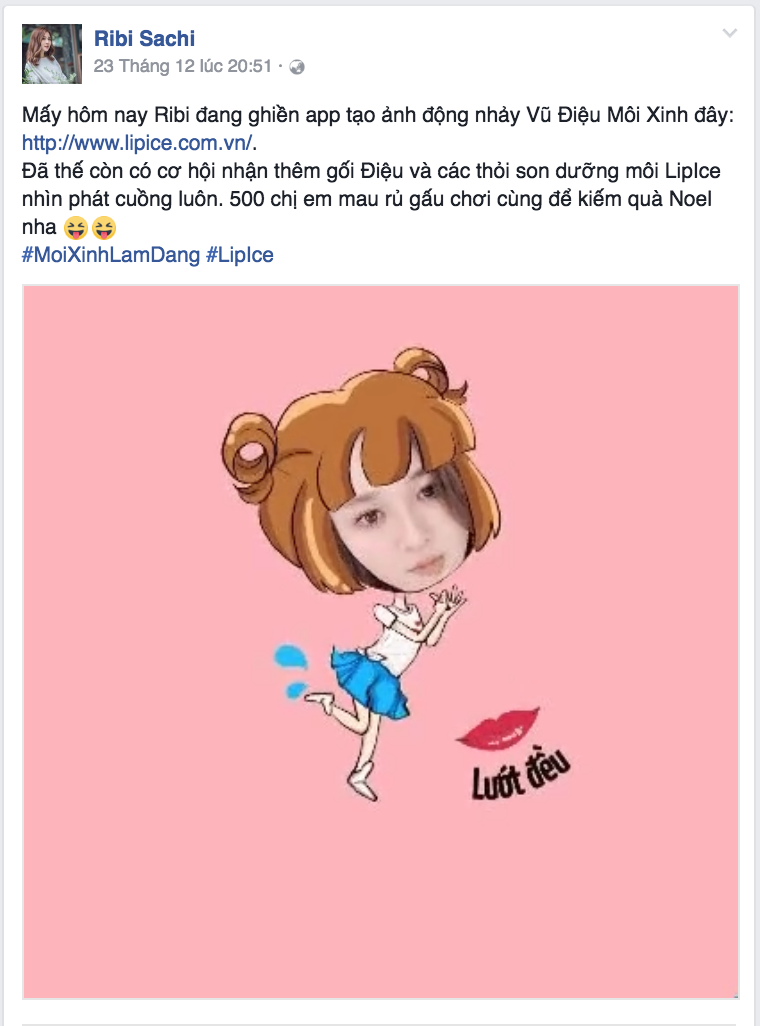 Không chỉ vậy, khi chia sẻ ảnh động này lên trang facebook cá nhân cùng hashtag #MoiXinhLamDang #LipIce, và kêu gọi bạn bè bình chọn bài dự thi của bạn là đã có cơ hội nhận các phần quà cực hấp dẫn từ LipIce đó!