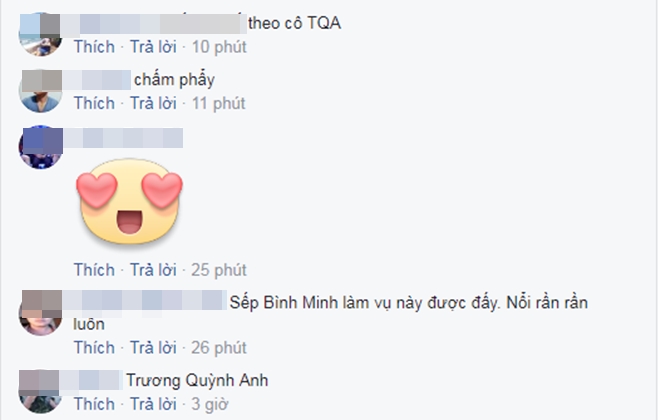 Trang cá nhân với hơn 830.000 lượt theo dõi của Trương Quỳnh Anh hiện tràn ngập các bình luận bằng hình ảnh cô thân mật bên nam diễn viên Bình Minh. Bên cạnh lời công kích cá nhân, nhiều fan cũng đặt câu hỏi về tình trạng hôn nhân hiện tại của cả hai.