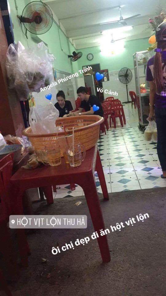 Mới đây, người hâm mộ còn tình cờ bắt gặp cặp đôi đang đi hẹn hò với nhau sau khi trở về từ chuyến du lịch ở Đà Nẵng. Không chỉ cùng dùng bữa tối tại một nhà hàng sang trọng, Angela Phương Trinh và Võ Cảnh còn bị bắt gặp mặc áo đôi, đi ăn hột vịt lộn giản dị.