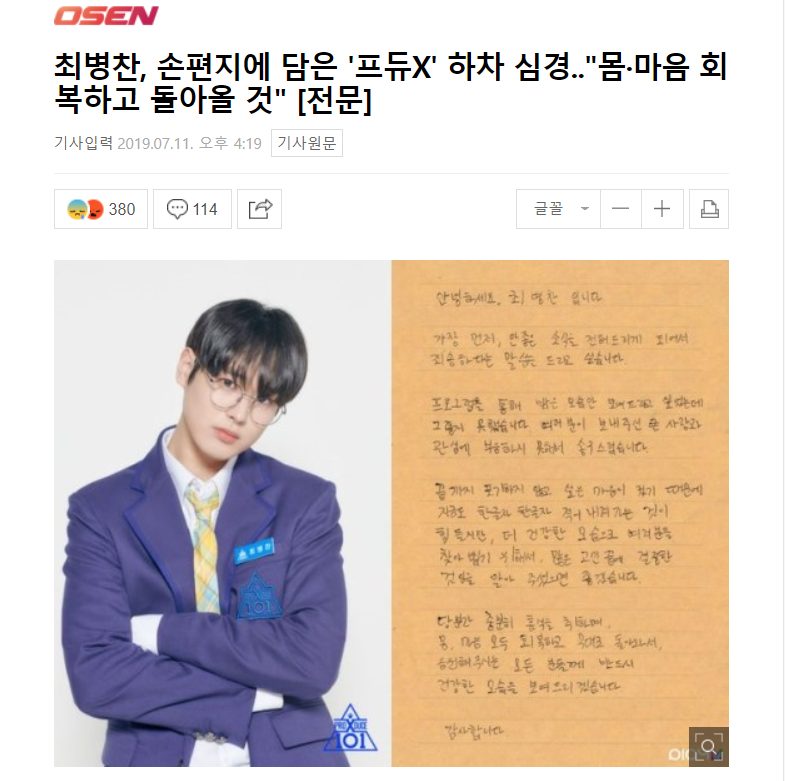 Vào chiều ngày 11/07, thông báo về việc thực tập sinh Choi Byung Chan đột ngột rời khỏi Produce X 101 đài Mnet đã khiến cho không ít người hâm mộ, những người yêu mến cậu và chương trình phải bàng hoàng. Được biết, chàng ca sĩ thuộc nhóm Victon đã chia sẽ một bức thư tay gửi đến khán giả để nói lời xin lỗi.