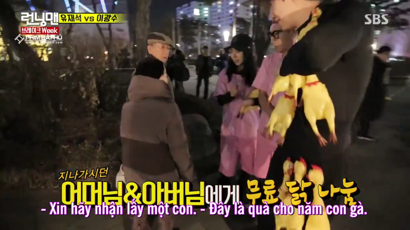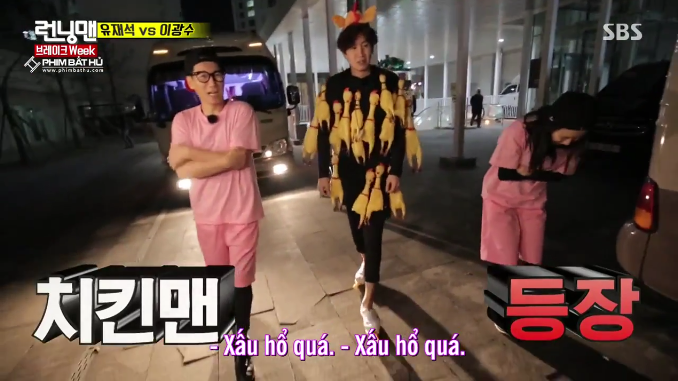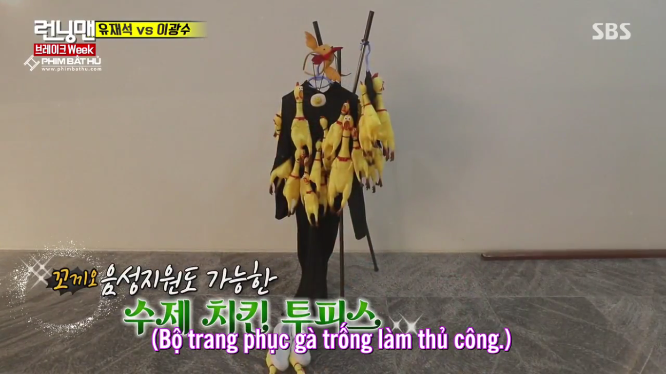 Trong tập “thư giãn” mới nhất của Running Man, các thành viên đã có 1 ngày vui chơi trong phòng tắm hơi để lấy lại năng lượng sau nhiều tuần chạy cùng “Tuần lễ thành viên Running Man” trước đó. Tuy nhiên, trong khi các bạn của mình đang “xả hơi” thì 2 thành viên Kwang Soo và Jae Suk phải thực hiện nhiệm vụ bí mật trộm quần áo của các thành viên khác. Và với sự ủng hộ của “thần xui xẻo” Lee Kwang Soo đã không thành công khi bị các thành viên còn lại phát hiện ra. Hình phạt dành cho anh chàng là phải mặc bộ tranh phục độc đáo làm từ những con gà để trở về nhà bằng tàu điện ngầm. Anh chàng nhanh chóng thu hút sự hiếu kì từ người dân, khi họ dành nhau lấy những con gà trên người Kwang Soo đầy thích thú và vui vẻ.