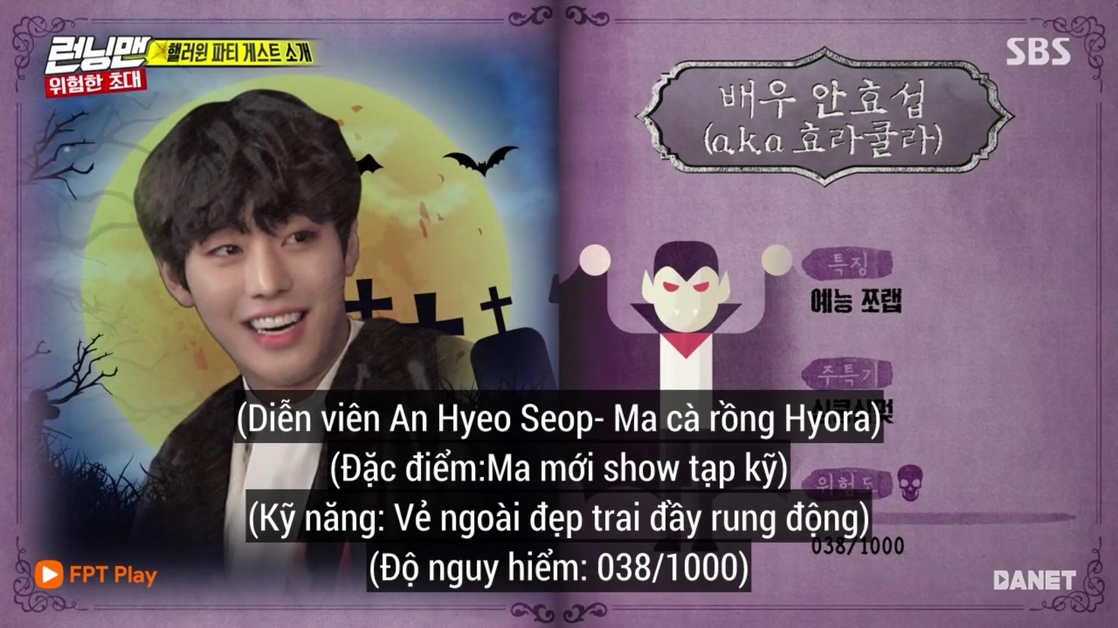 Tập 424 Running Man - Ác mộng Halloween có chủ đề liên quan đến lễ hội hóa trang lớn nhất trong năm. 8 thành viên đội Running Man xuất hiện trong bộ đồ hóa trang thành các nhân vật kinh dị nổi tiếng. Trong đó, nhân vật khách mời nổi tiếng được giới thiệu là bộ 3 ca sĩ - diễn viên nổi tiếng Ahn Hyo Seop, Son Na Eun và Seo Young Hee.