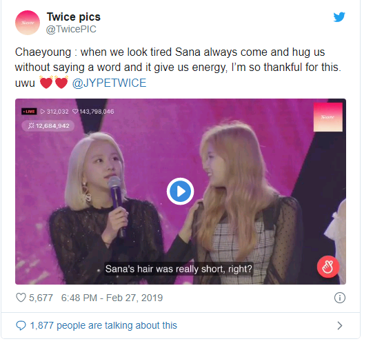 Trong buổi ra mắt FANCY, mỗi thành viên lần lượt nói về những gì họ thấy biết ơn của người đứng cạnh mình. Vậy là Chaeyoung đã thật thà tiết lộ cách an ủi đặc biệt của Sana mỗi khi trông thấy có ai buồn bã hoặc mệt mỏi. Cô nàng sẽ lại gần và ôm họ nhưng không nói lời nào. Nhờ hành động đơn giản này, các thành viên trở nên tràn đầy năng lượng. Bởi dù chỉ là sự an ủi nhỏ nhoi, nhưng nó khiến người nhận lẫn các fan hiểu được Sana yêu quý mọi người đến mức nào.