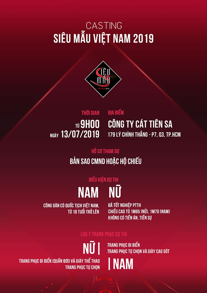 Siêu mẫu Việt Nam 2019 đã chính thức quay trở lại với format đang được khán giả mong chờ, đặc biệt thu hút được sự quan tâm của đông đảo các bạn trẻ đam mê nghề mẫu trên khắp cả nước. Buổi tuyển sinh trực tiếp sắp được diễn ra vào 13/7 tới tại khu vực TP. HCM.